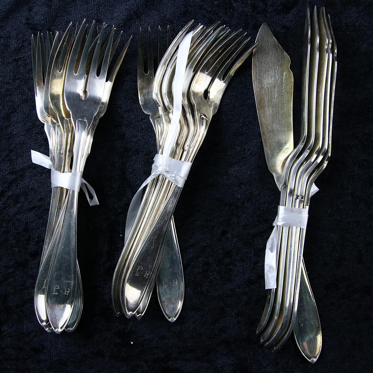 15 Fischmesser, 20 cm, Monogramm AJ 15 Fischgabeln, 18 cm, Monogramm AJ 12 Menügabeln, 22 cm 12 Menümesser, 24 cm 12 Menülöffel, 21 cm 11 Dessertlöffel, 18,5 cm, Monogramm HP.
