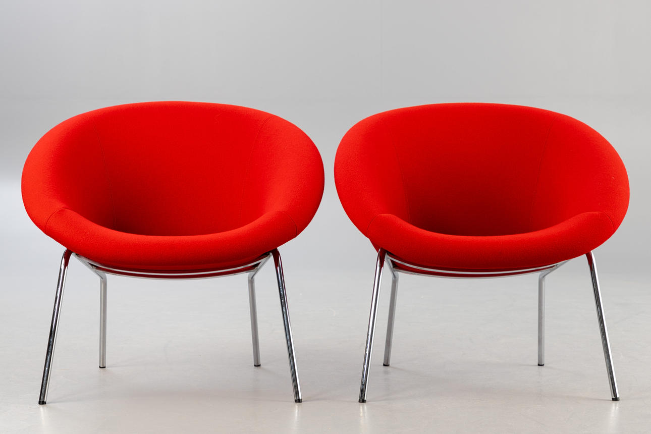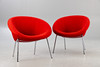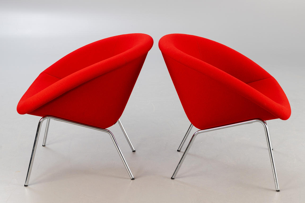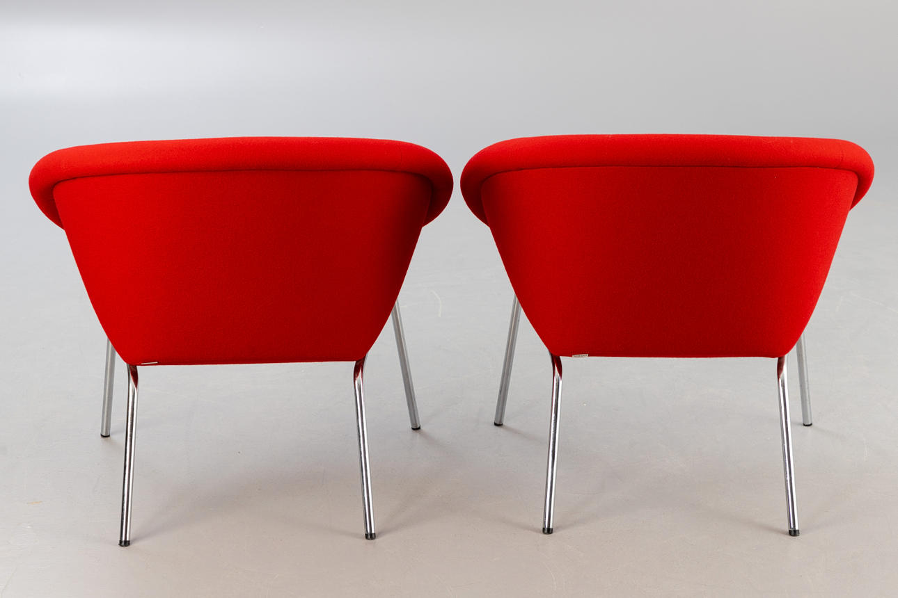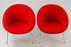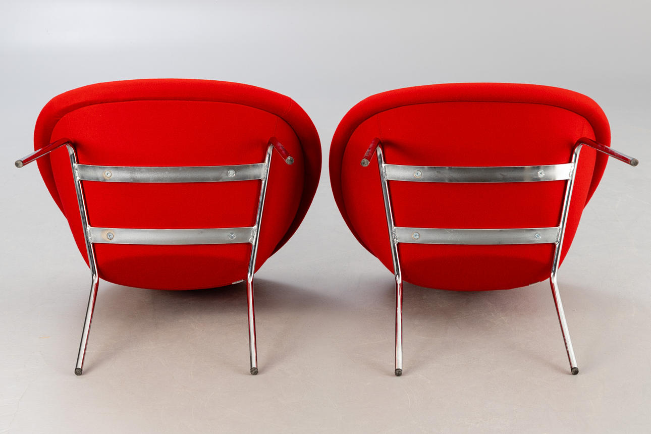 Paar Sessel Modell 'Classic Edition 369' von Walter Knoll für Knoll. Entwurf: 1956. Aufgepolsterte Sitzschale, mit rotem Wollstoff bezogen. Beine aus verchtromten Stahl. Mit Etikett bezeichnet.