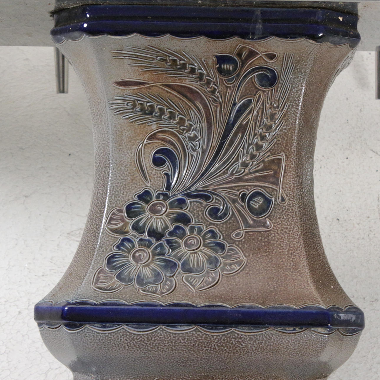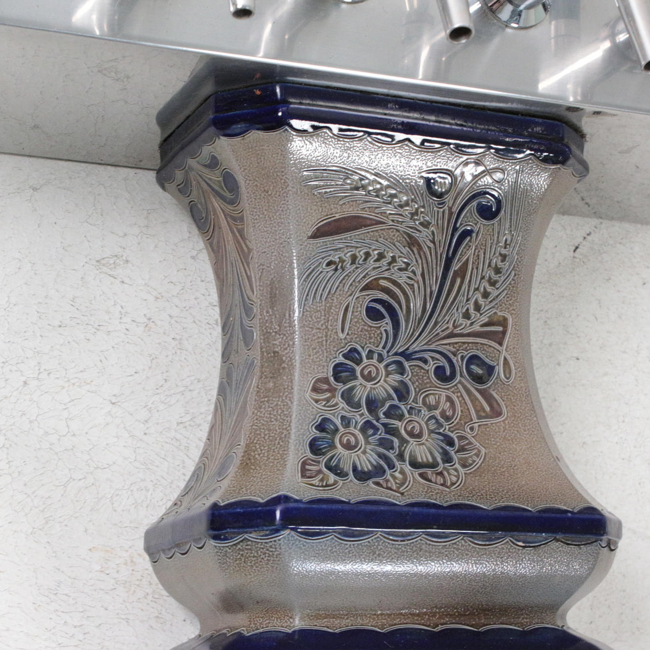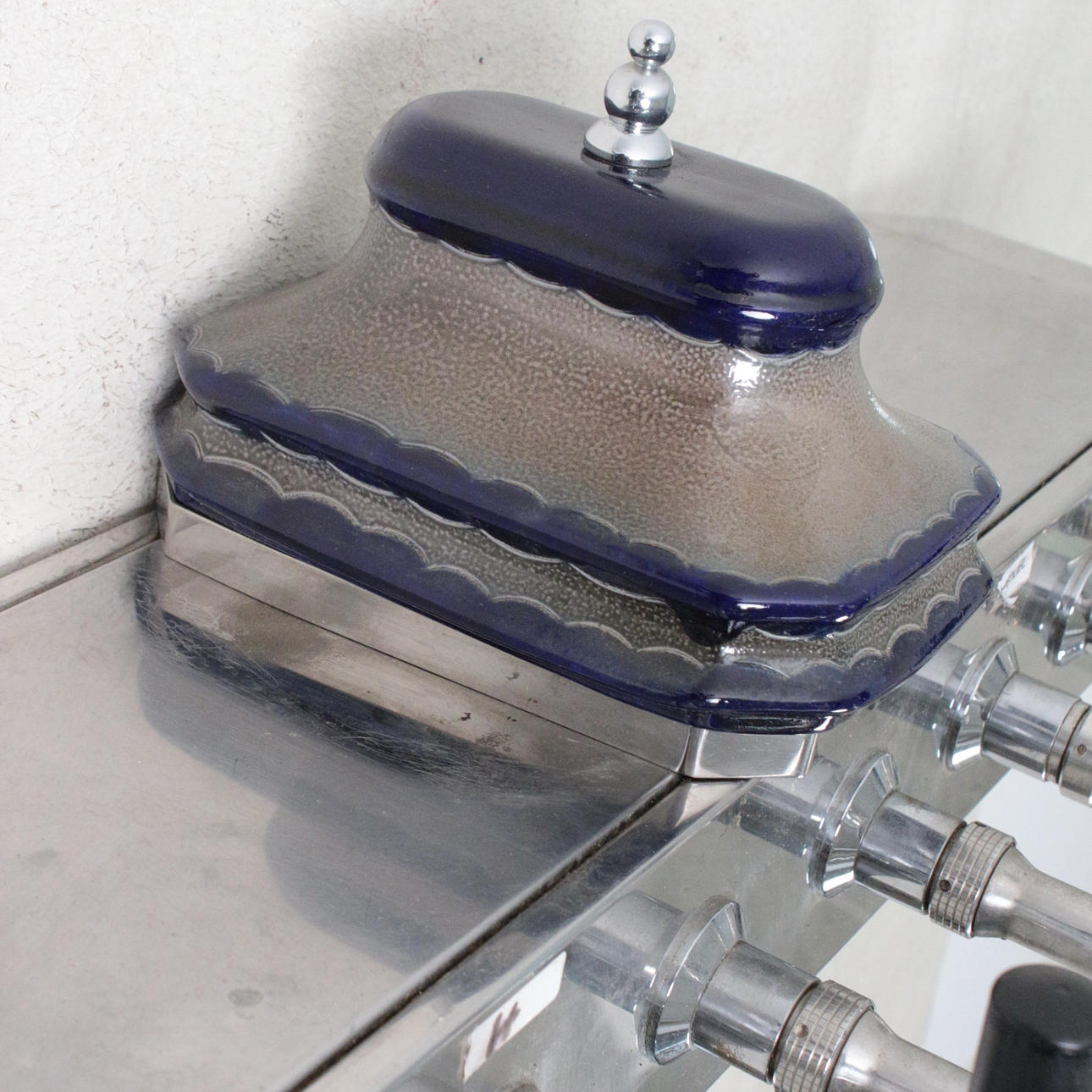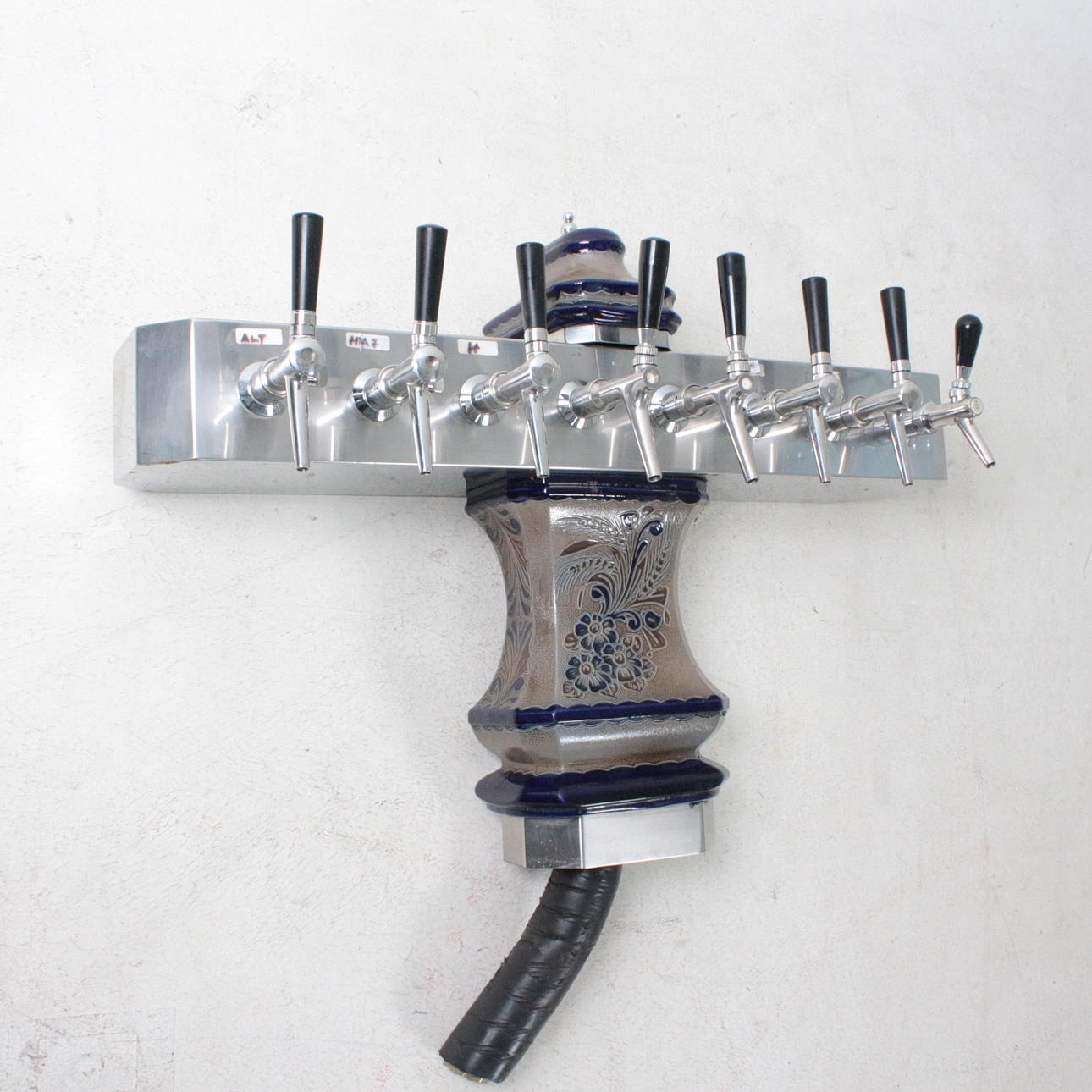Zapfanlage / Zapfstation, ausgestattet mit 8 Zapfhähnen, Metall, Keramik, Maße ca.: H. 67 cm, B. 90 cm, T. 35 cm.