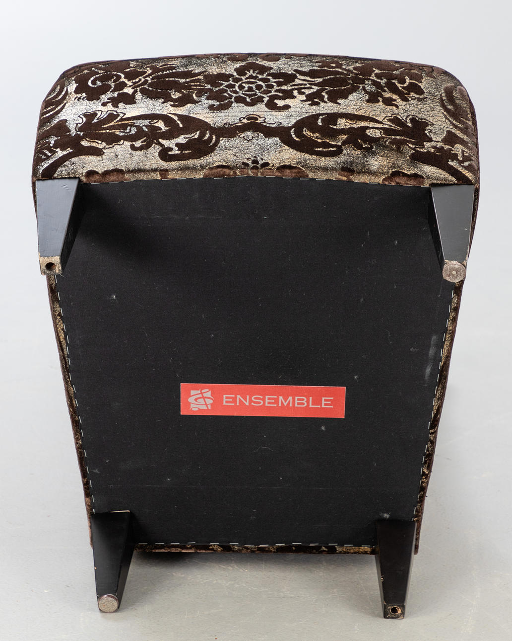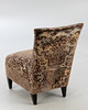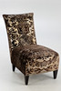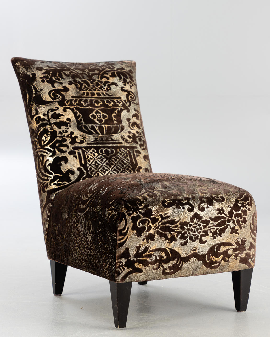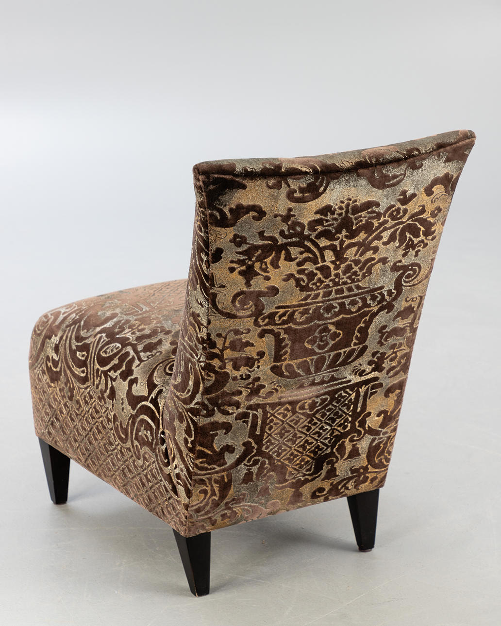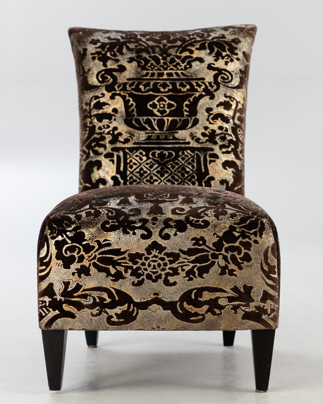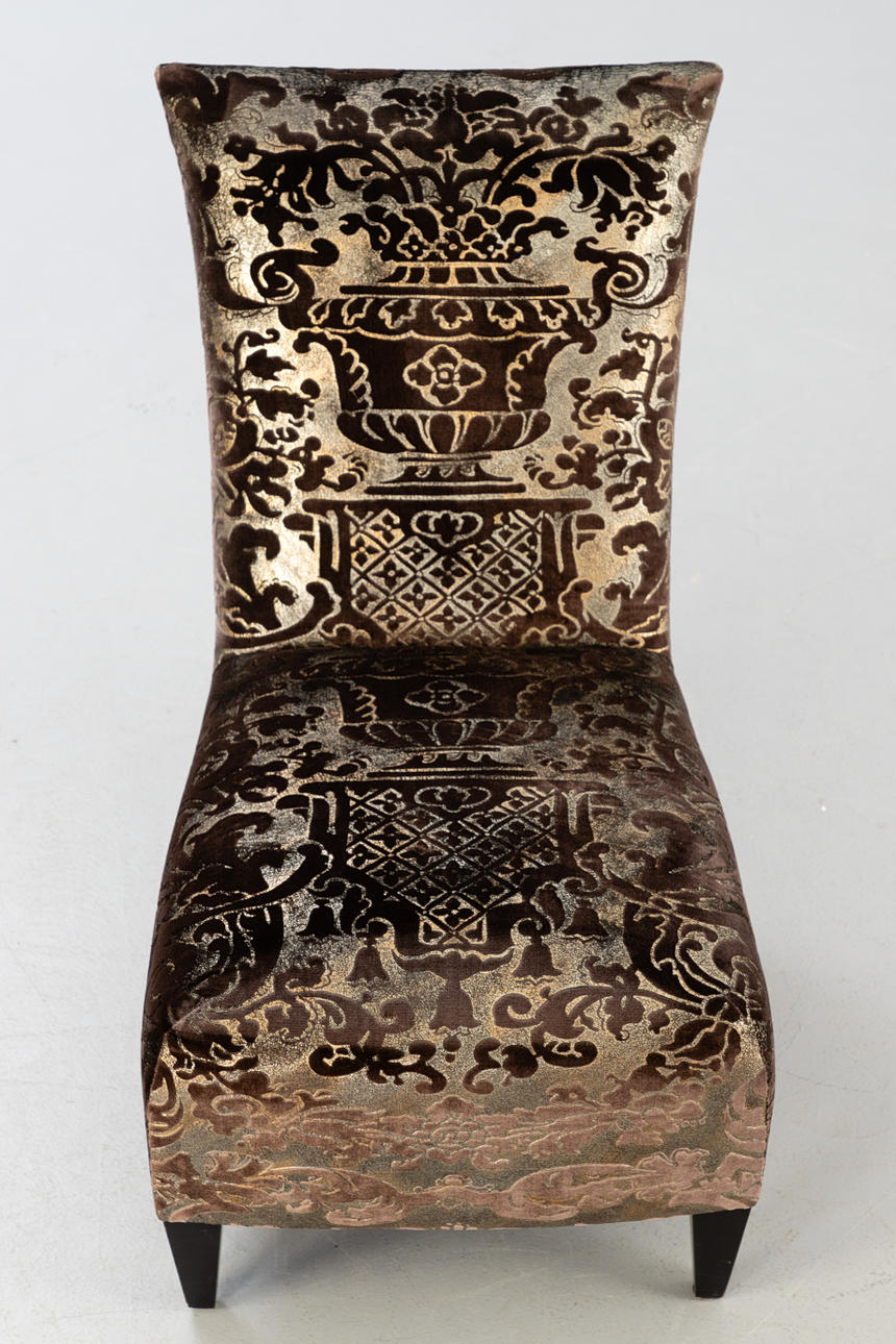 Chaiselounge Sessel ohne Armlehnen. Bezug aus Seide mit Jacquard Muster. Füße aus Holz.