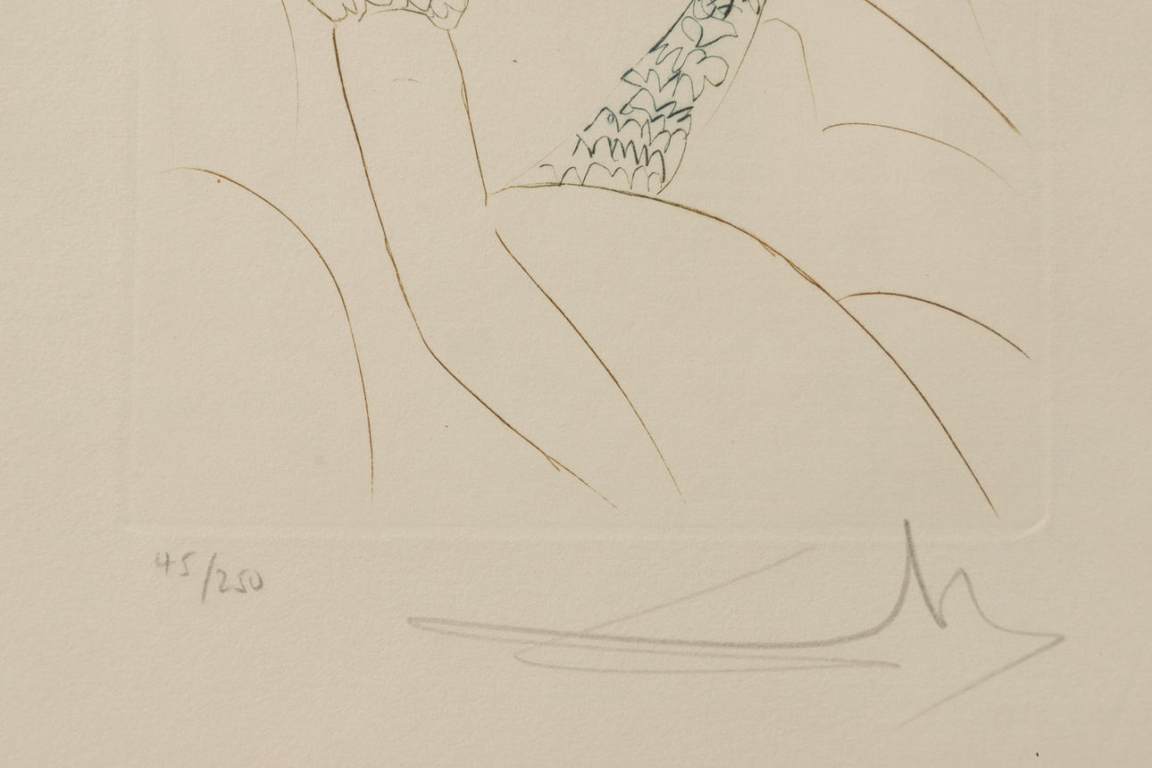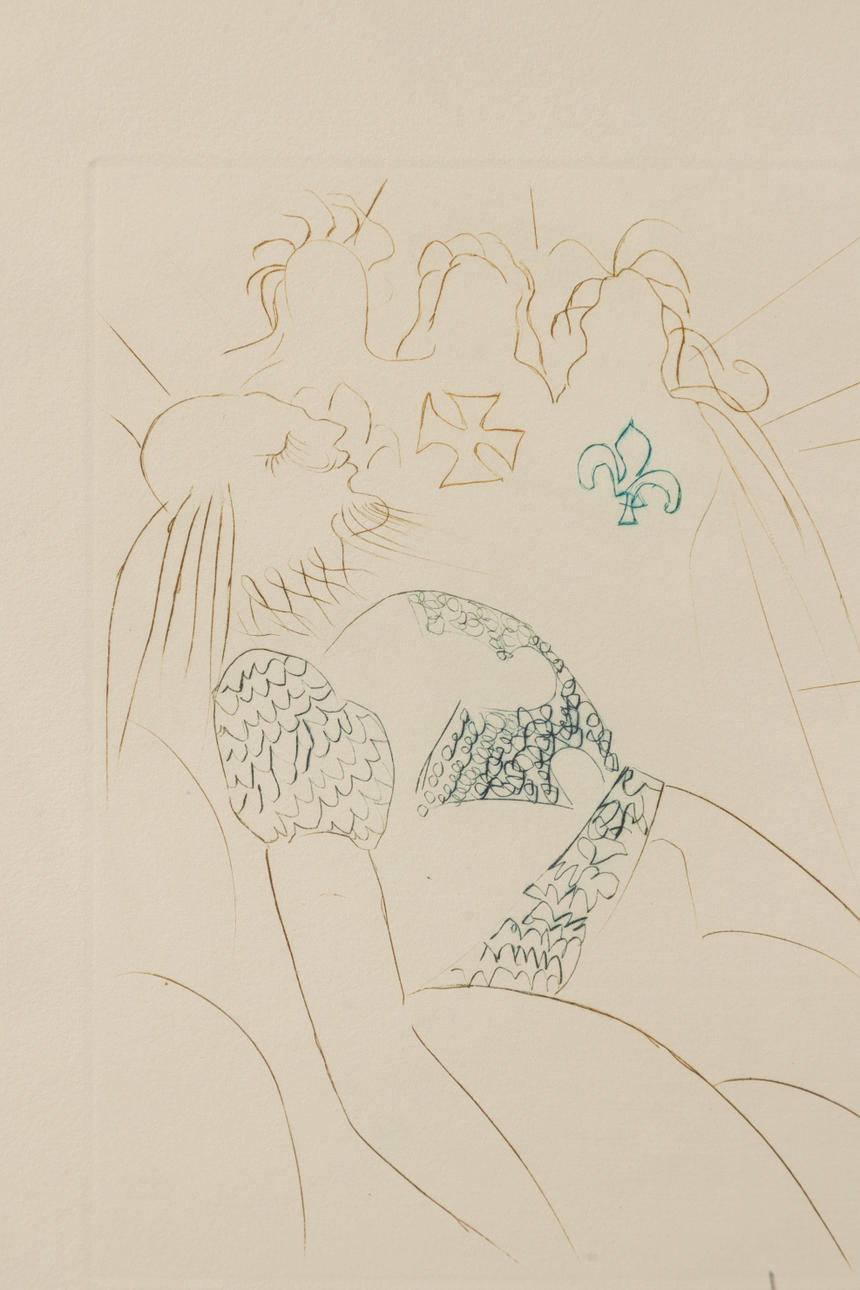 Salvador Dali (1904-1989), Henry VI, Farbige Kaltnadelradierung, aus der Folge 'Much Ado Aout Shakespere', 1970, Michler/Löpsinger 392, signiert und nummeriert, Exemplar 45/250, ca. 17 x 12 cm, hinter Passepartout und Glas gerahmt, mit Rahmen ca. 59 x 53 cm.