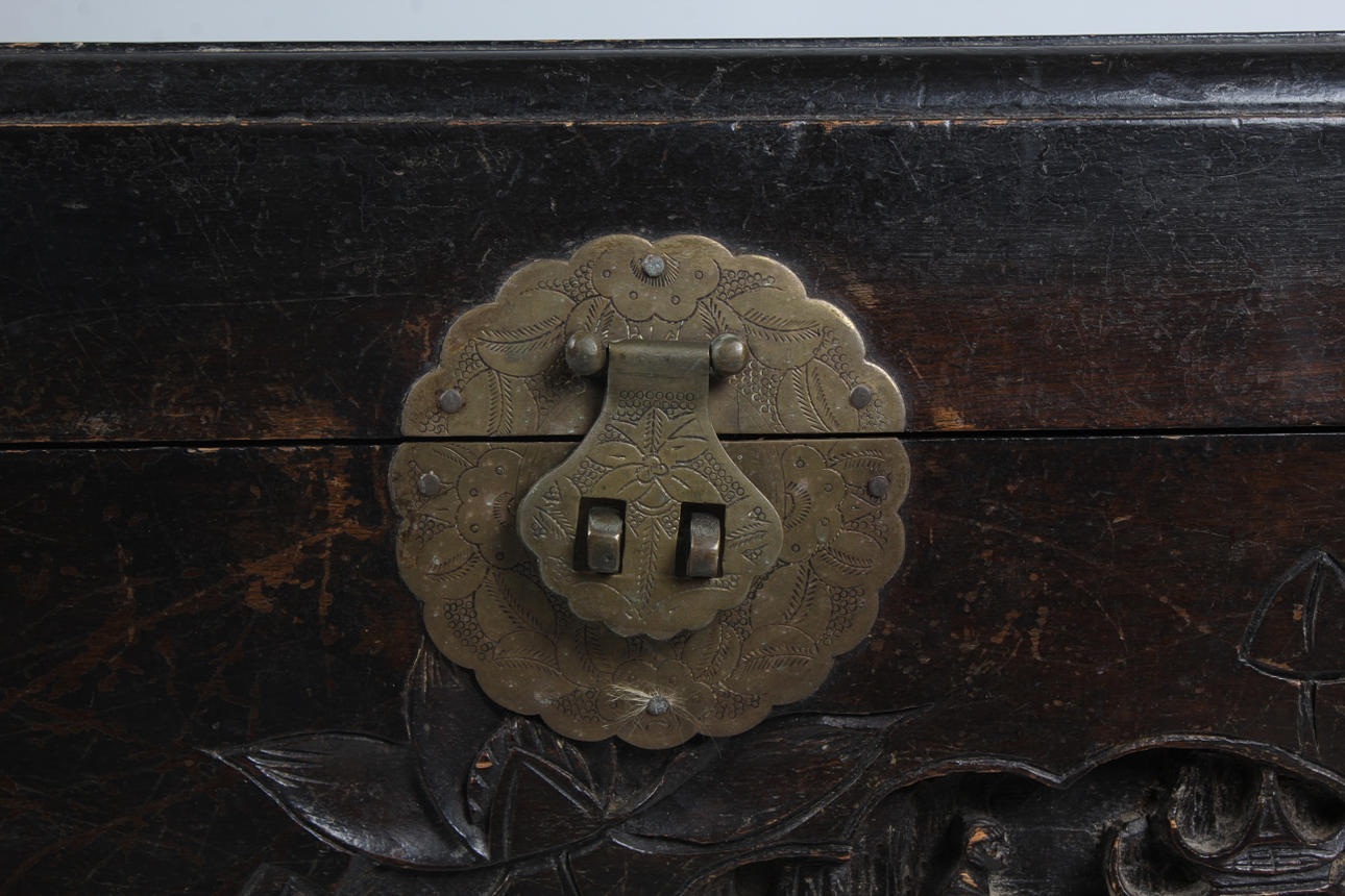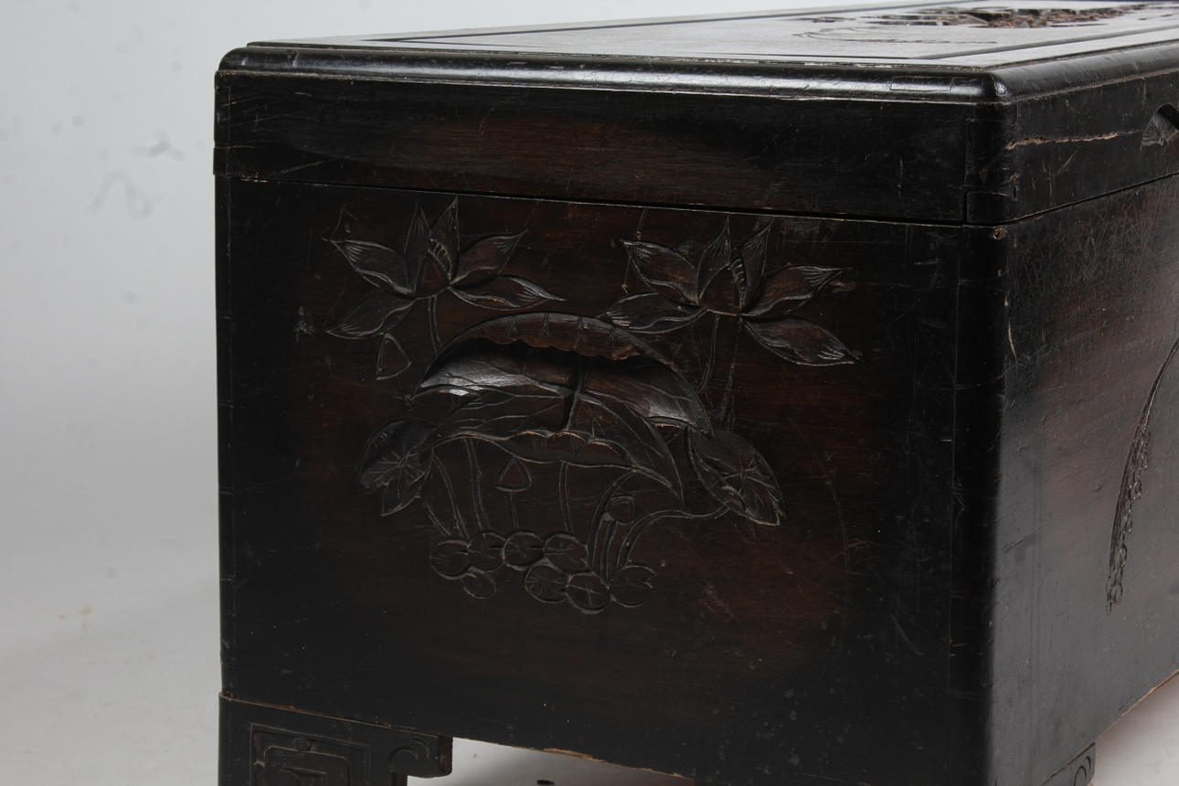 Chinesische Truhe aus Kampferholz, 20. Jahrhundert, geschnitzt mit Figuren, Pagoden und Blumen, 119 cm lang, 52 cm hoch, 50 cm tief.