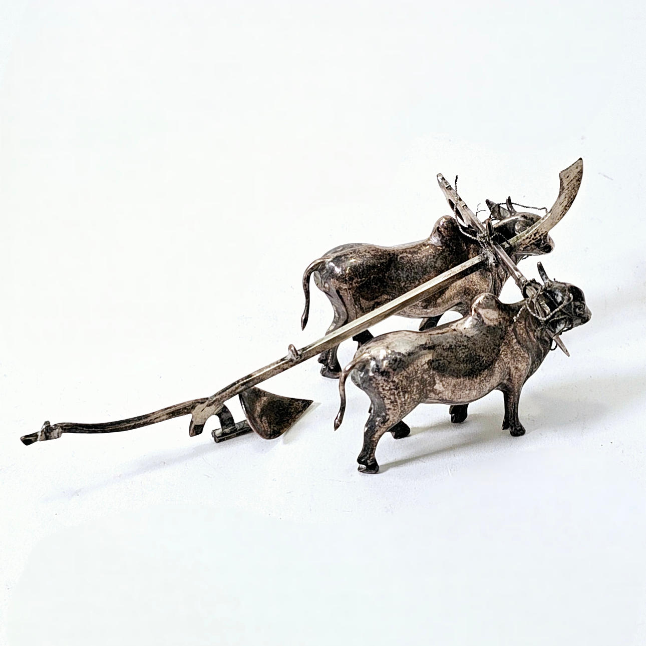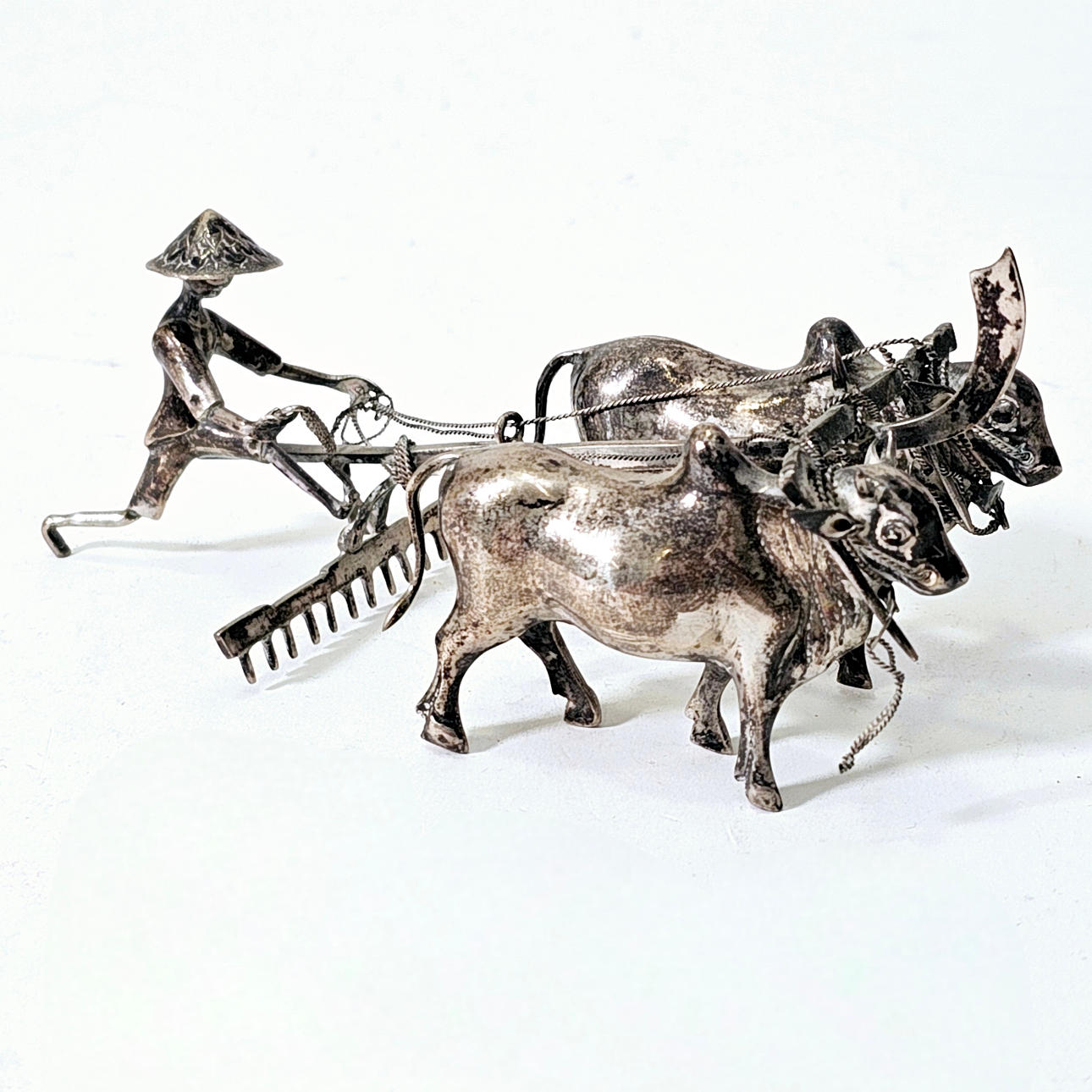 BAUER UND OCHSEN MIT PFLUG. IN BALINESISCHEM SILBER.