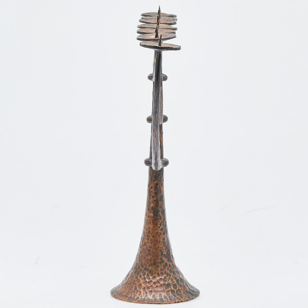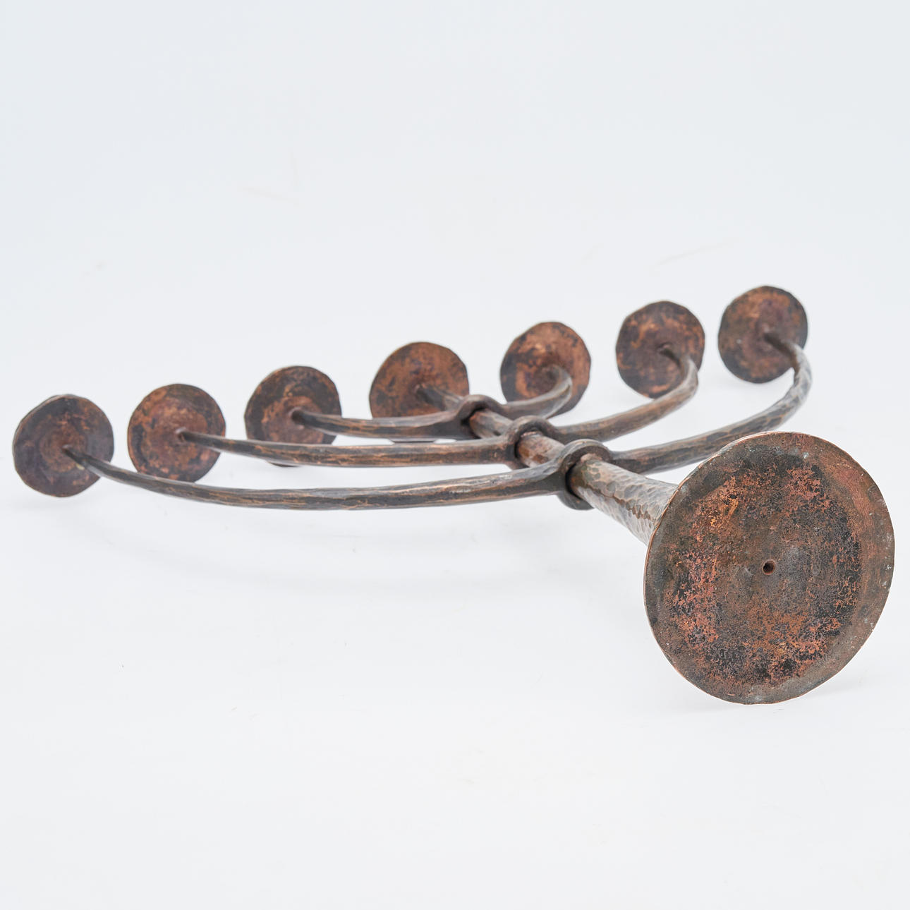 Menorah / Kandelaber, Bronze. Siebenarmiger Kerzenleuchter aus massiver Bronze mit dornenförmigen Kerzenhaltern, H.36cm, L.41,5cm, B.10cm.