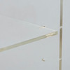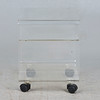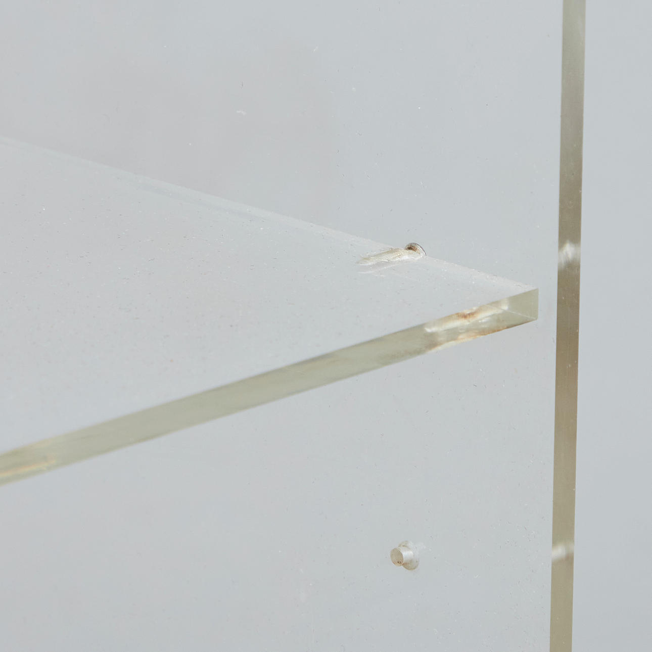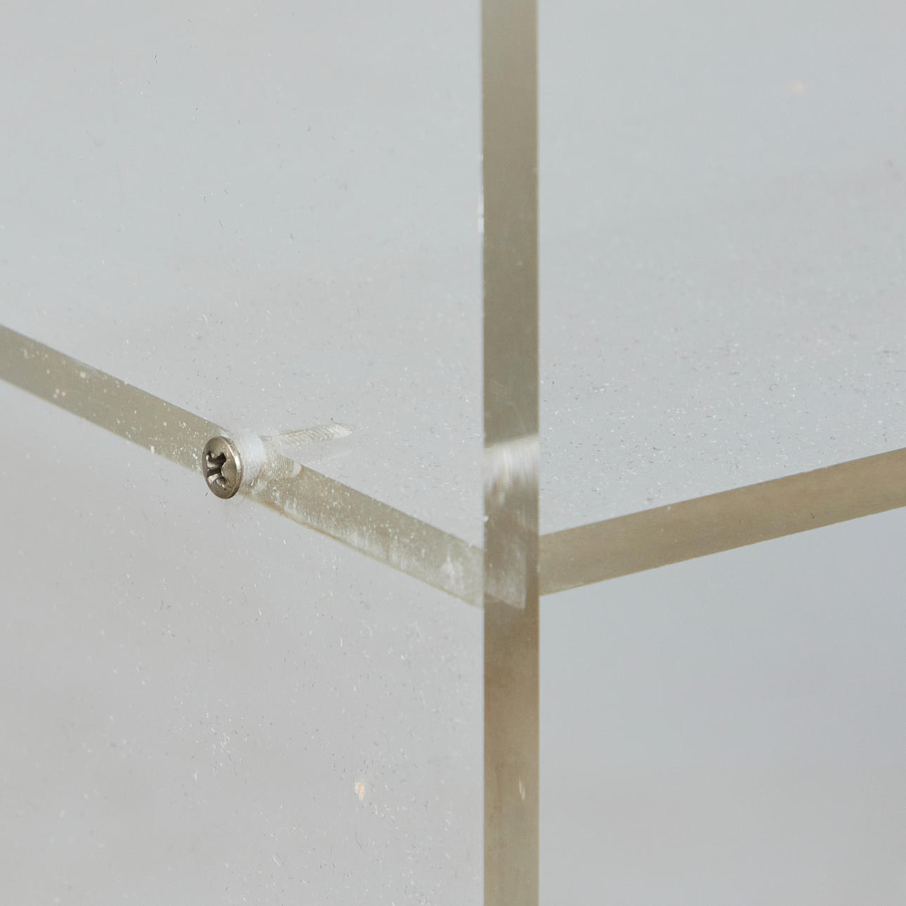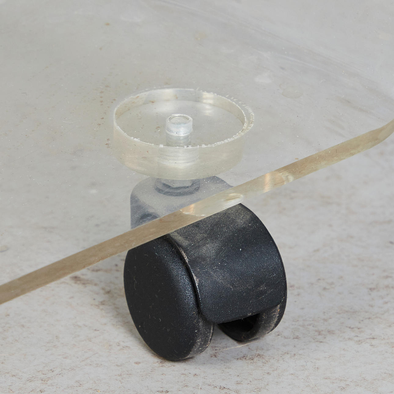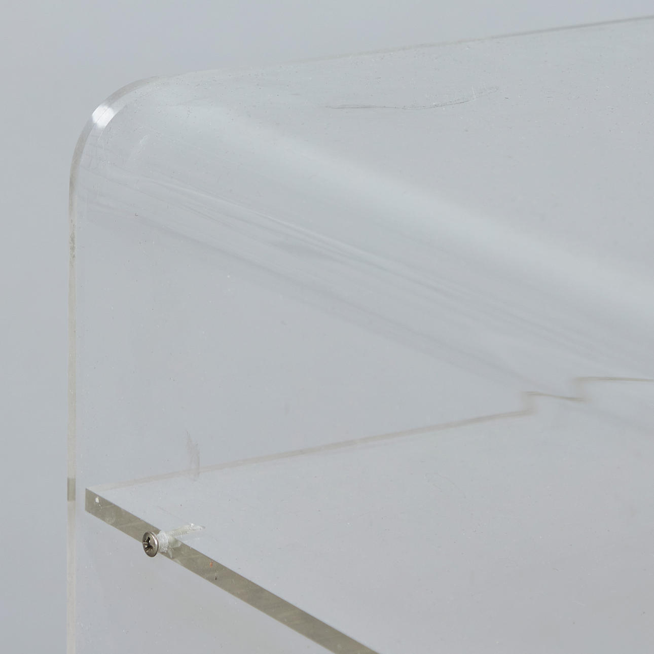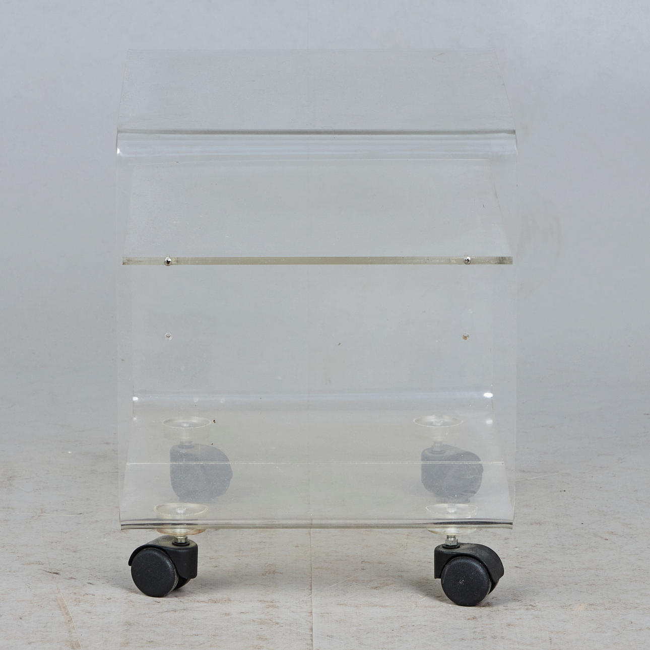 Rollwagen / Beistellwagen, Acryl, Kunststoff. Kubusförmige Konstruktion aus transparentem Acryglas mit zwei Ablagen und vier Rollen aus schwarzem Kunststoff, H.49cm, L.50,5cm, B.50cm.