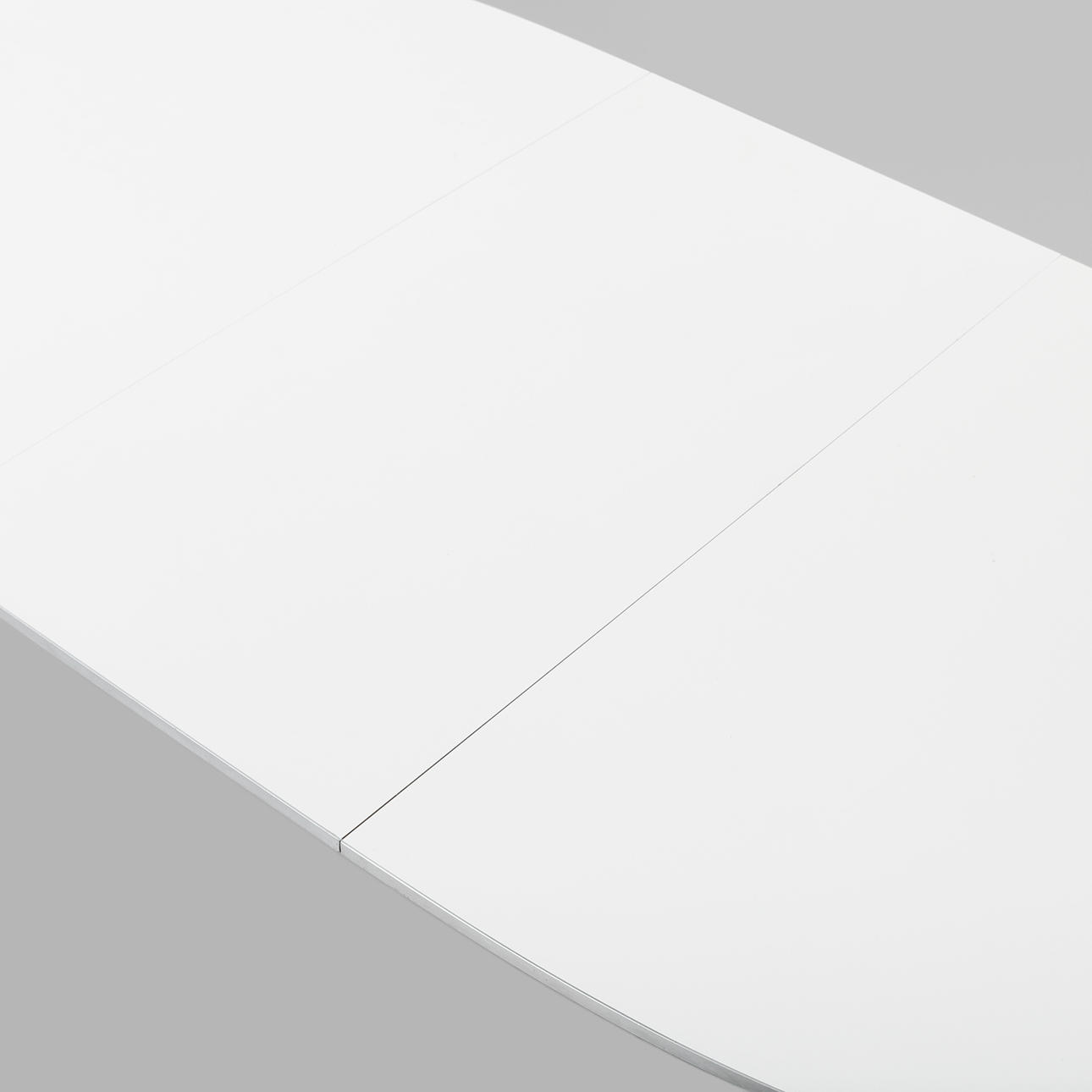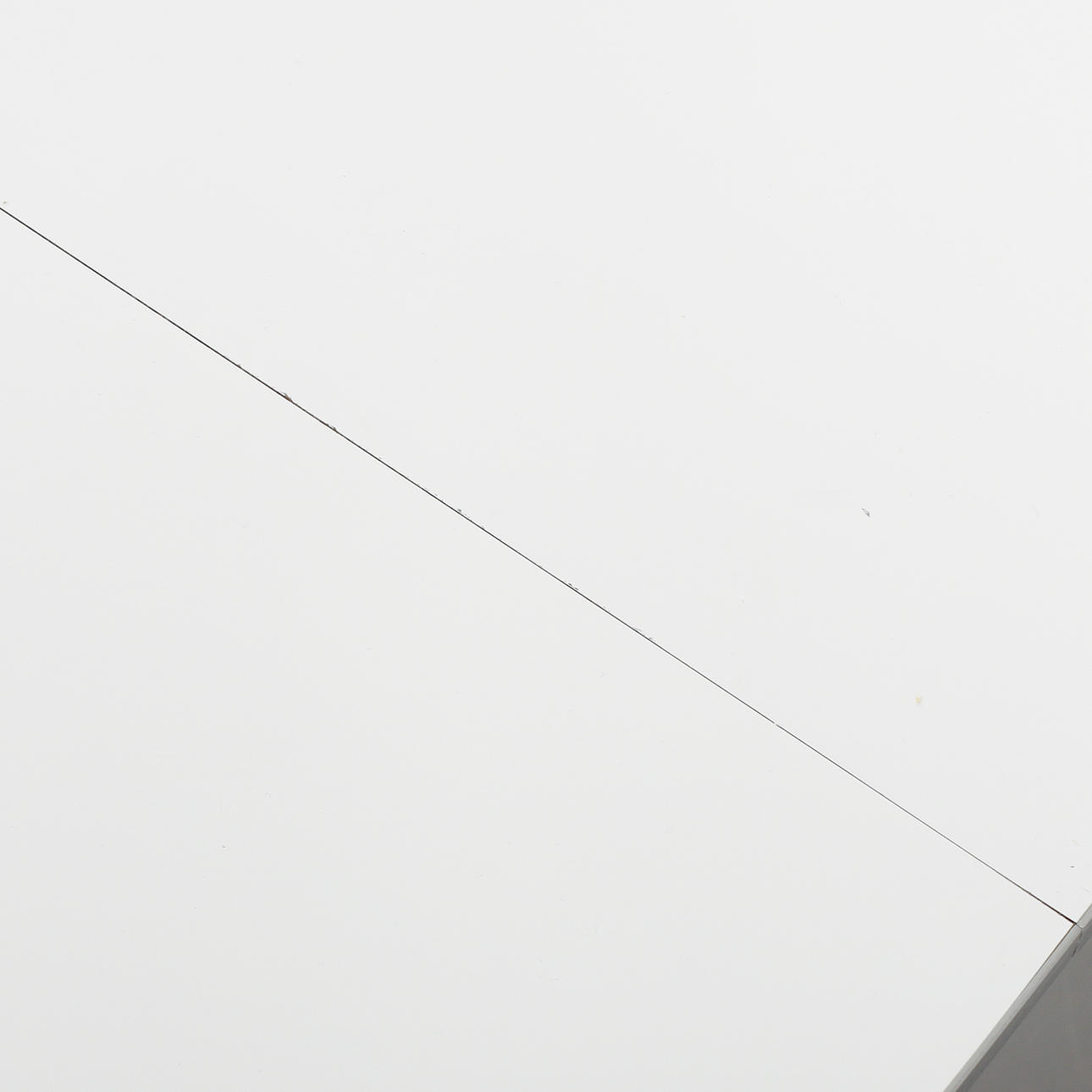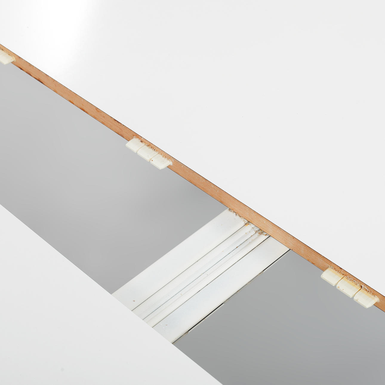 Platte aus weißem Laminat, Rand aus Aluminium. Länge ca. 150 (+1 Einsatz, 50 cm) Breite ca. 100, Höhe ca. 71 cm.