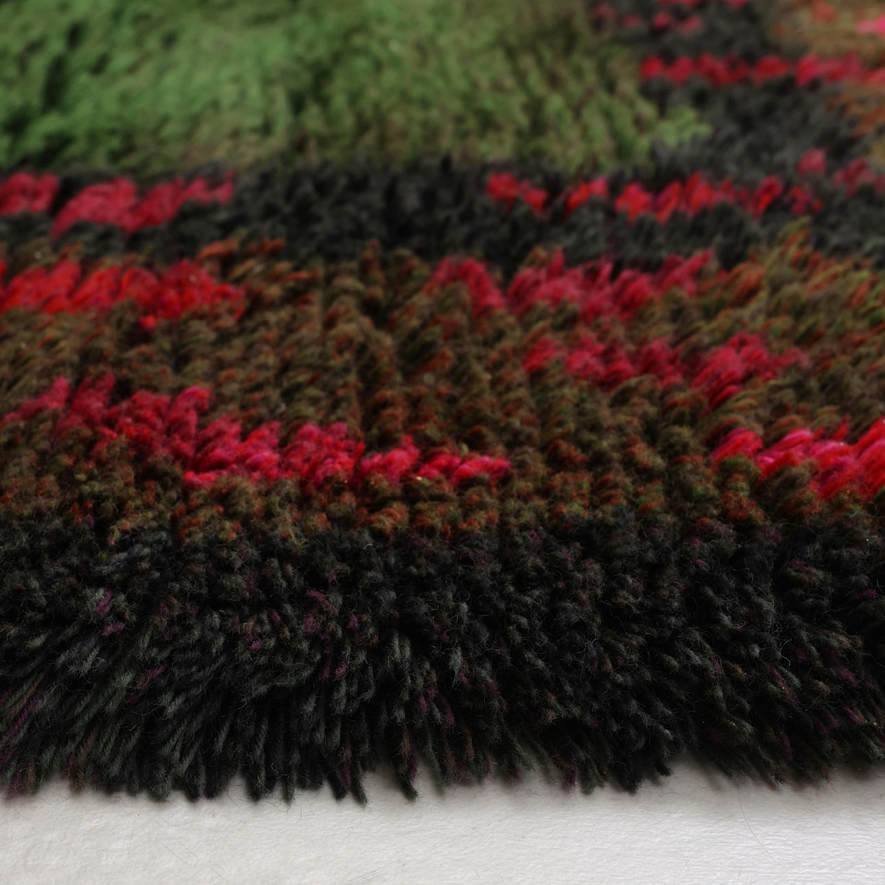 Wandverkleidung in Rya-Technik, komplett aus Wolle, beschriftet mit Suomen Käsityön Ystävät, Helsinki, Finnland.