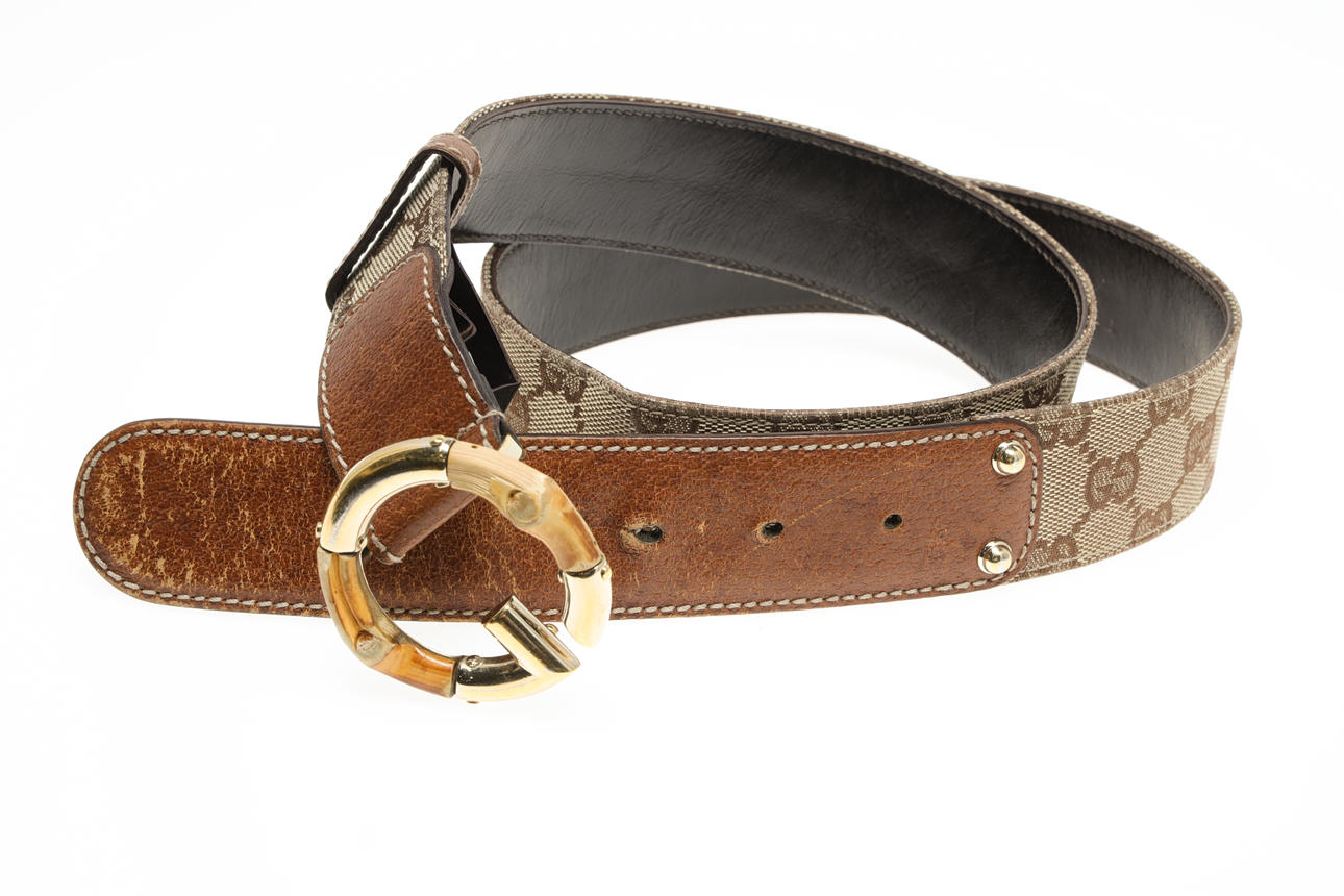 Leder, Bambus und mit Monogramm gewebtes Canvas, Taillenumfang ca. 85-91 cm, Breite ca. 4 cm, Schnallendurchmesser ca. 6 cm. Gekennzeichnet mit GUCCI, hergestellt in Italien, 138456/1476/ Größe 90/36.