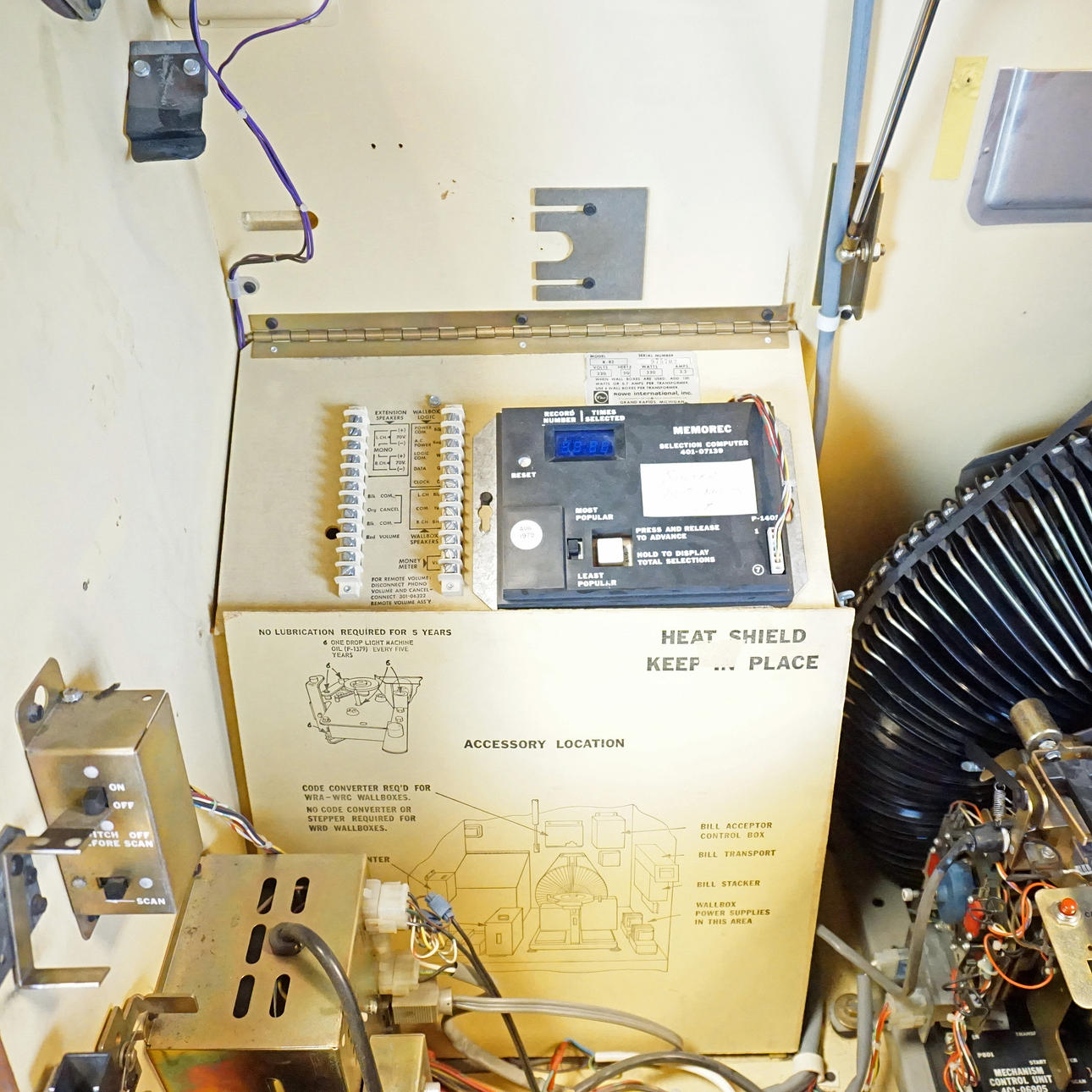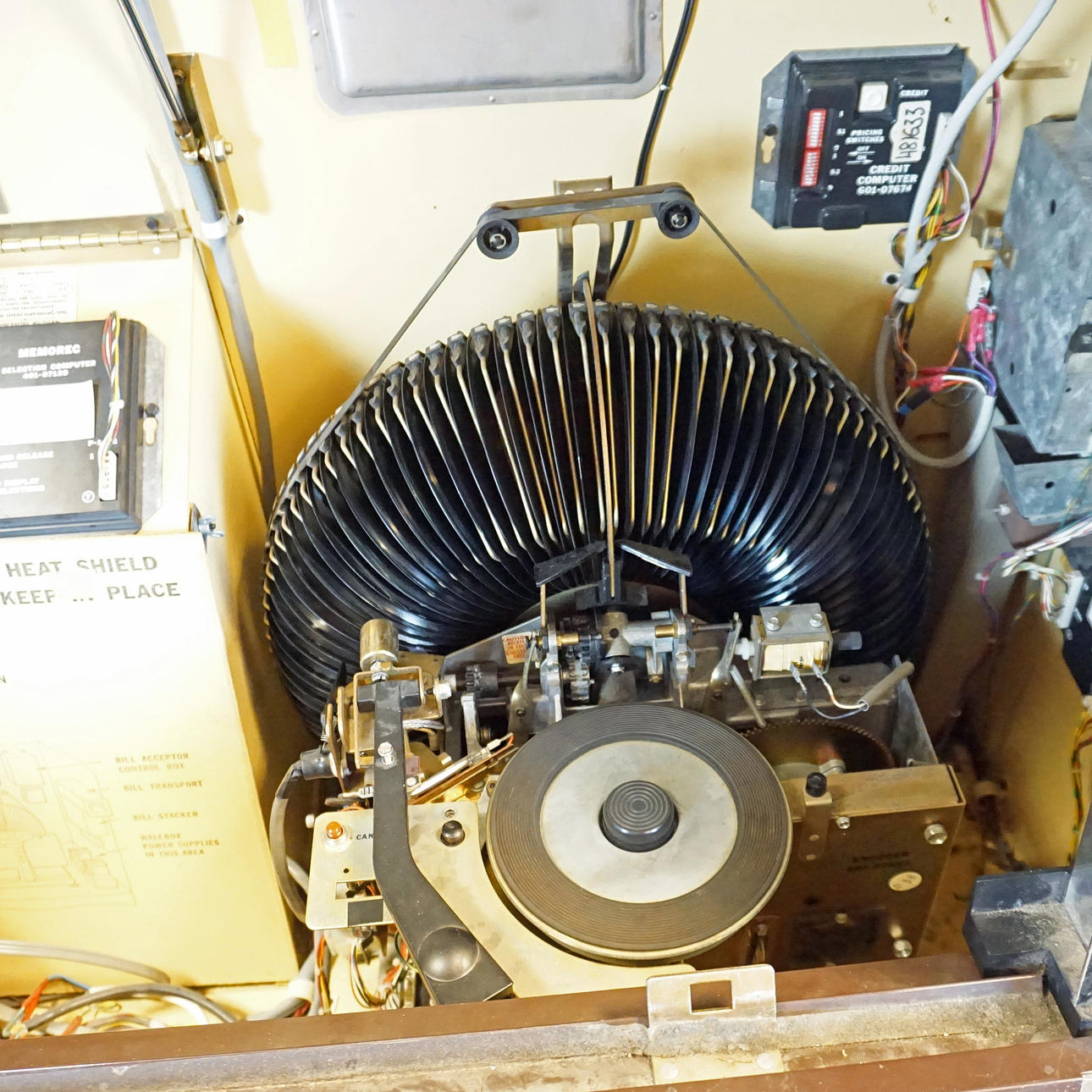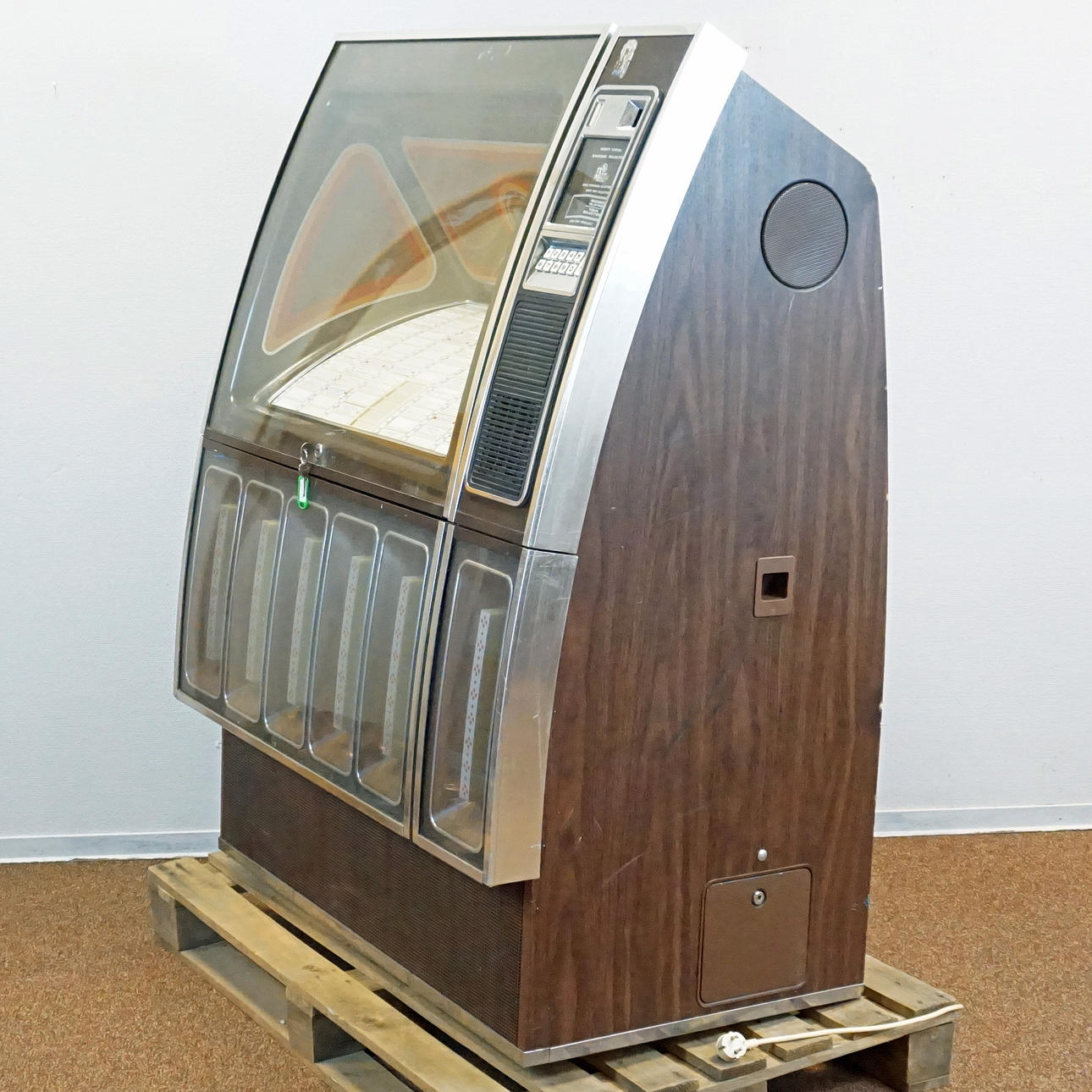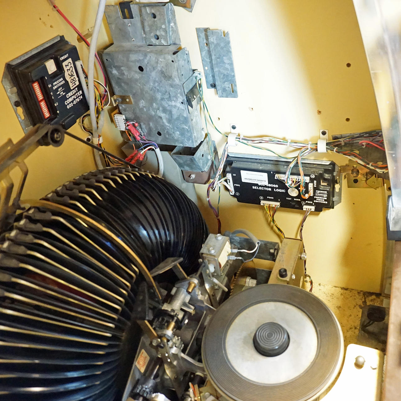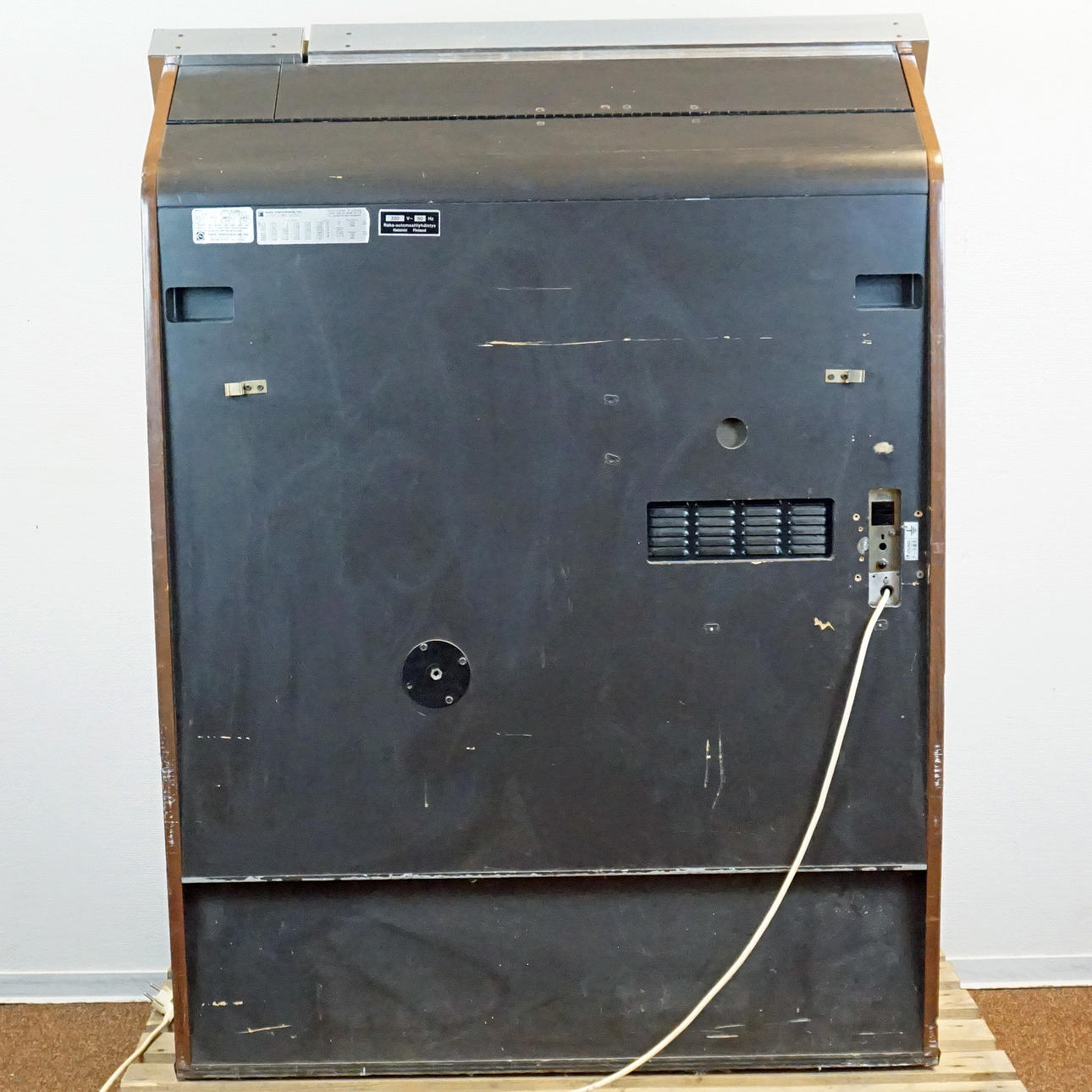 Verschleiß, Kratzer, Flecken. Funktioniert während des Tests, aber wenn die Disc fertig abgespielt ist, hebt die Automatisierung den Arm des Disc-Players nicht an und fährt zurück. Drückt man aber die rote Abbruchtaste in der Jukebox, fährt der Plattenspielerarm zurück. Die Beschriftung des Münzeinsatzes ist gewellt.