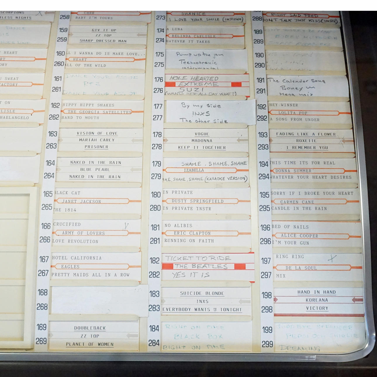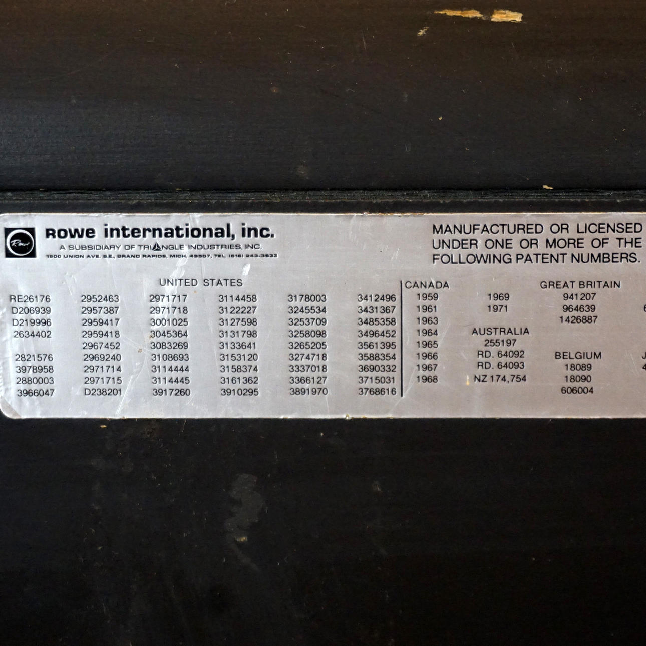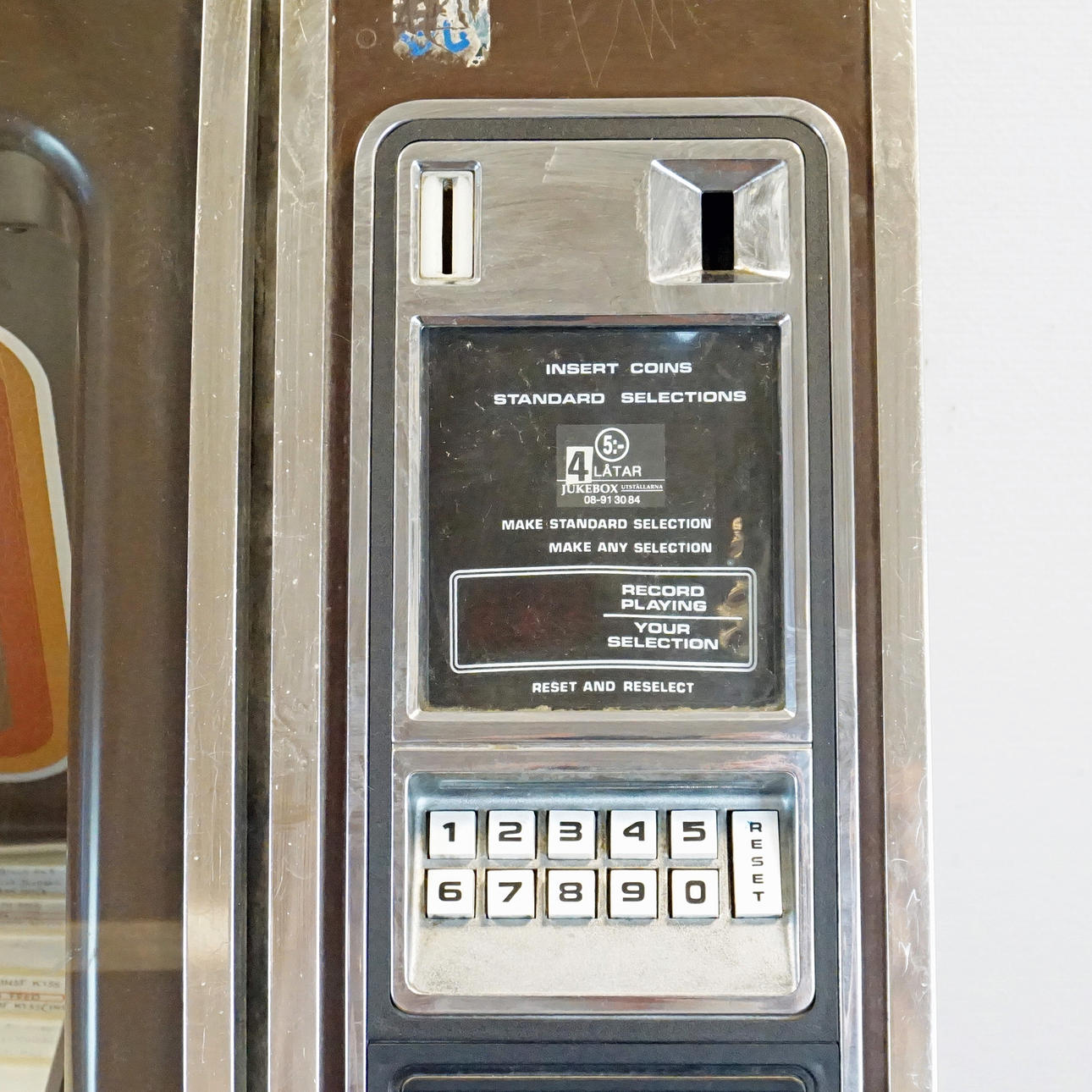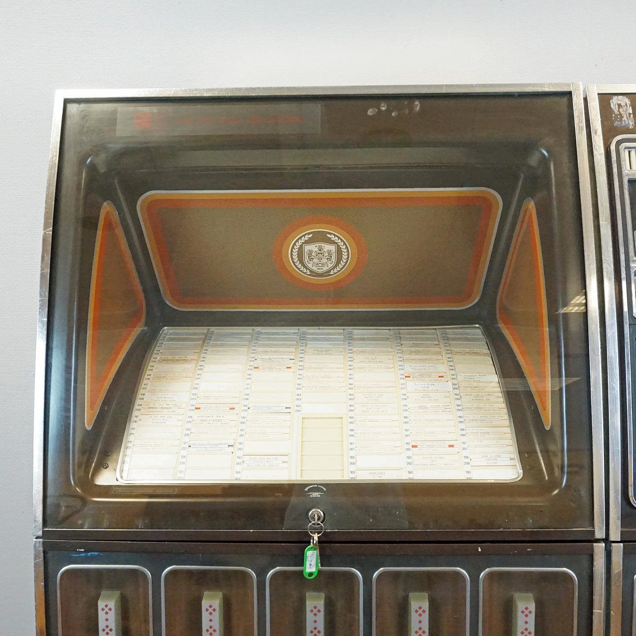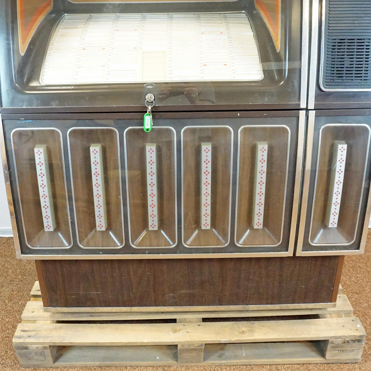 Verschleiß, Kratzer, Flecken. Funktioniert während des Tests, aber wenn die Disc fertig abgespielt ist, hebt die Automatisierung den Arm des Disc-Players nicht an und fährt zurück. Drückt man aber die rote Abbruchtaste in der Jukebox, fährt der Plattenspielerarm zurück. Die Beschriftung des Münzeinsatzes ist gewellt.