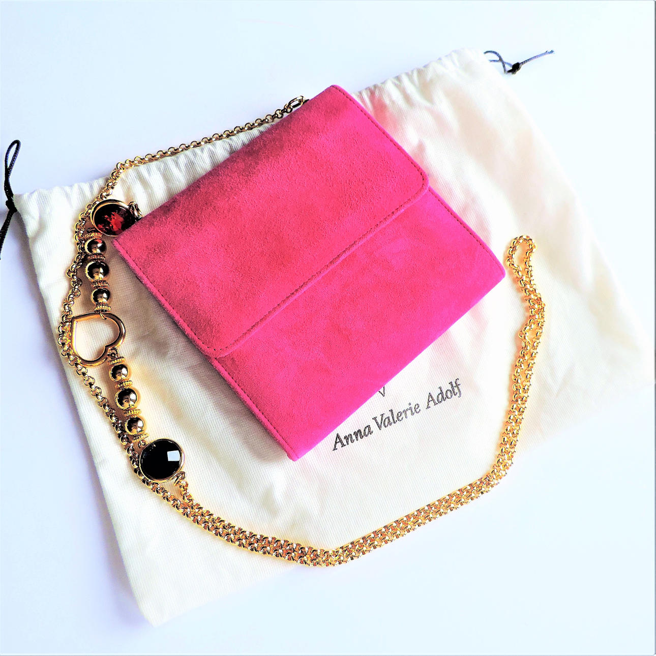 Eine fuchsiafarbene Wildlederhandtasche der deutschen Designerin Anna Valerie, hergestellt in Westdeutschland von Franz J.Adolf. Die Tasche misst 6,5 Zoll im Quadrat und hat einen kunstvollen 48 Zoll langen goldfarbenen Schulterriemen. Das Innere der Tasche ist aus rosafarbenem Satin und hat die Originalzertifizierung. Ein sehr seltener Fund aus den 1990er Jahren.