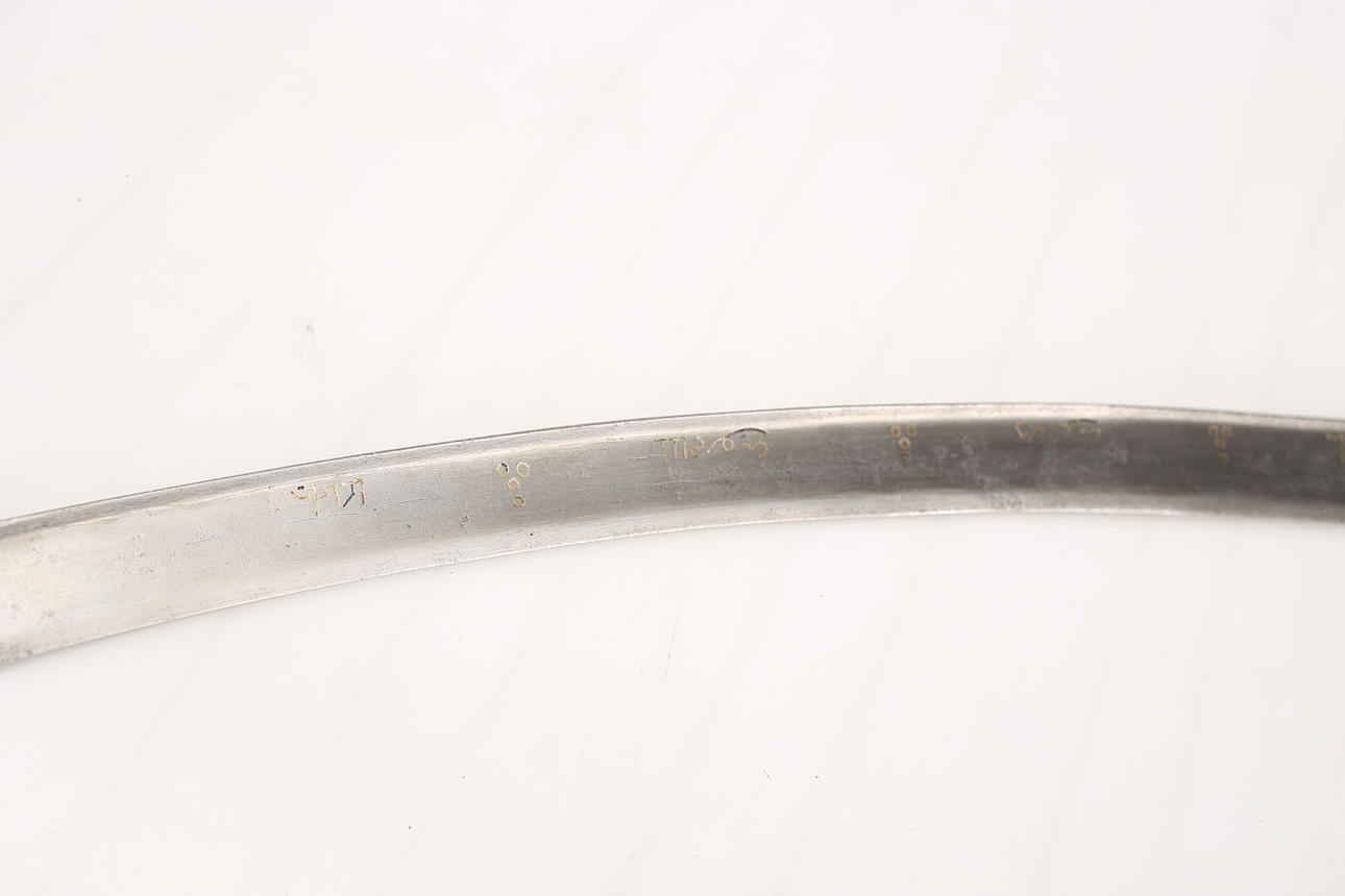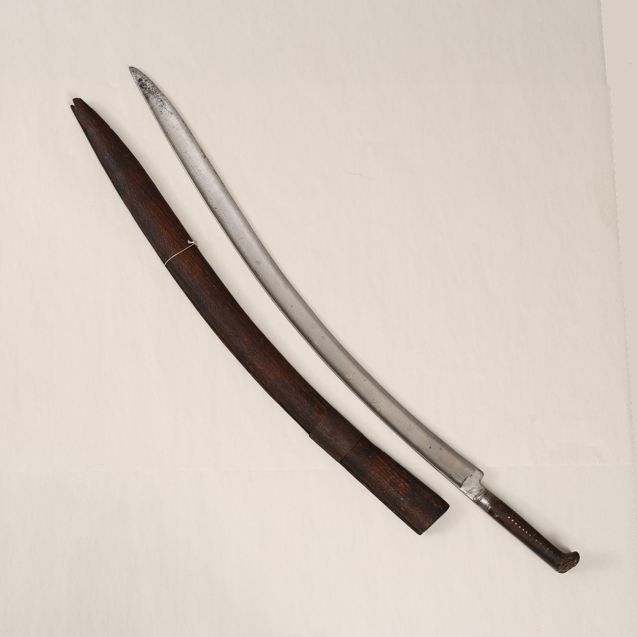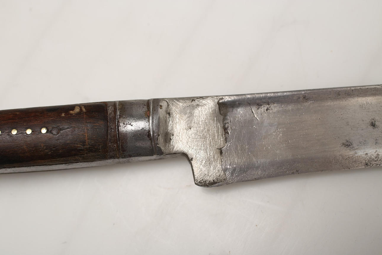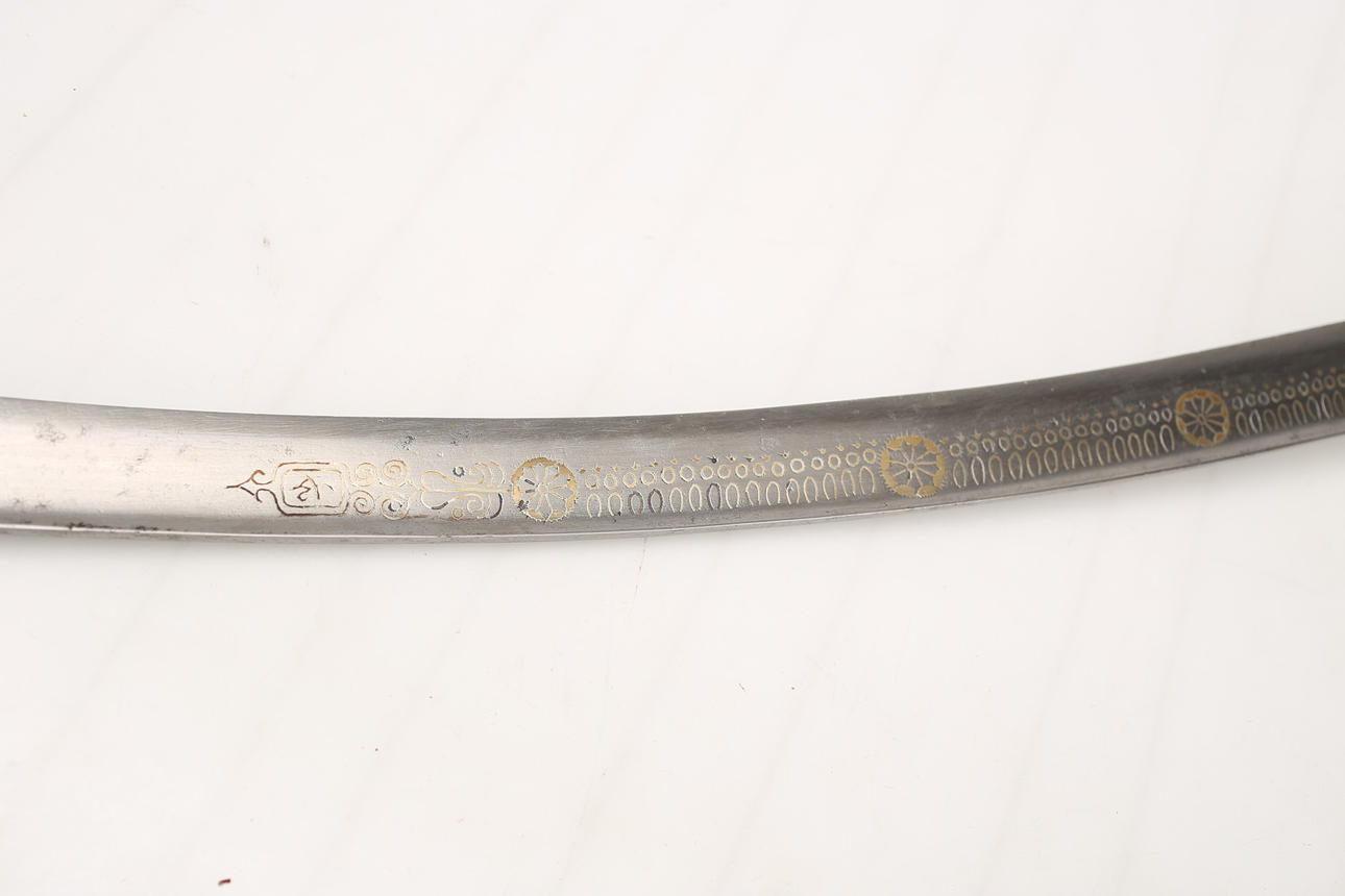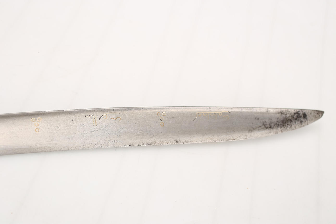 Jatagan, wahrscheinlich osmanisch aus dem 18.-19. Jahrhundert, verzierte Klinge mit Goldeinlagen und Radierungen, arabischer Text.