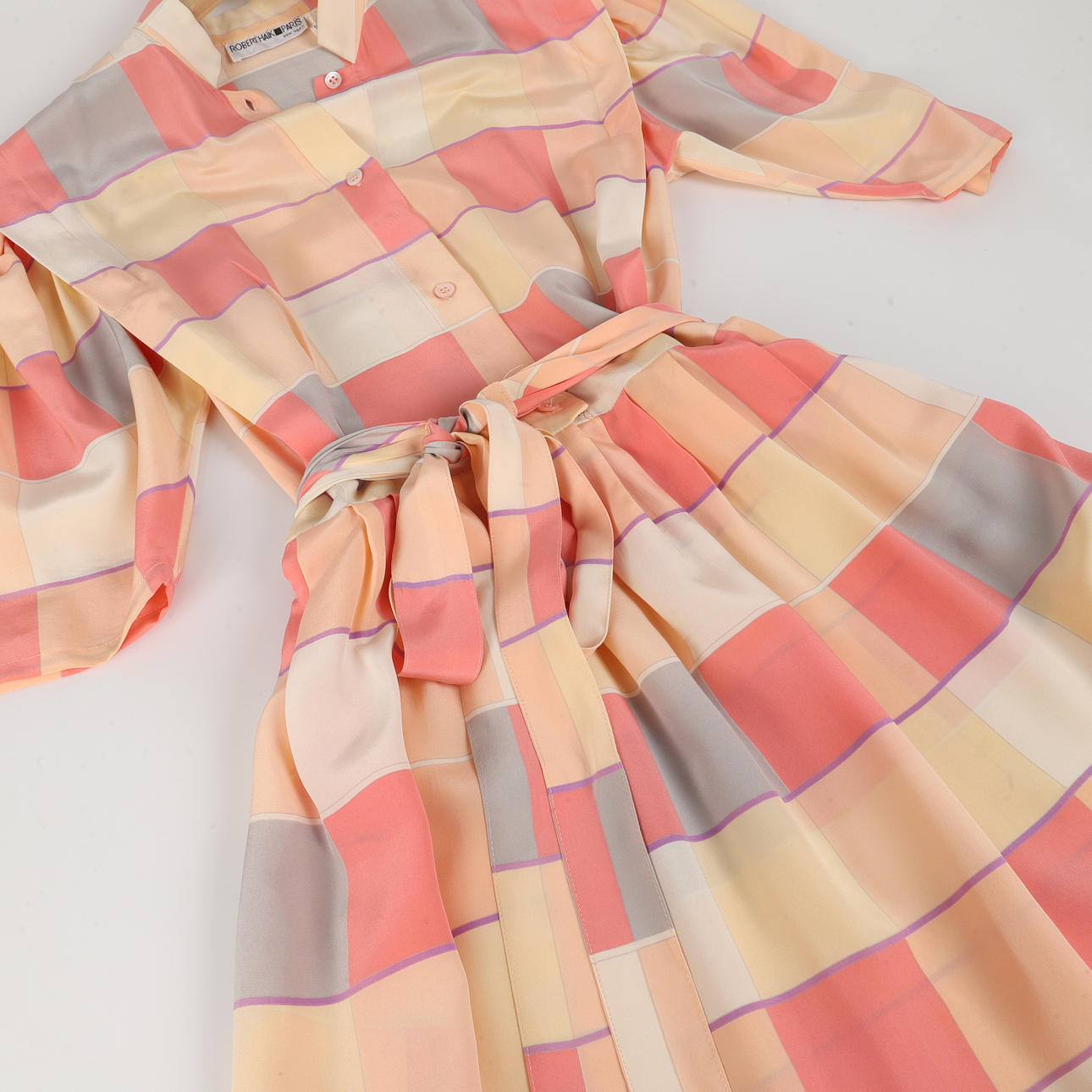 Kleid in Pastellfarben, halbe Ärmel, Knopfleiste vorne, Gürtel in der Taille, 2 Seitentaschen Länge ca. 100 cm, Größe 38.
