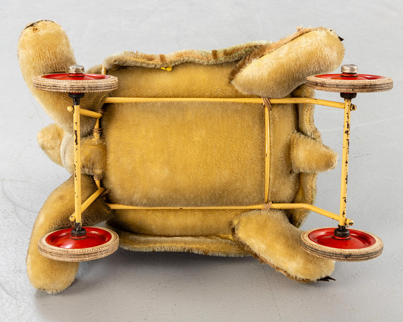 Verschleiß Stellen im Mohairplüsch und Loch im linken Bein, Lackverlust am Metallgestell, Filzkrallen lädiert.