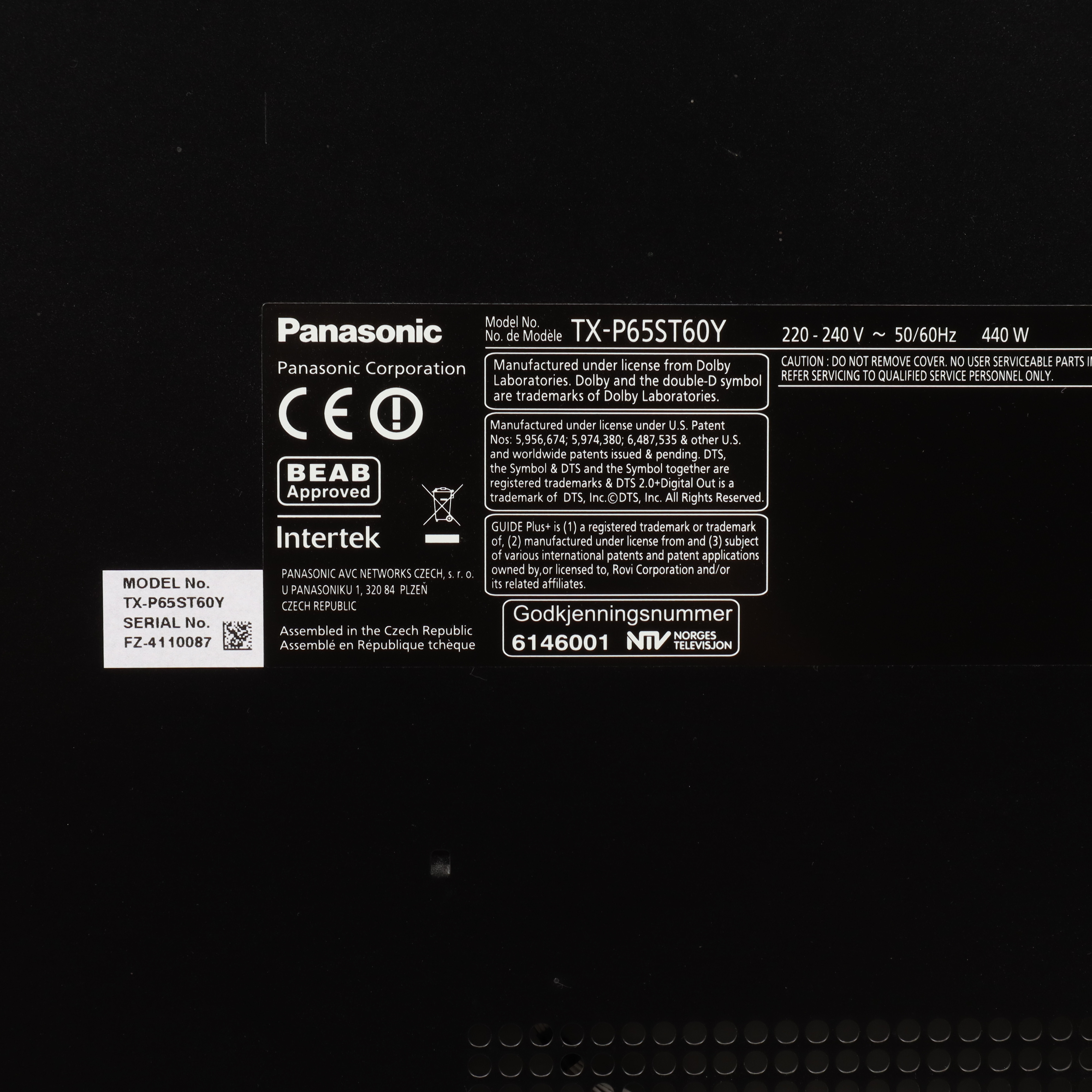2910327. Fernseher, Panasonic, 65 Zoll, Plasma.