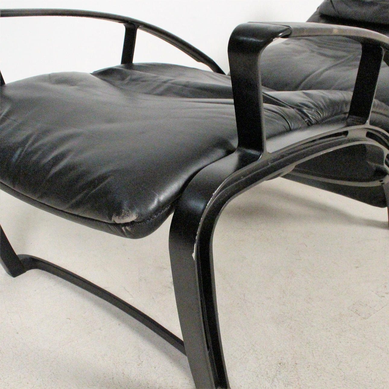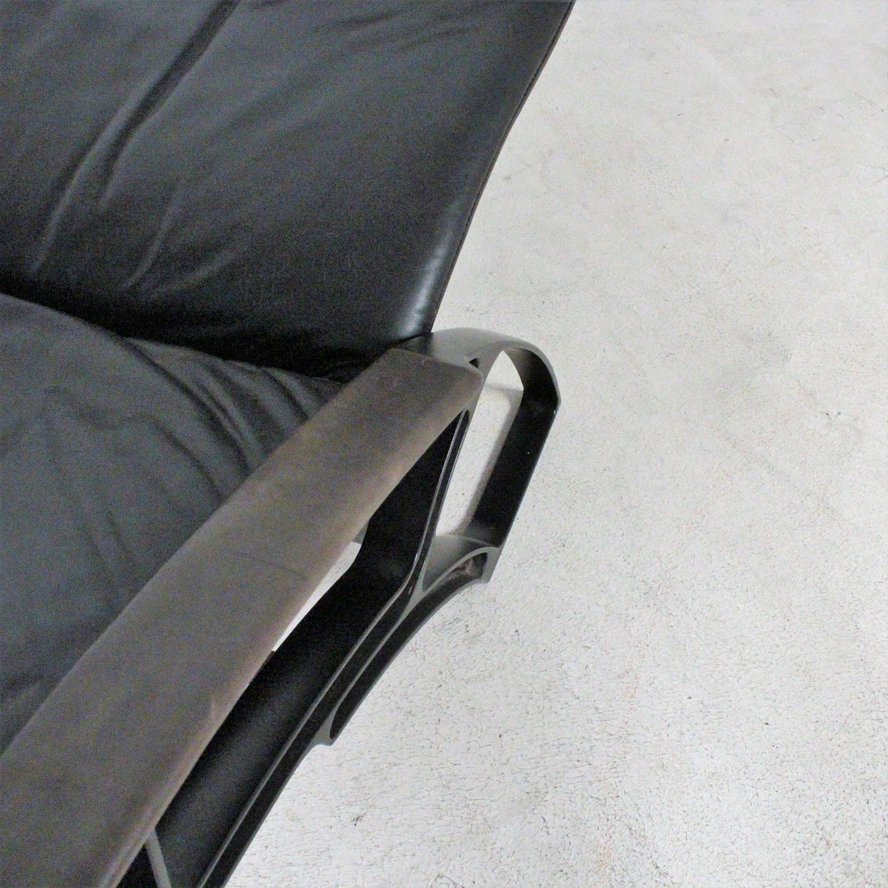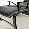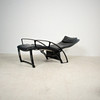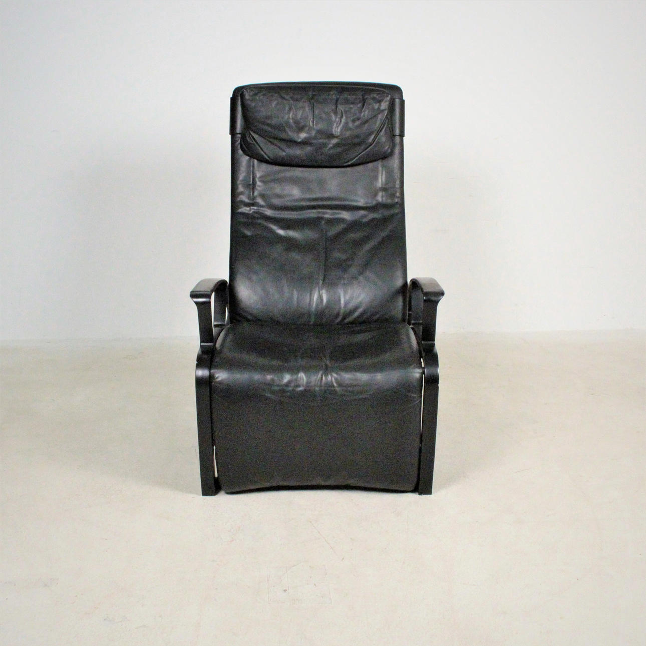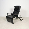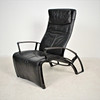Relax Sessel Modell IP 84 S. Design 1980er Jahre. Stufenlos verstellbare Konstruktion aus schwarz lackiertem Aluguss, Bezüge in schwarzem Leder. H. 112, B. 73, T. 120 cm. Unterseitig bezeichnet.