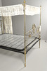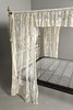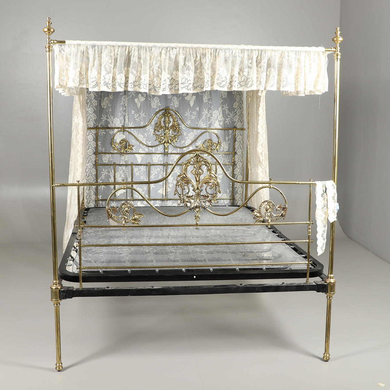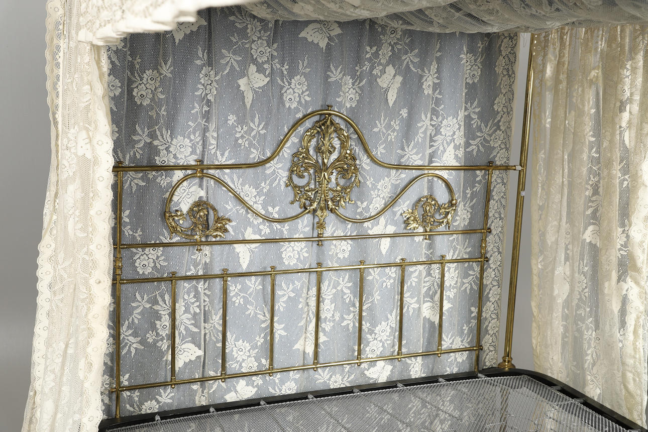 Die Bettenden sind mit Efeublättern und Schnörkeln dekoriert, mit Federbasis und später maschinell gefertigtem Spitzenhimmel und Vorhängen, zusammengebaut ca. 180 cm hoch, Basis 195 cm x 155 cm.