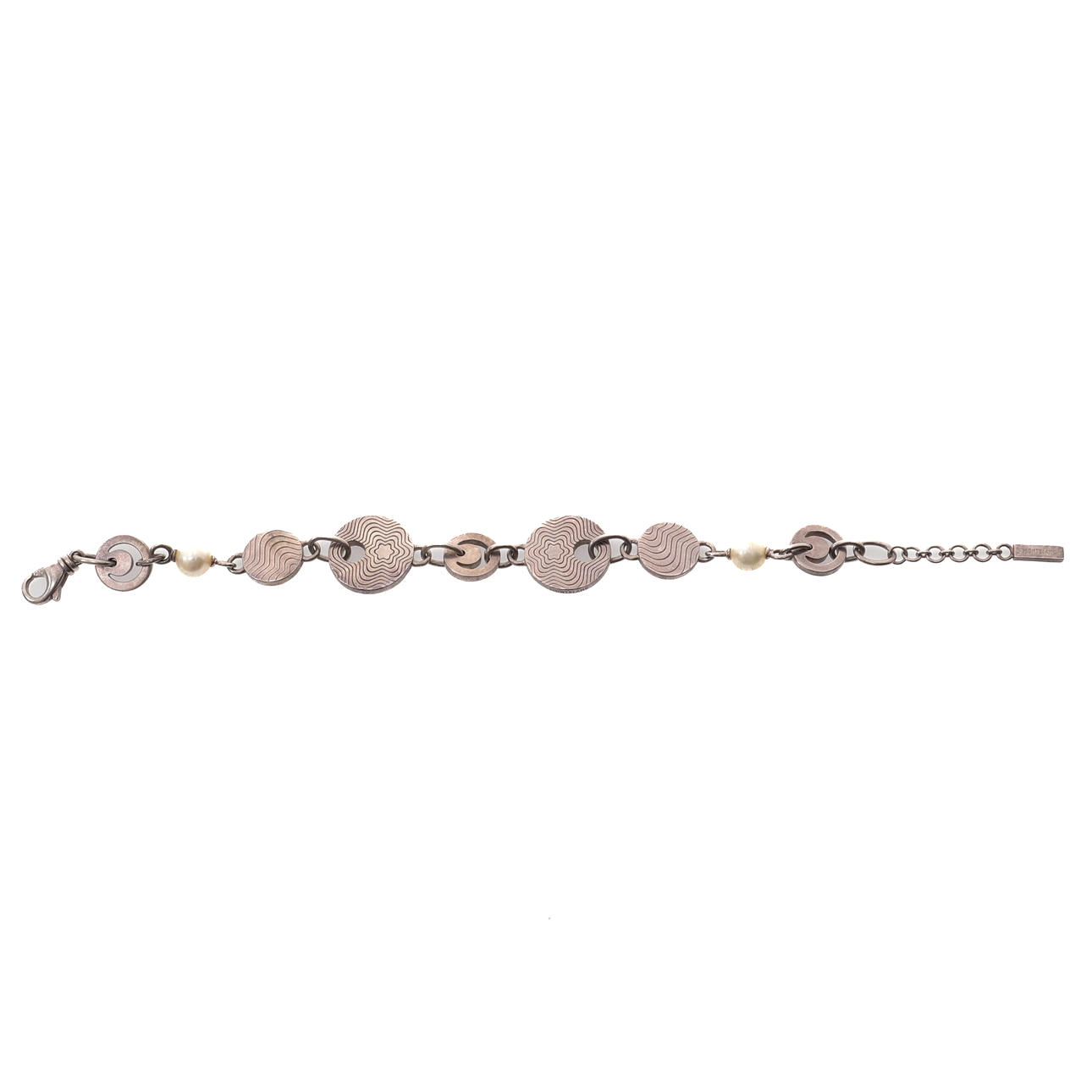 Die kreisförmigen Glieder sind mit Wellenmotiven und durchbrochenen Halbmonden graviert, mit zwei Perlen am Karabinerverschluss, 20,2 cm lang, 30 g brutto.