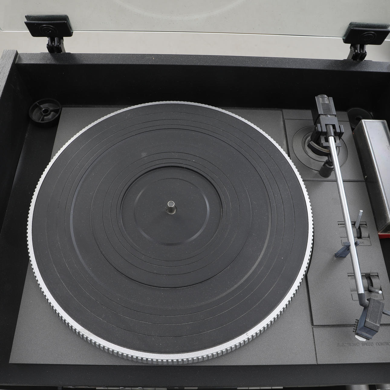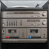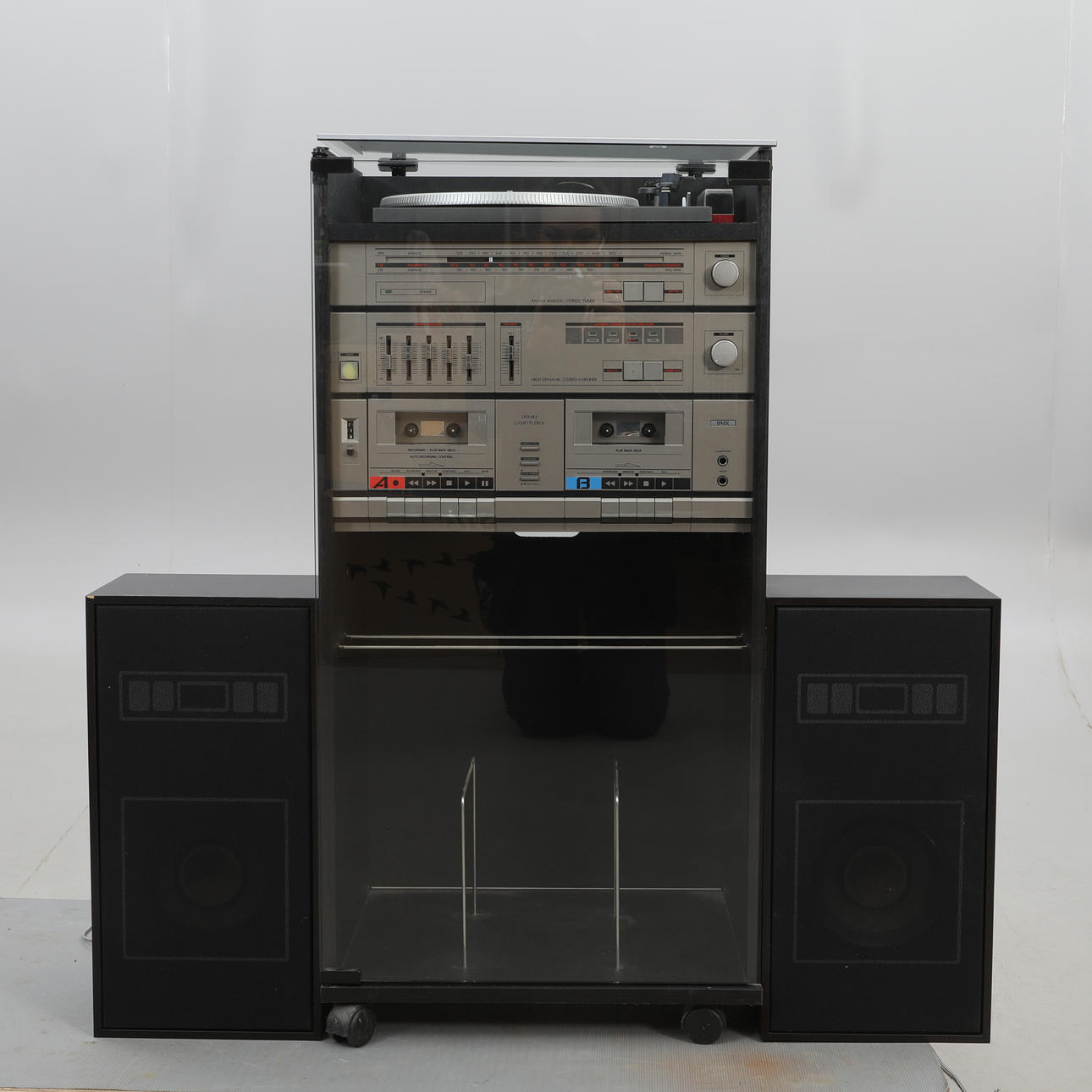 Vinyl-Player, Radio, Verstärker, Doppelkassettendeck, 1 Paar Lautsprecher. Höhe ca. 46 cm.