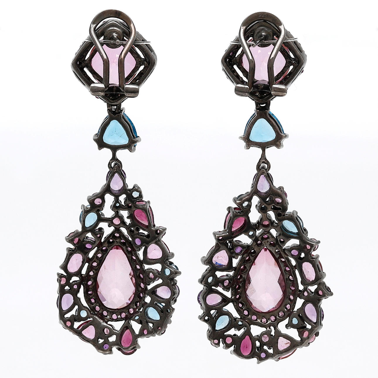 Schwarz rhodiniertes Silber, rosa Saphire, behandelte Topase und Quarz, ca. 28,30 ct. 6,7 und 6,5 cm. 29,8 gr.