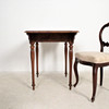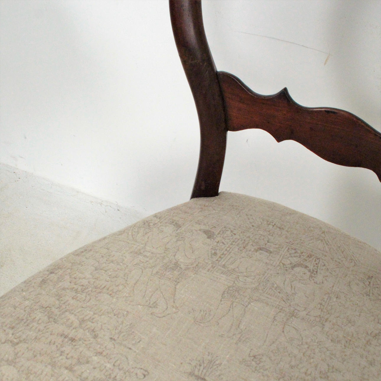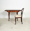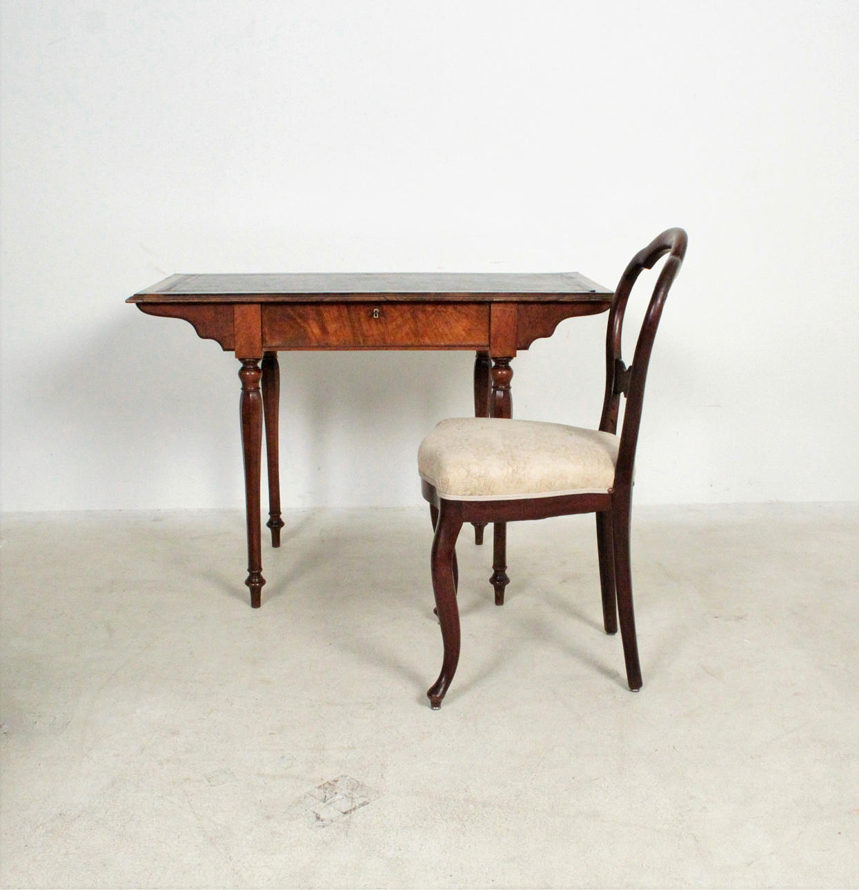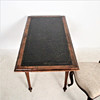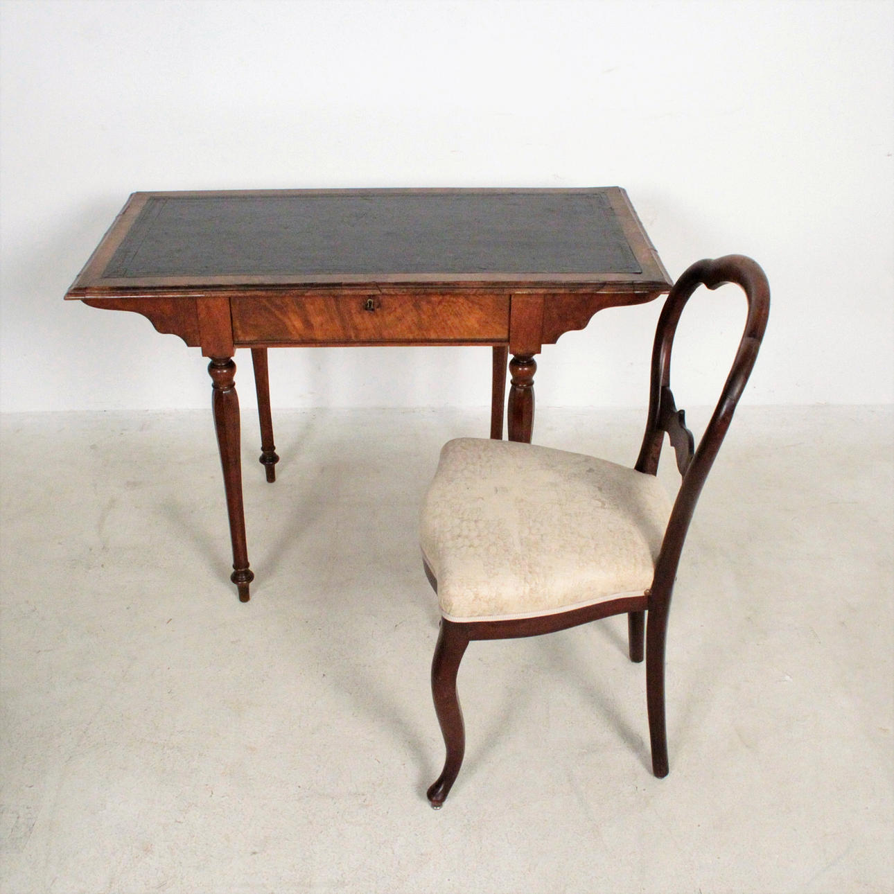 Material: dunkles Holz, Leder, textiles Flachgewebe, Posament