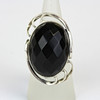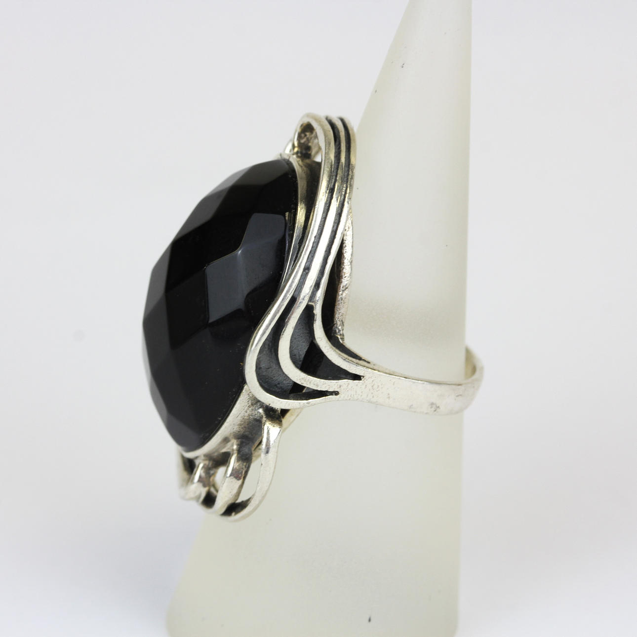 Ein Ring aus 925er Silber, besetzt mit einem großen facettierten schwarzen Stein, Ringgröße K.5.