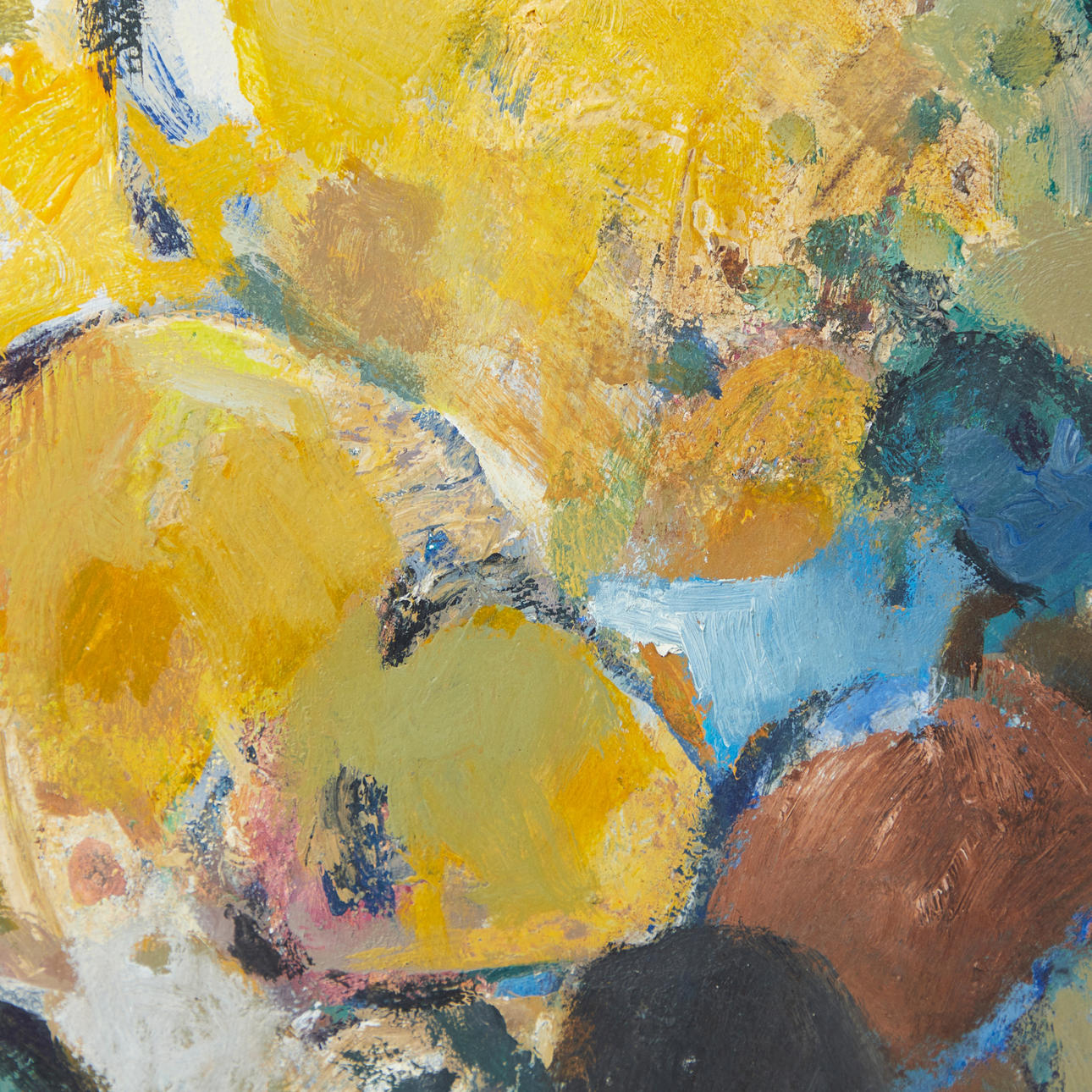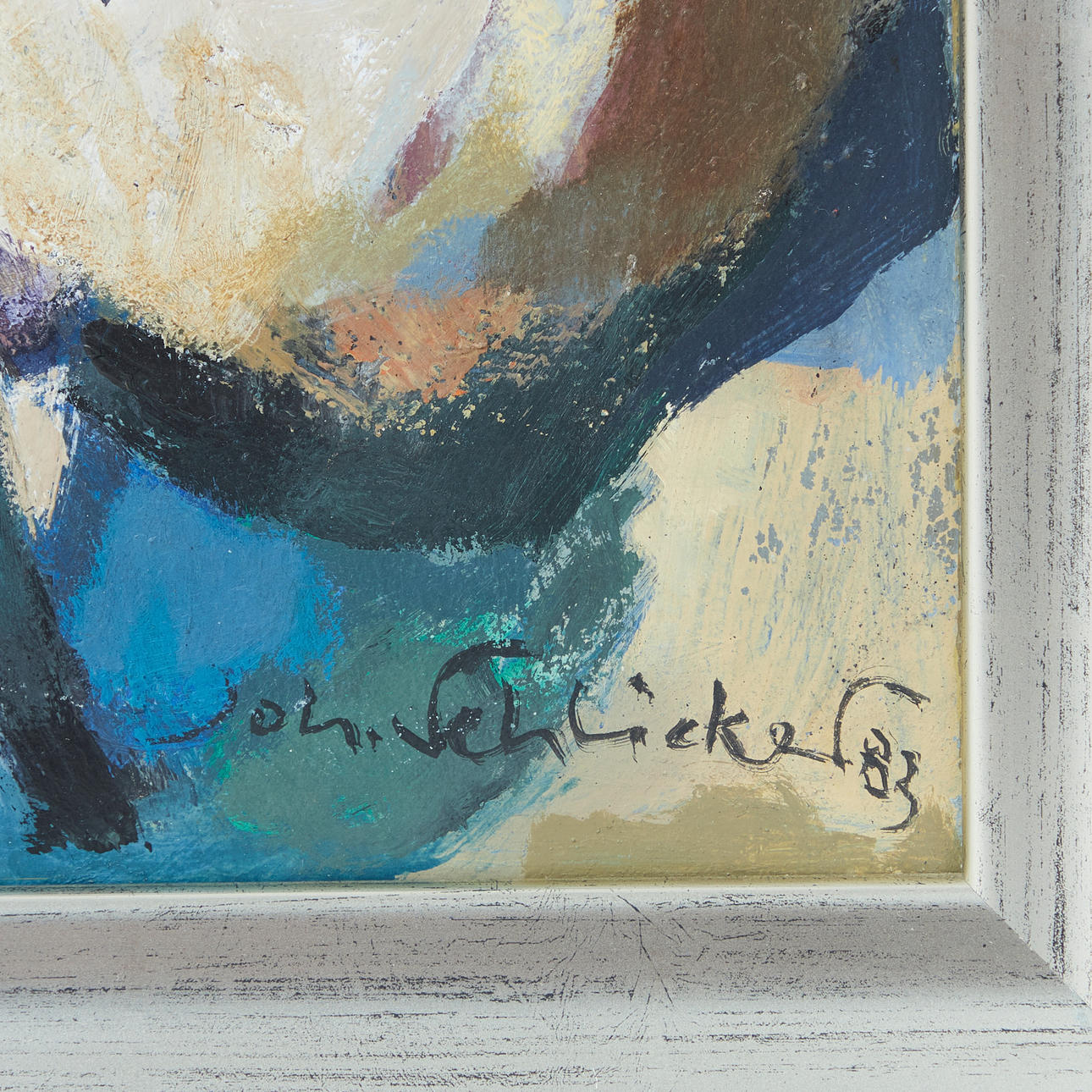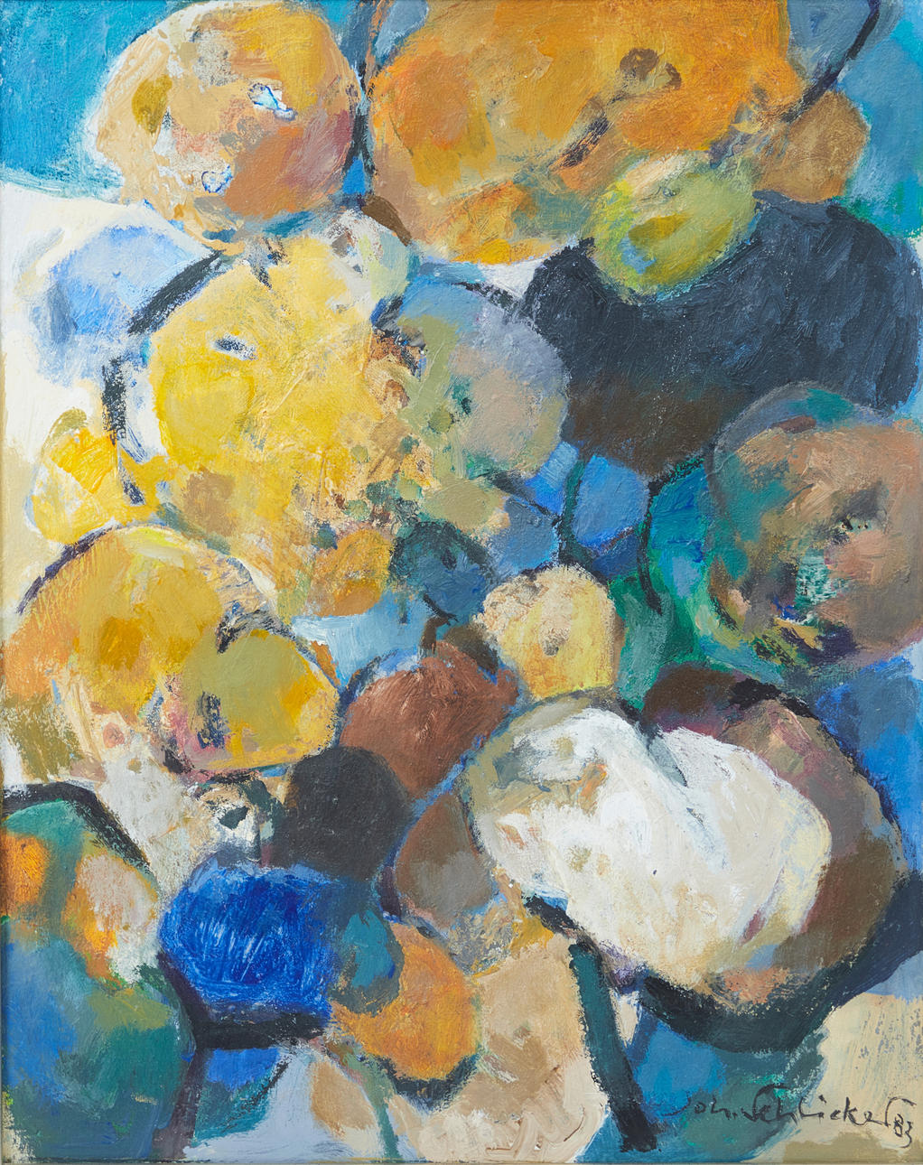 Johannes Schlicker (1913-2007), Gemälde, Ohne Titel, 1983, Öl auf Hartfaserplatte. Darstellung abstrahierter Formen in polychromer Farbgebung, unten rechts signiert und datiert, 49x38,5cm (58x47,5cm).