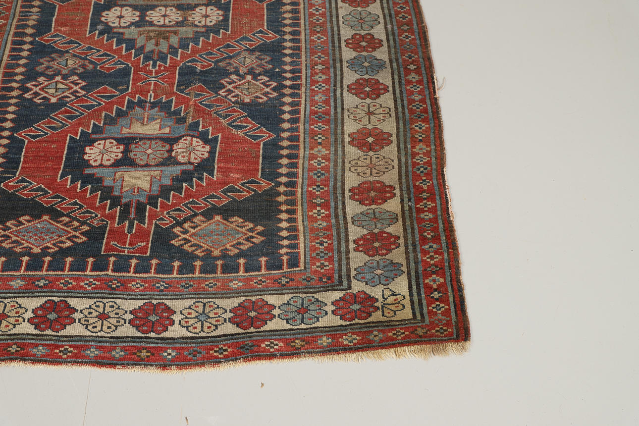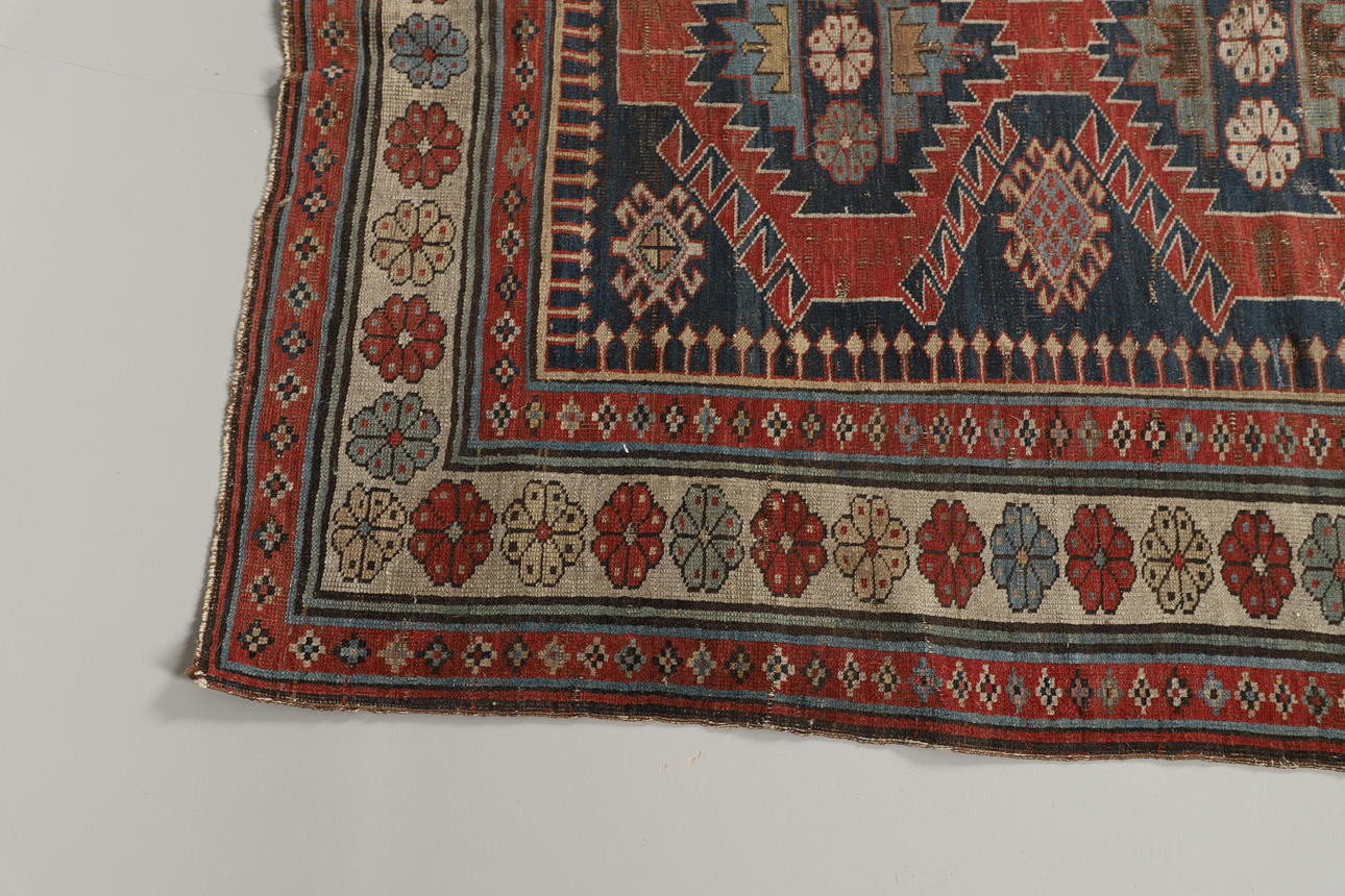 das nachtblaue Feld mit einer Säule aus Hakenmedaillons, umgeben von elfenbeinfarbenen Bordüren aus polychromen Blütenköpfen, 157 cm x 116 cm.