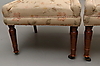 Rückenlehne und Sitz gepolstert, mit Stoff bezogen, Messingräder an den Vorderbeinen.
