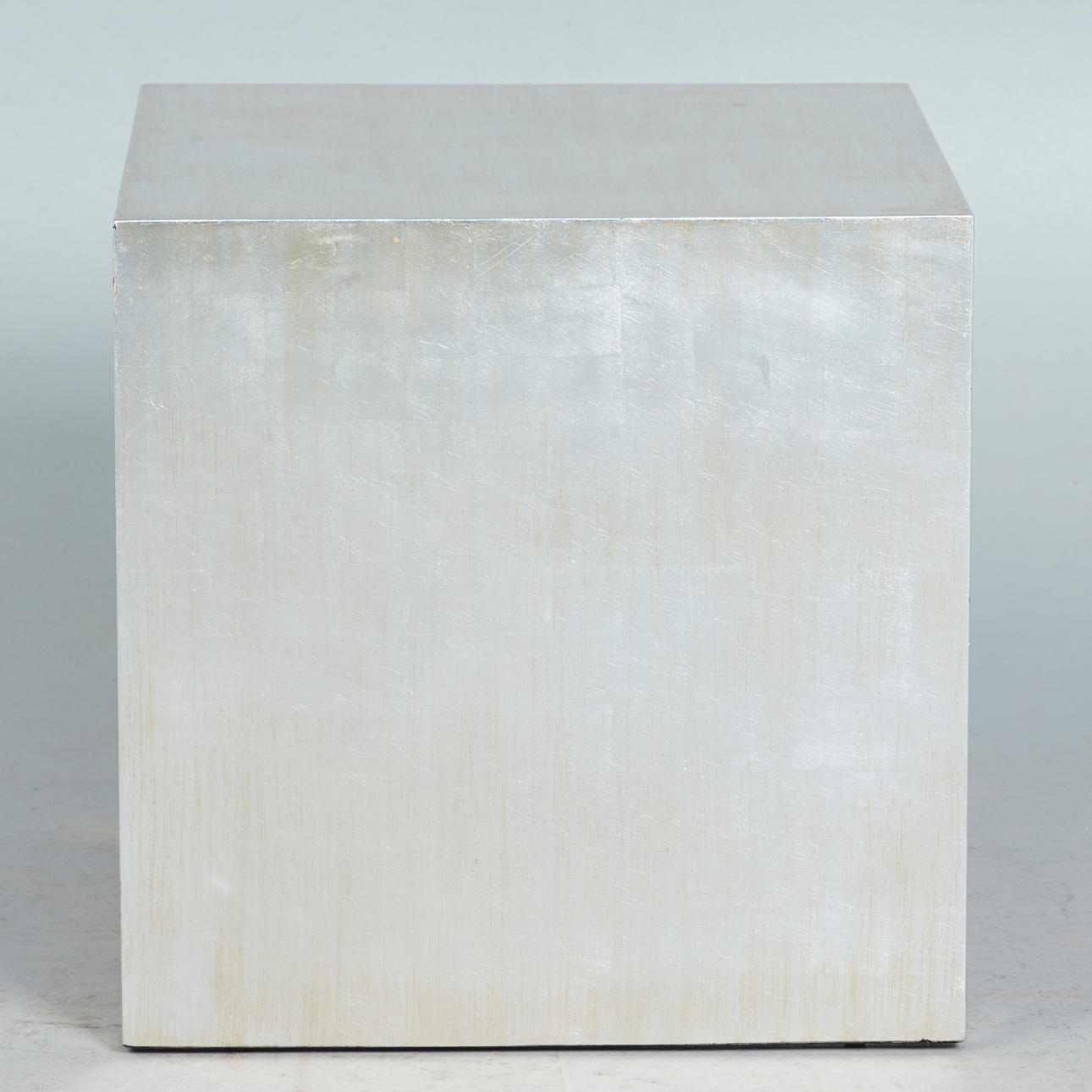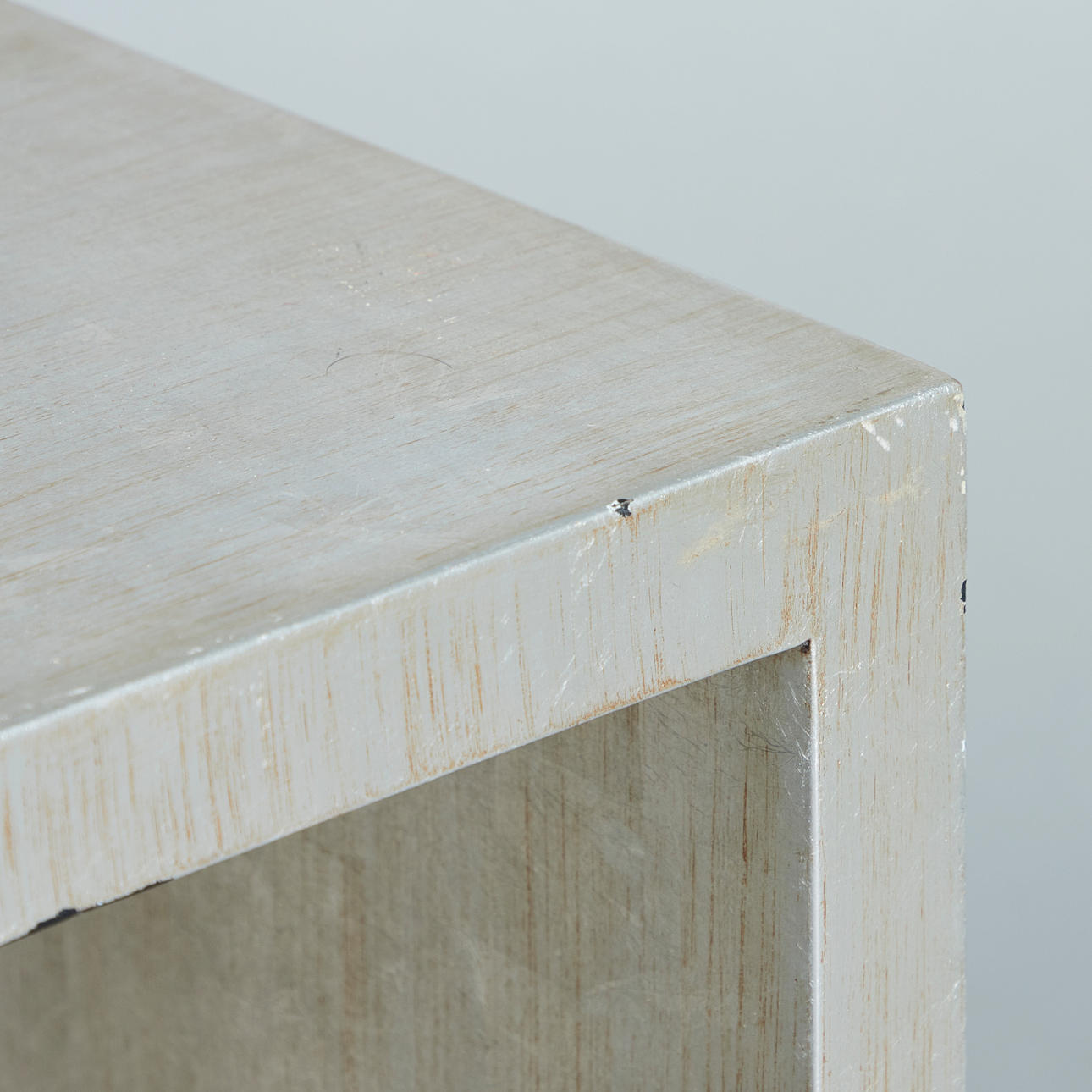 Lambert, Couchtisch / Beistelltisch, Holz. U-förmiger Beistelltisch aus silberfarben lackiertem Holz mit goldfarbenen Farbakzenten sowie mit einer Schicht Klarlack versehen, unterseitig mit Herstelleretikett bezeichnet, H.60,5cm, L.60cm, B.60cm.