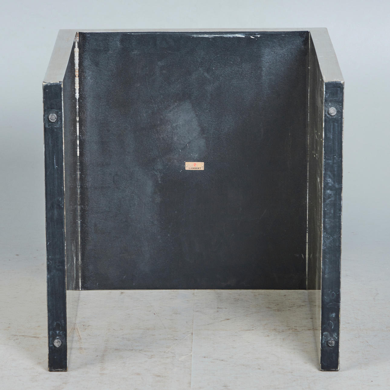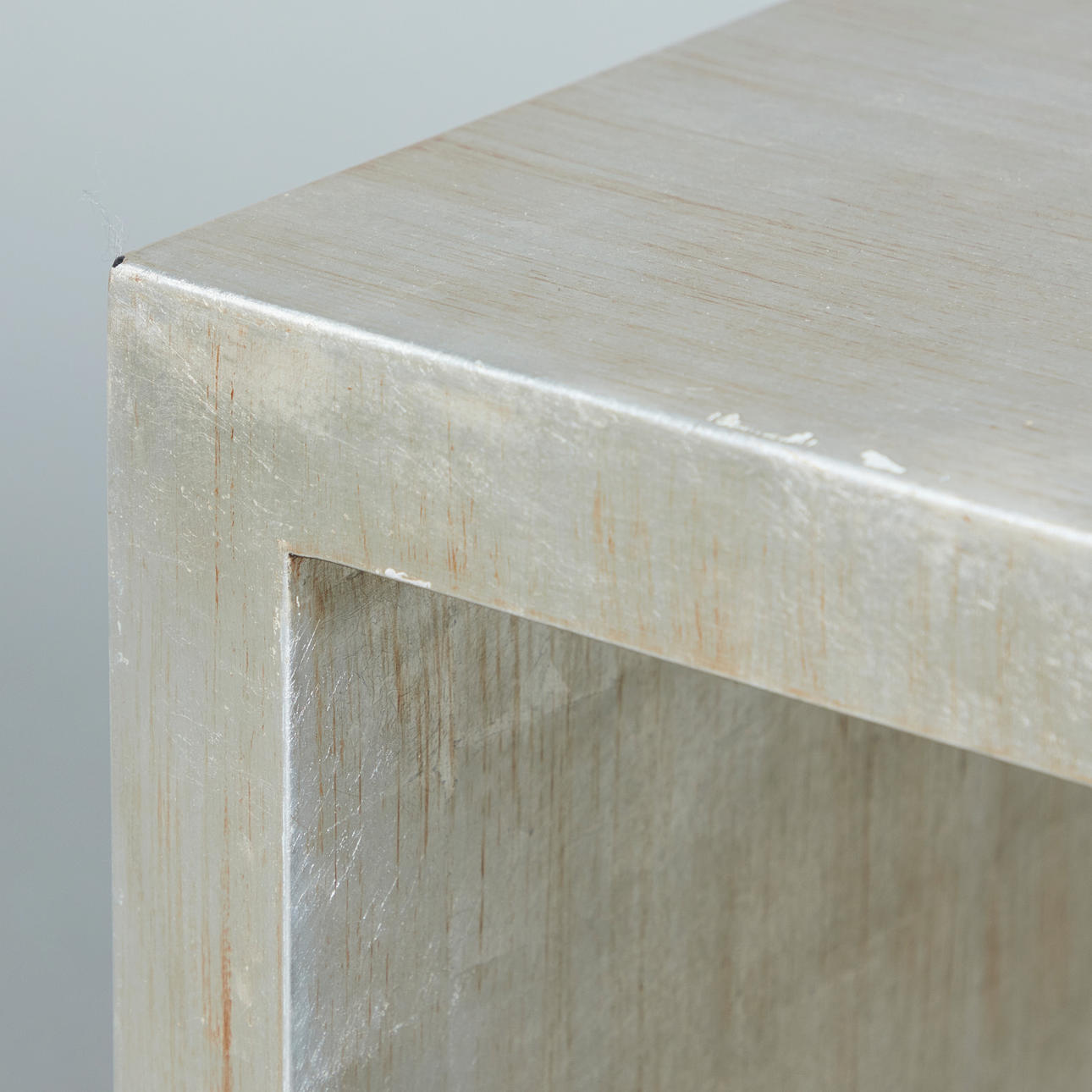 Lambert, Couchtisch / Beistelltisch, Holz. U-förmiger Beistelltisch aus silberfarben lackiertem Holz mit goldfarbenen Farbakzenten sowie mit einer Schicht Klarlack versehen, unterseitig mit Herstelleretikett bezeichnet, H.60,5cm, L.60cm, B.60cm.