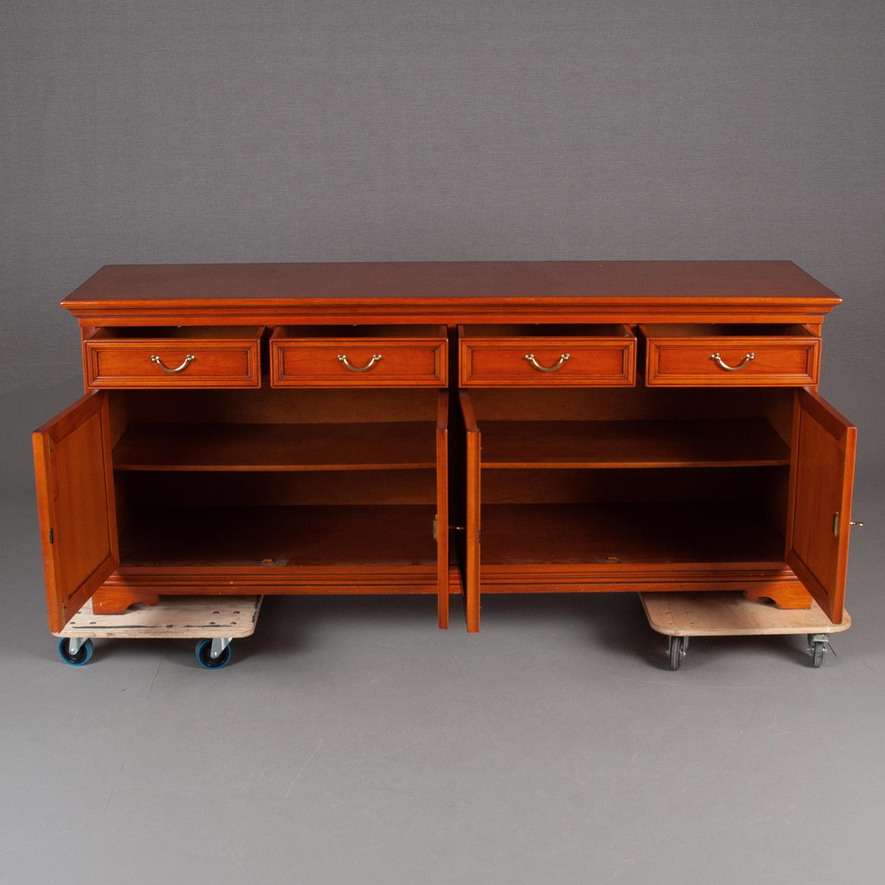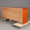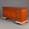 Gebeiztes Holz. Mit 4 ausziehbaren Schubladen und Schrank mit darunterliegenden Regalen. Länge 215 cm. Höhe 94 Tiefe 60 cm.