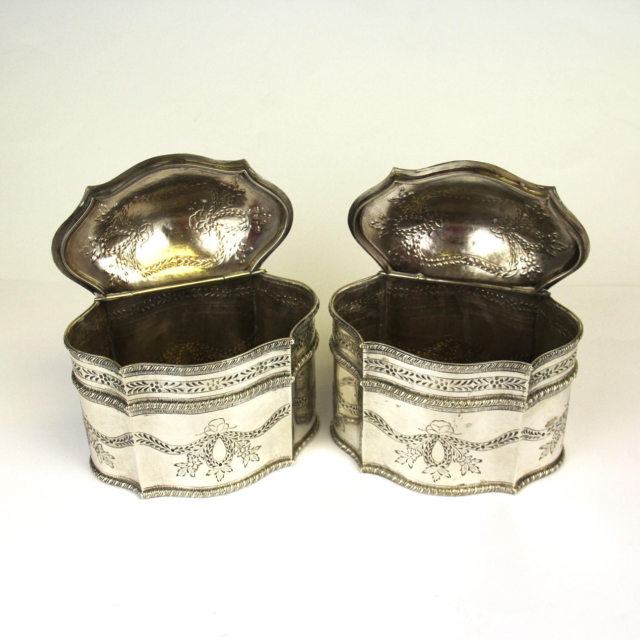 Ein Paar niederländische Teedosen aus .835er Silber aus dem 19. Jahrhundert mit der Aufschrift ZII, 14 x 12 cm.