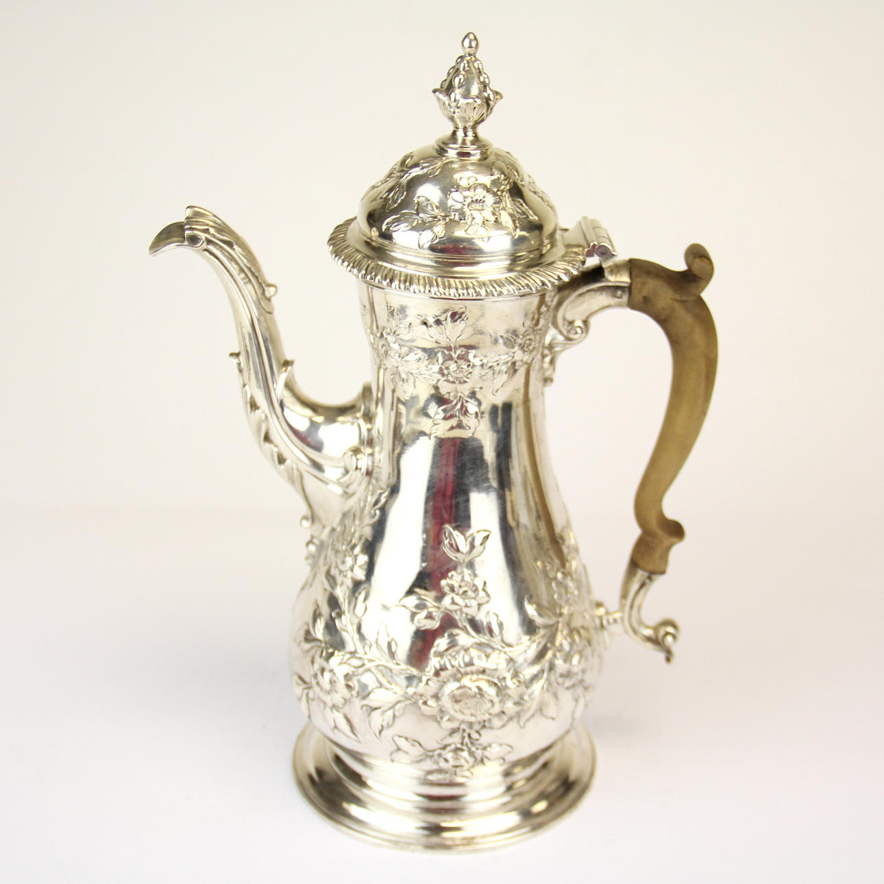 Eine georgianische gepunzte silberne Kaffeekanne, H. 27 cm.
