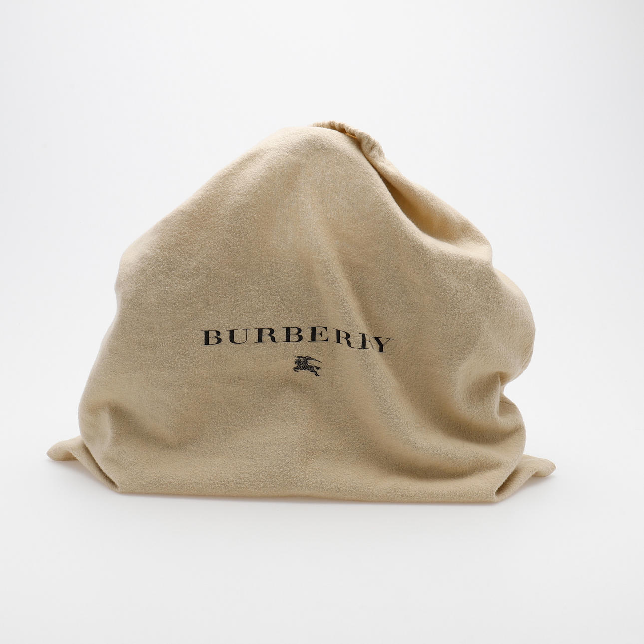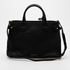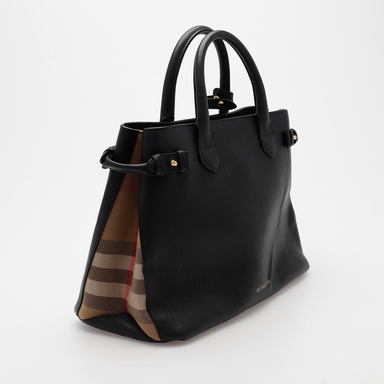 Schwarzes genarbtes Leder mit Messingbeschlägen und Textil mit Burberry-Schottenmuster, zwei Henkeln und abnehmbarem Schultergurt, ausgestattet mit vier Fächern, davon zwei mit Reißverschlüssen, hergestellt in Italien, Größe M, Breite ca. 35 cm. Staubbeutel, Etikett und Produktpflegeanleitung im Lieferumfang enthalten.