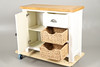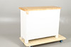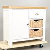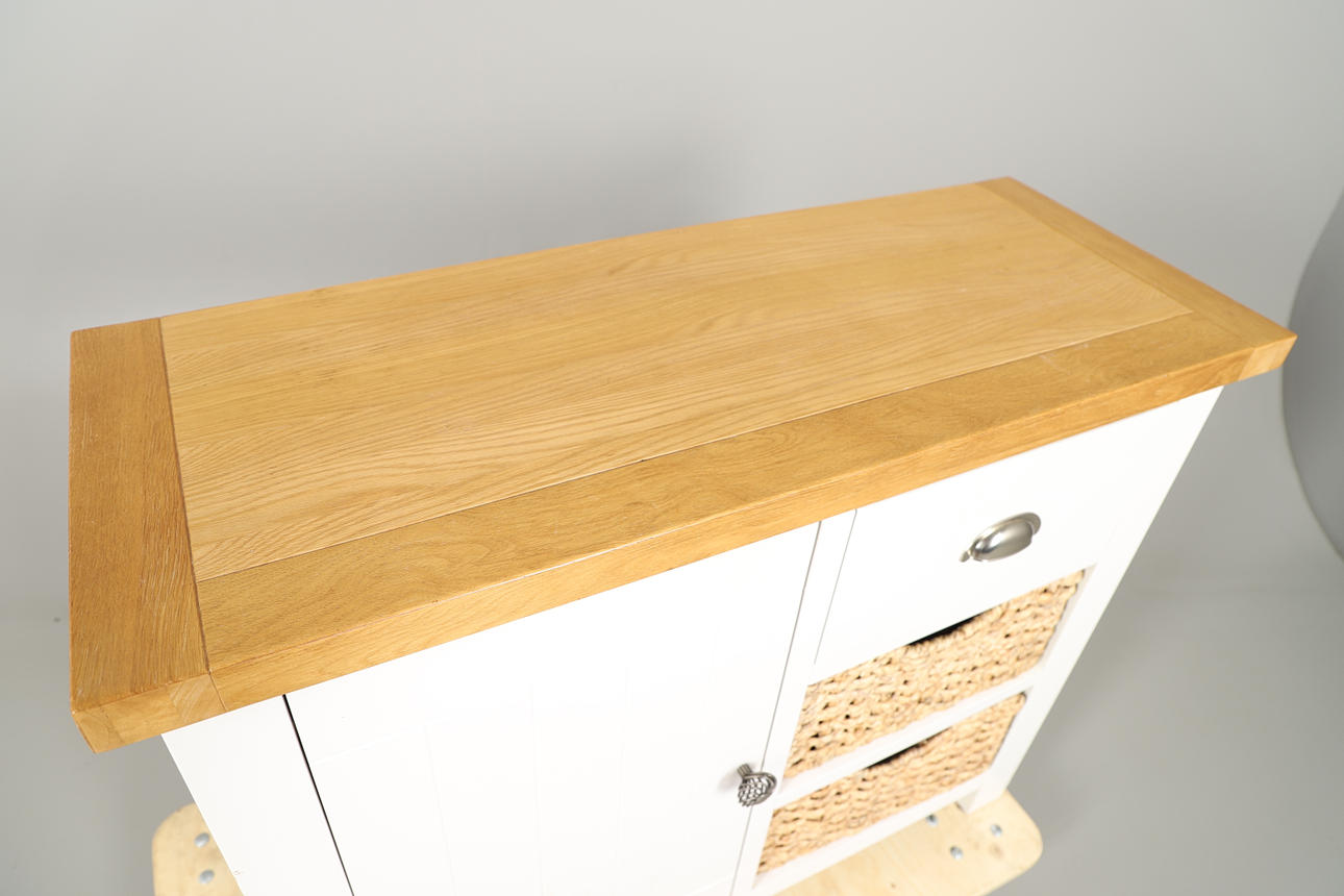 Weiß lackiert mit Metallgriffen. Oberfläche aus schlichter Eiche, mit einem einzelnen Schrank auf der linken Seite (mit einem Innenregal auf einer Ebene) neben drei gestapelten Schublade auf der rechten Seite (bestehend aus einer einzelnen Laufschublade über zwei „Schublade“ aus Weidenkörben). Höhe 87 cm x Länge 104 cm x Tiefe 40 cm.