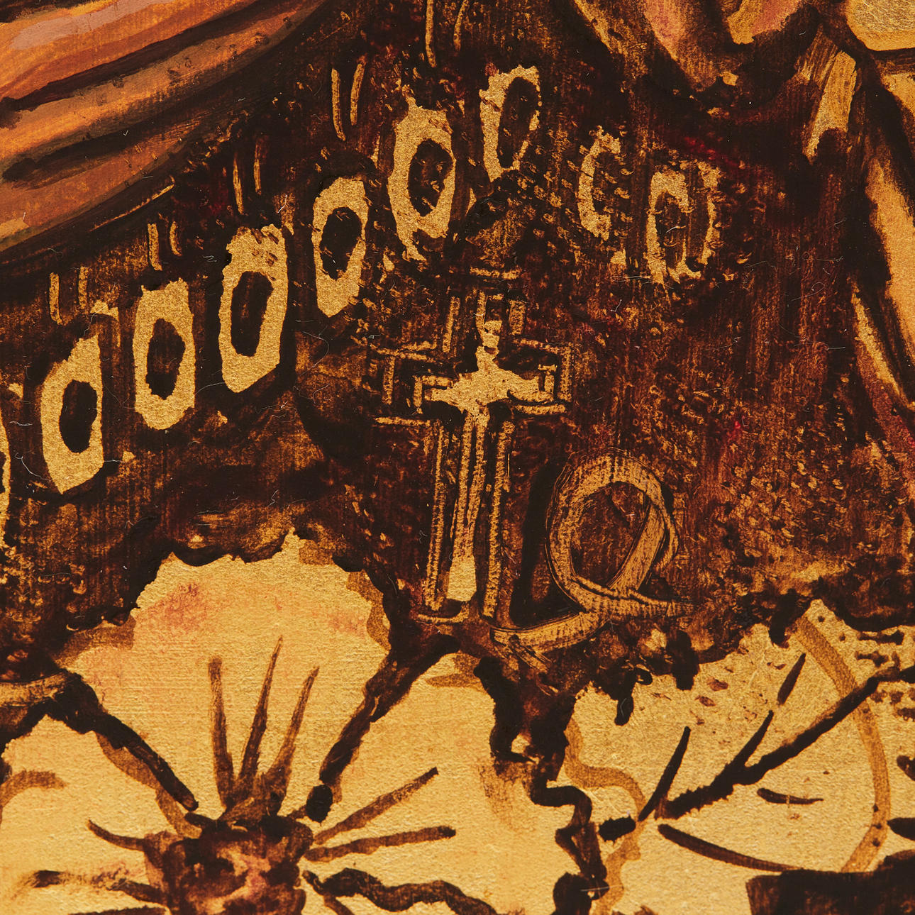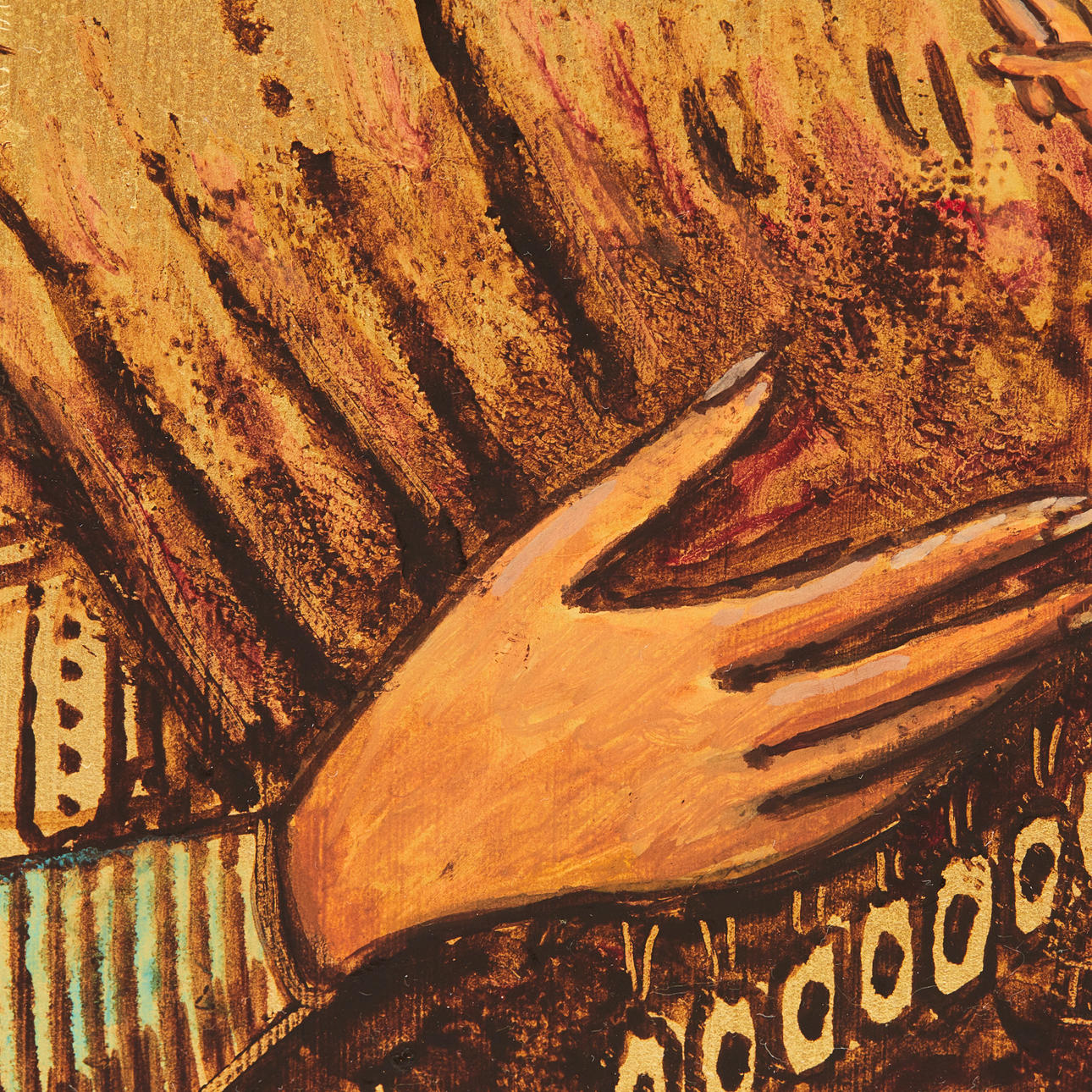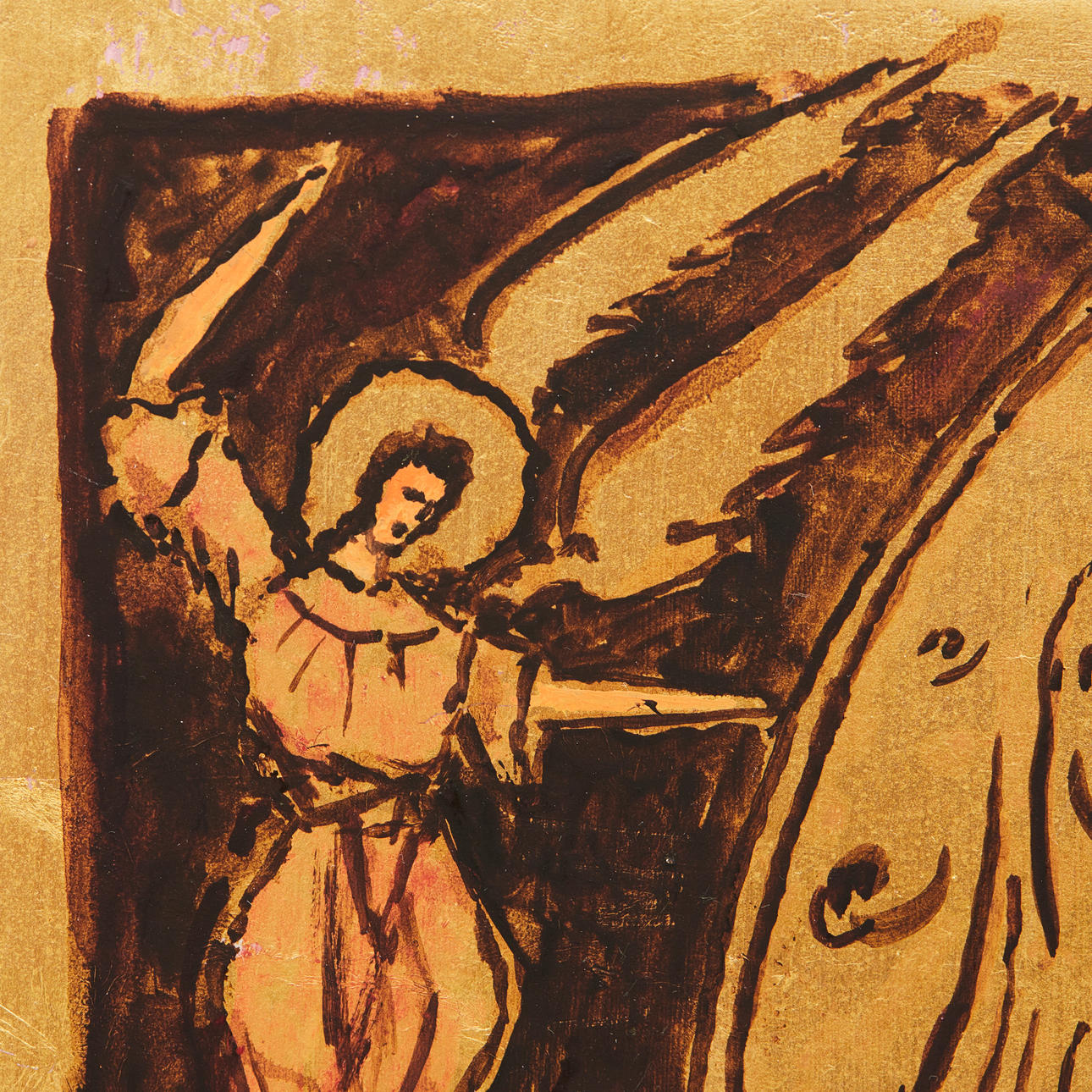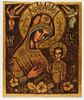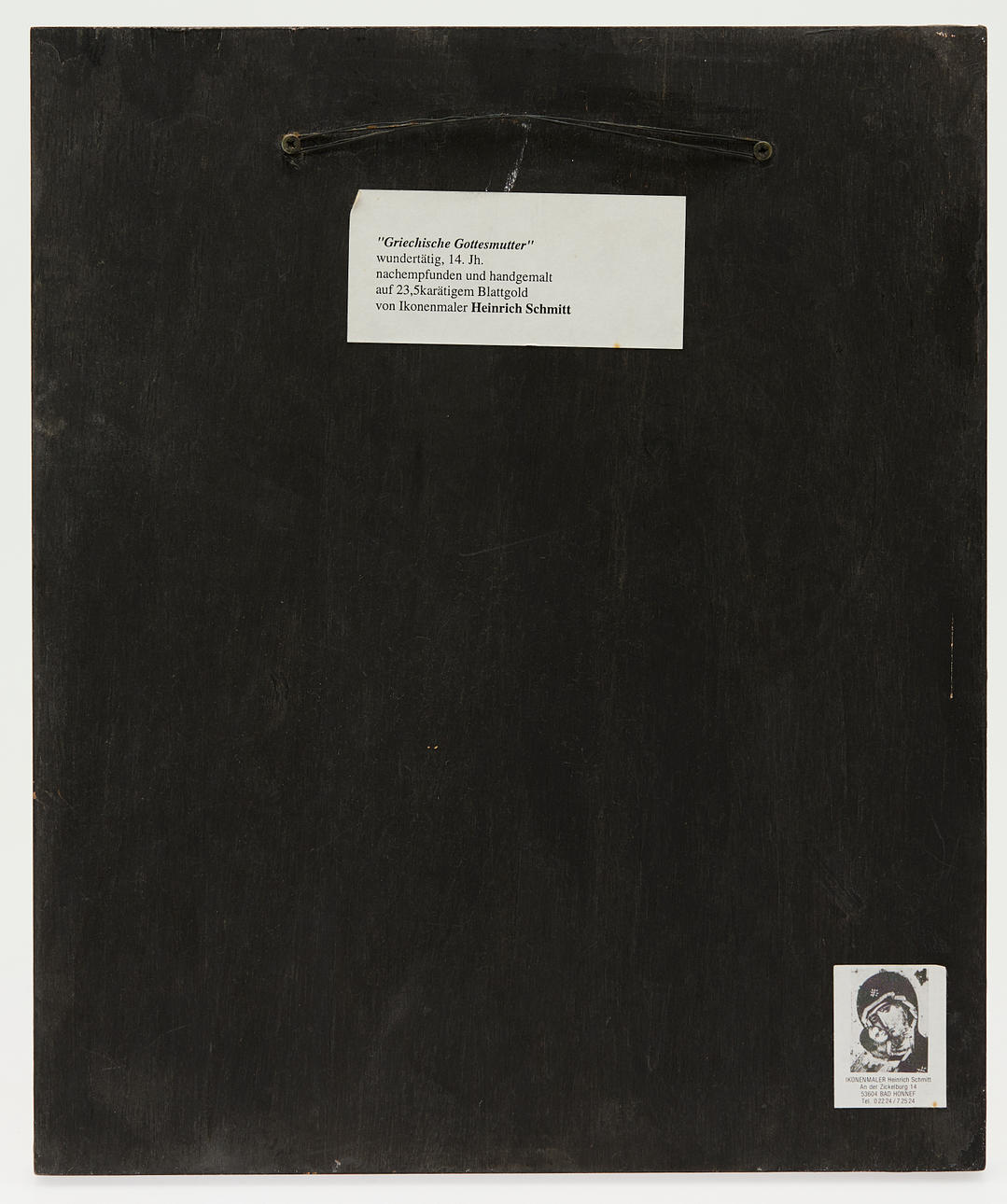 Heinrich Schmitt, Ikone / Heiligenbild, Muttergottes, Deutschland, Tempera auf Holz, blattvergoldet. Darstellung der Muttergottes anhand eines aus dem 14. Jahrhundert nachempfundenen Vorbilds, teilweise blattvergoldet, rückseitig mit Klebeetikett bezeichnet, 36x30cm.