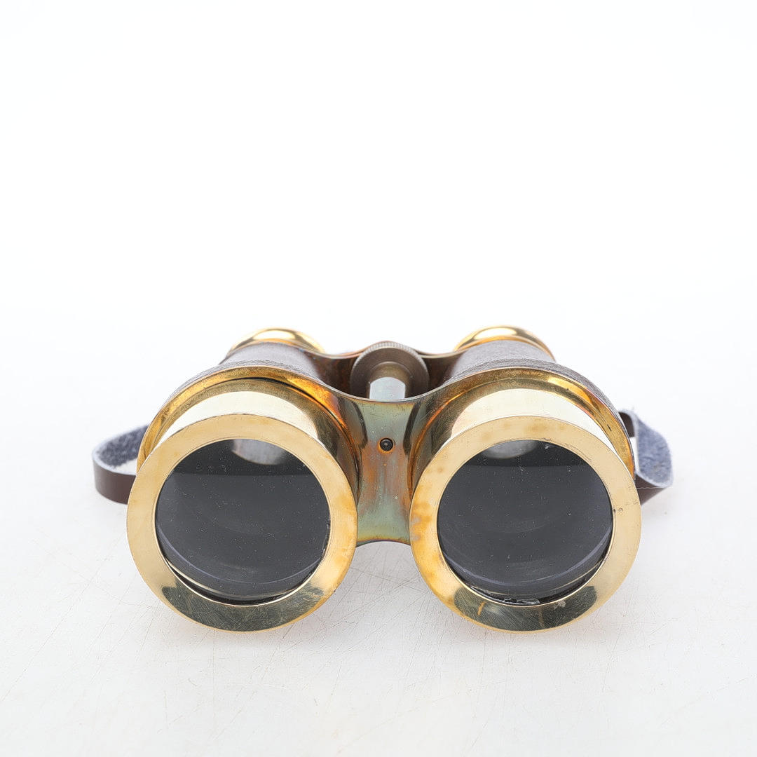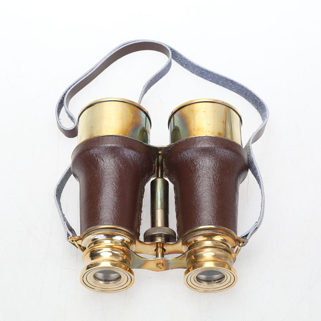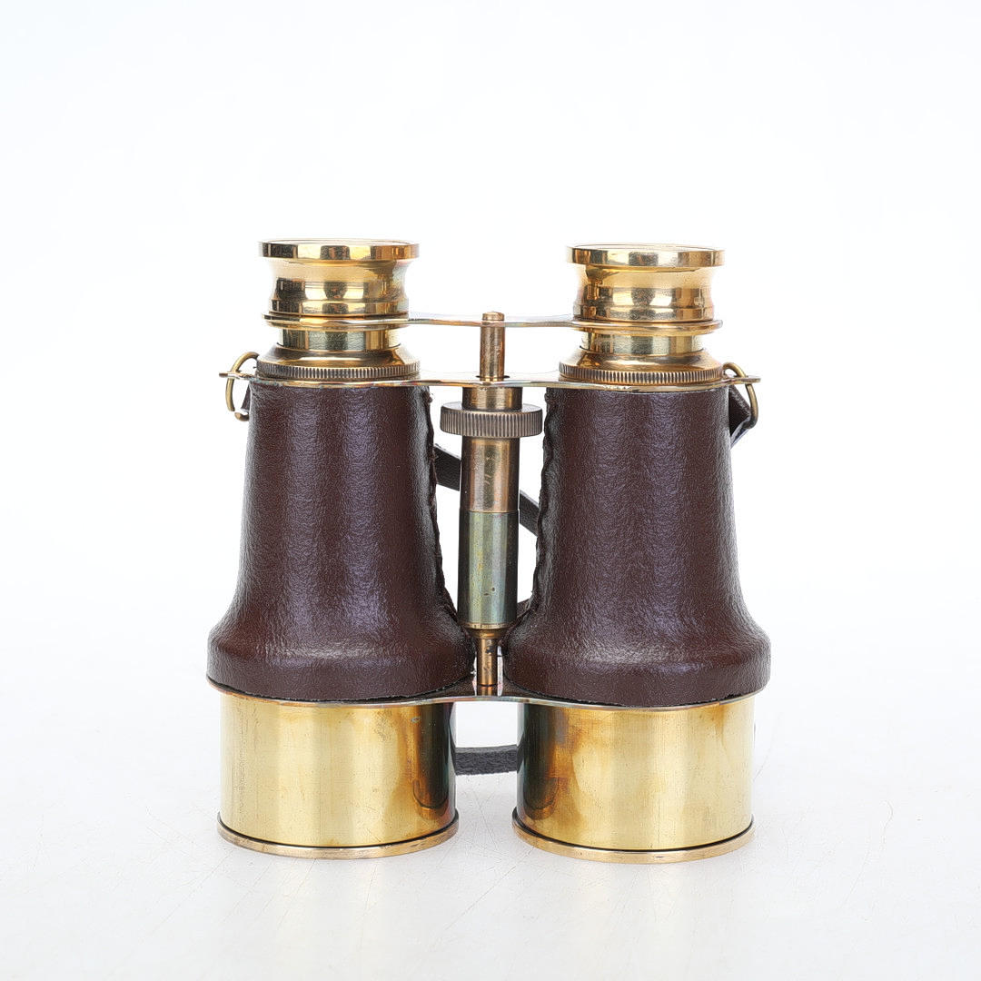 Ein Fernglas aus Messing mit Lederschuh und Lederriemen.