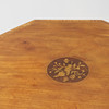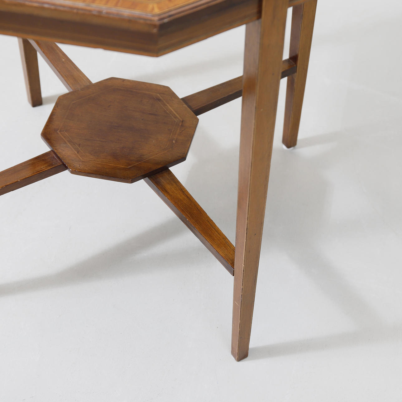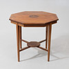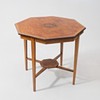 Achteckig. Furniert und mit Intarsiendekor. Gekoppelte Beinhaltung. Länge ca. 76 cm. Breite ca. 75 cm. Höhe ca. 69 cm.