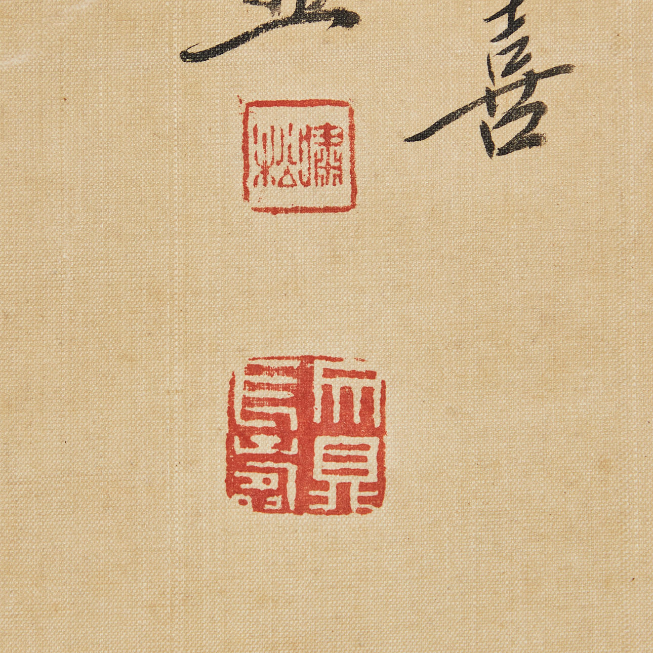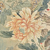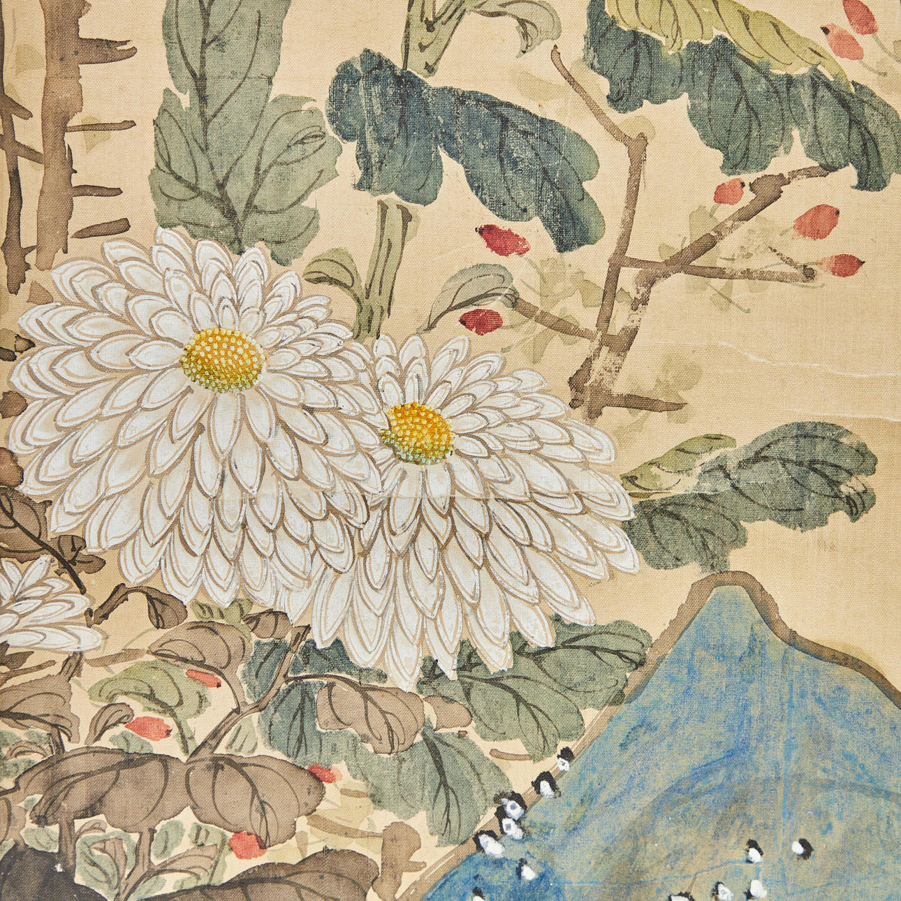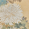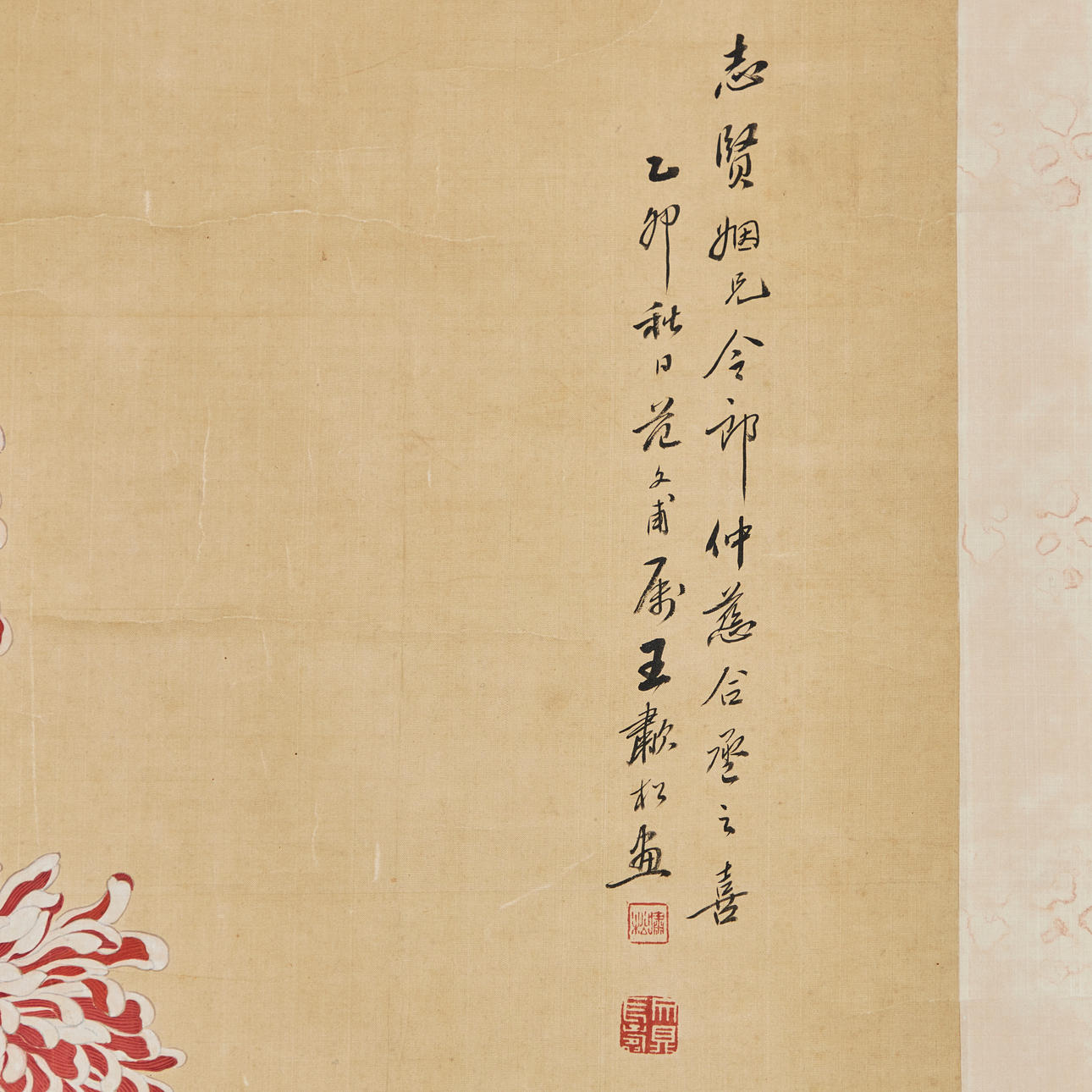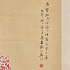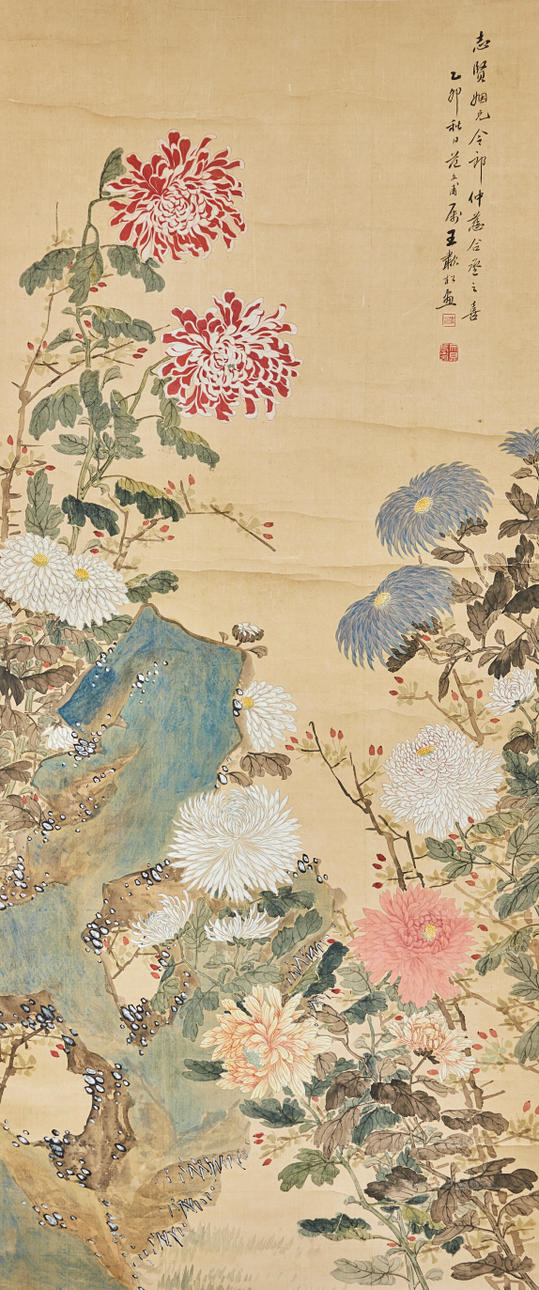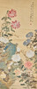Chinesisches Rollbild mit floraler Darstellung, farbig gefasst, in chinesischer Kalligraphie beschriftet und zweifach gesiegelt, ca. 151,5x64,5cm, als Rollbild auf festerem Papier mit Vorderseitenmontage aus Seide aufgezogen, mit Holzstab beschwert, ca. 227x75cm.