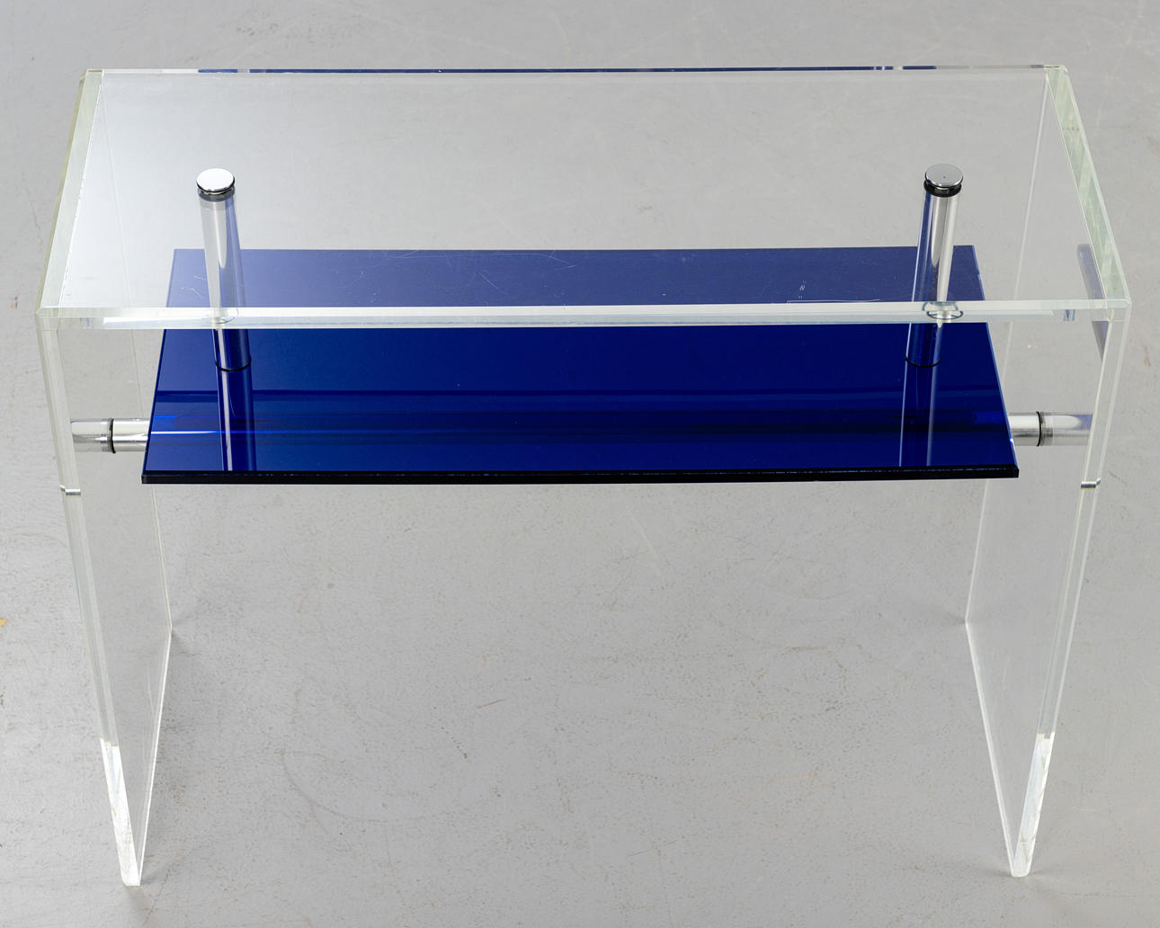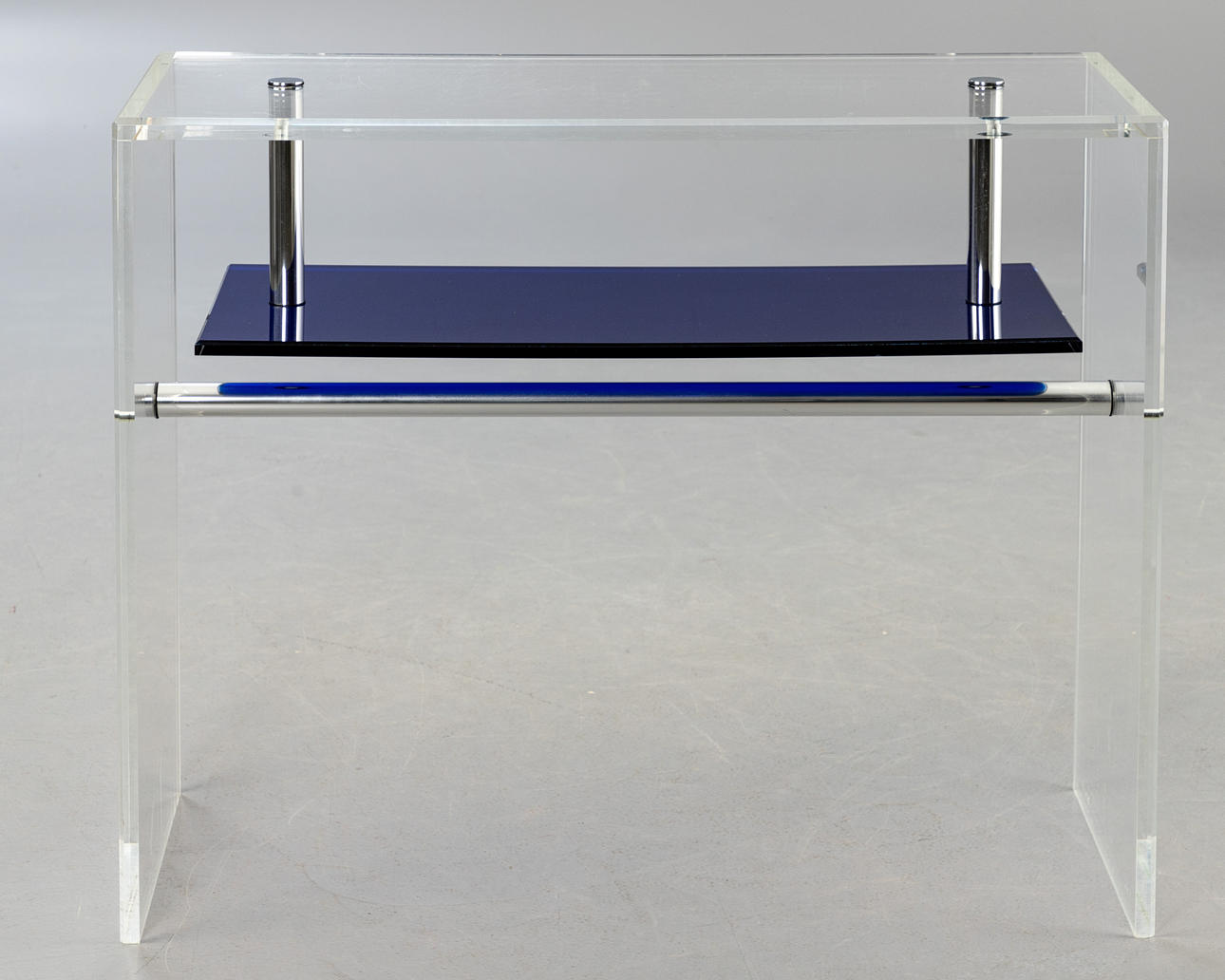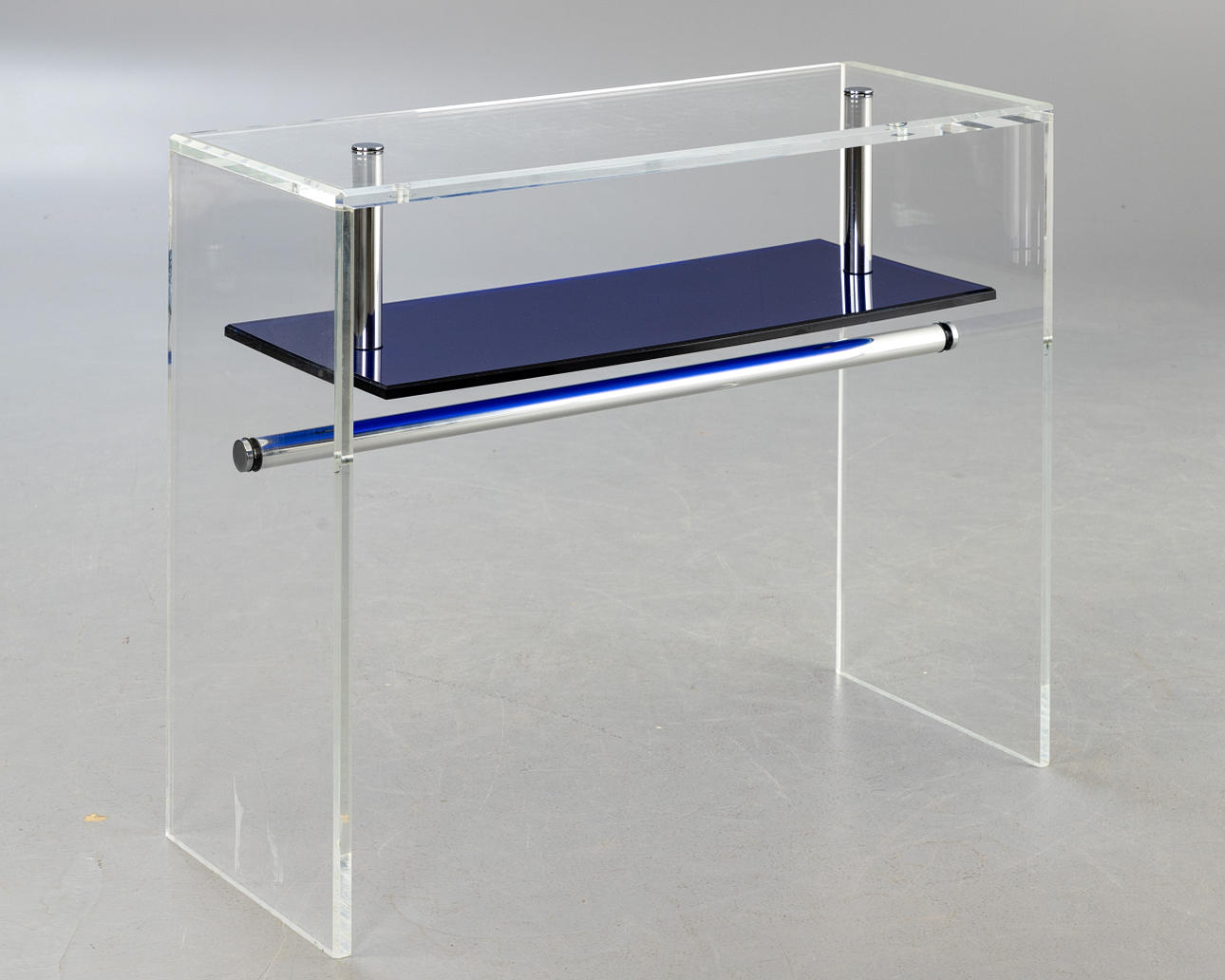 Konsole mit Zwischenboden aus blauem Acrylglas und Chromstäben, schwere Ausführung.