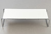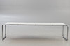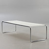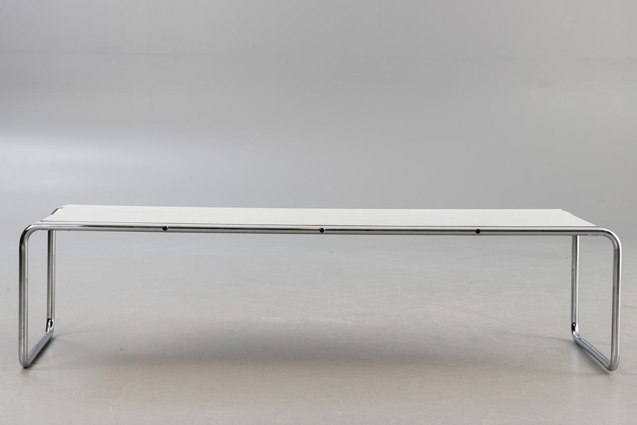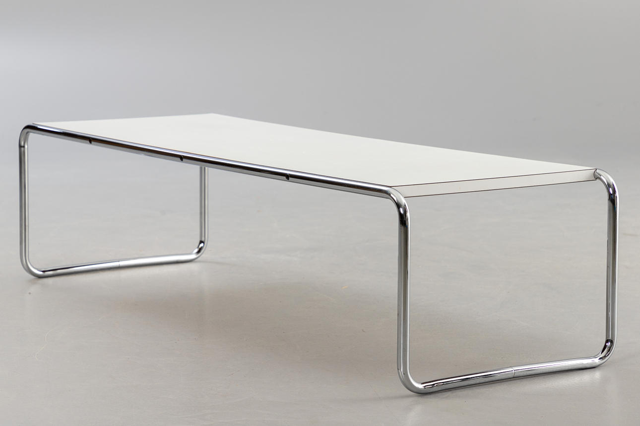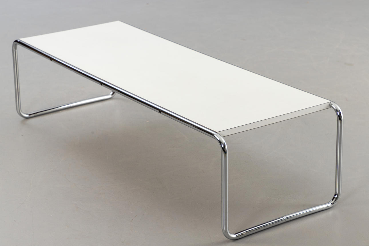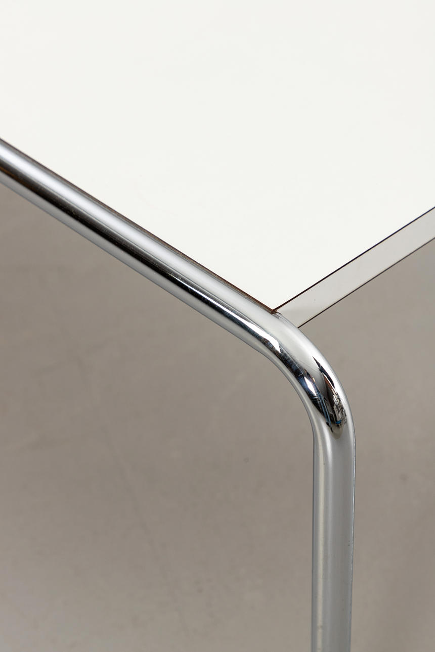 Couchtisch B20 'Laccio' von Marcel Breuer. Hersteller Gavina. Entwurf: 1925. Weiße Tischplatte aus Kunststofflaminat auf einem verchromtem Rundstahlgestell. Nicht bezeichnet.