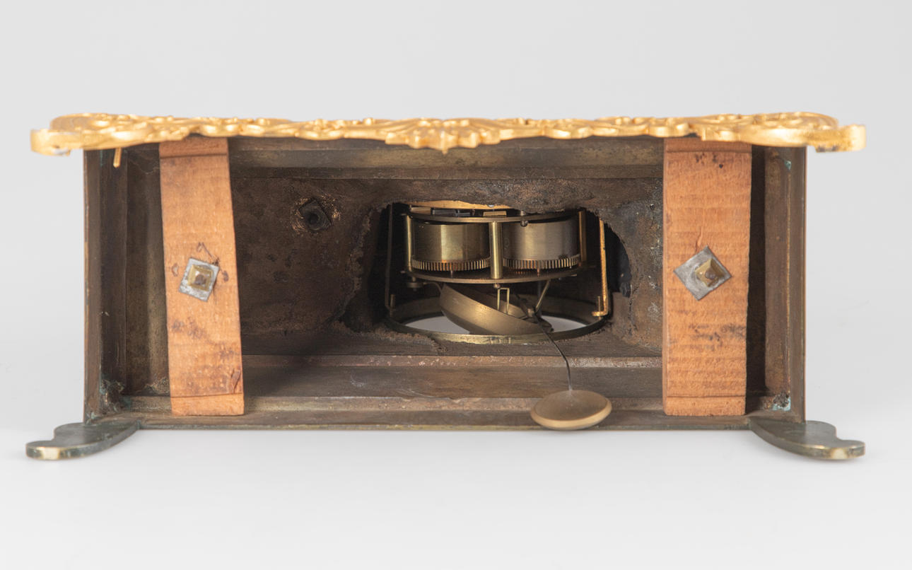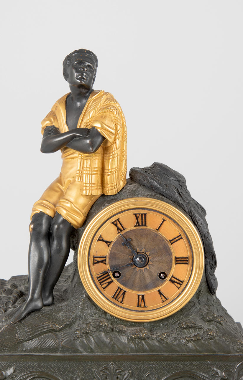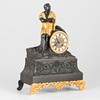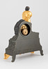 Hoher, konkav abgesetzter Sockel, dreiseitiger bewegter Akanthusblattfries im Relief, mit vorgesetzter ornamentiert, durchbrochen gegossener Blende. Auf Natursockel das runde Uhrengehäuse. Darauf sitzend eine sitzende männliche Figur. Aufgesetzte römische Ziffern auf glattem Ring. Guillochiertes Zifferblatt. Mechanisches Pendelwerk mit Halbstundenschlag auf Glocke (Schlag durch einen kleinen Abstand nicht möglich). HxBxT: ca. 35,5 x 27 x 11 cm. Schlüssel fehlt.
