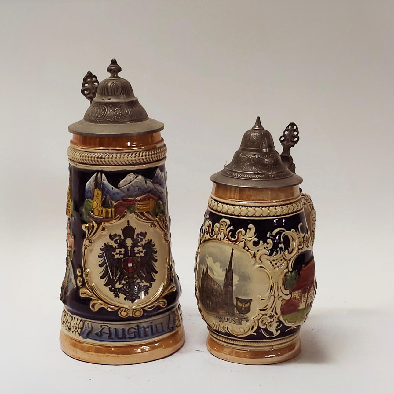 VIER ÖSTERREICHISCH-DEUTSCHE Krüge MIT ZINNDECKEL.