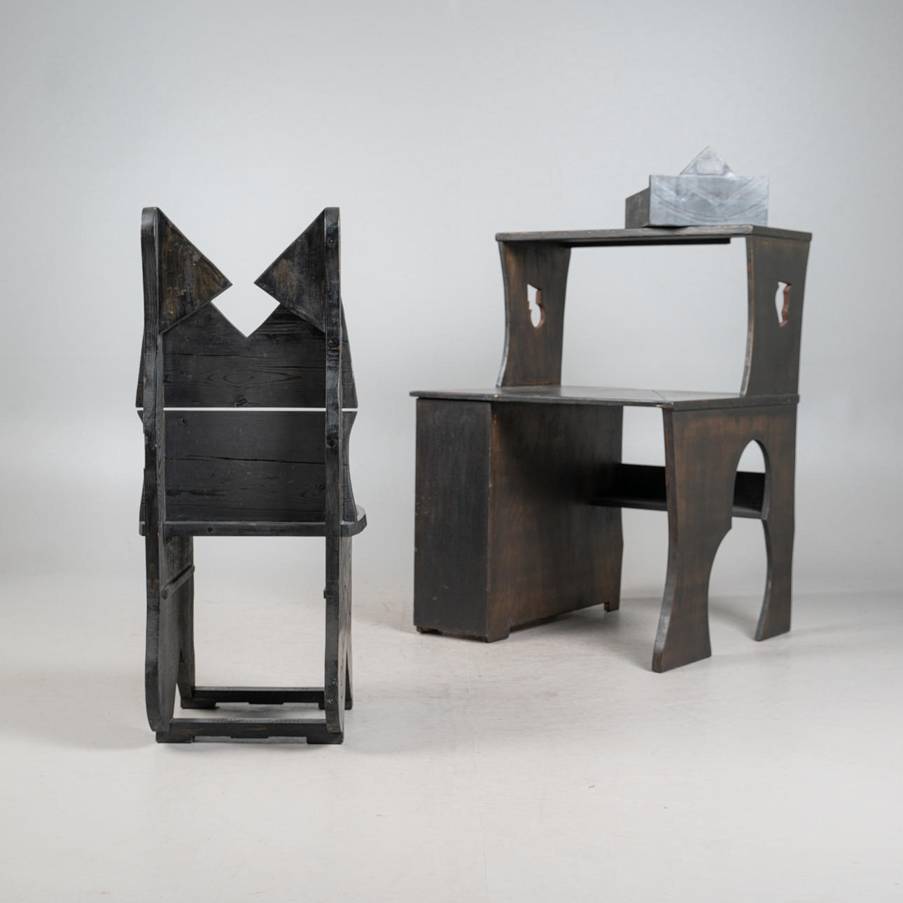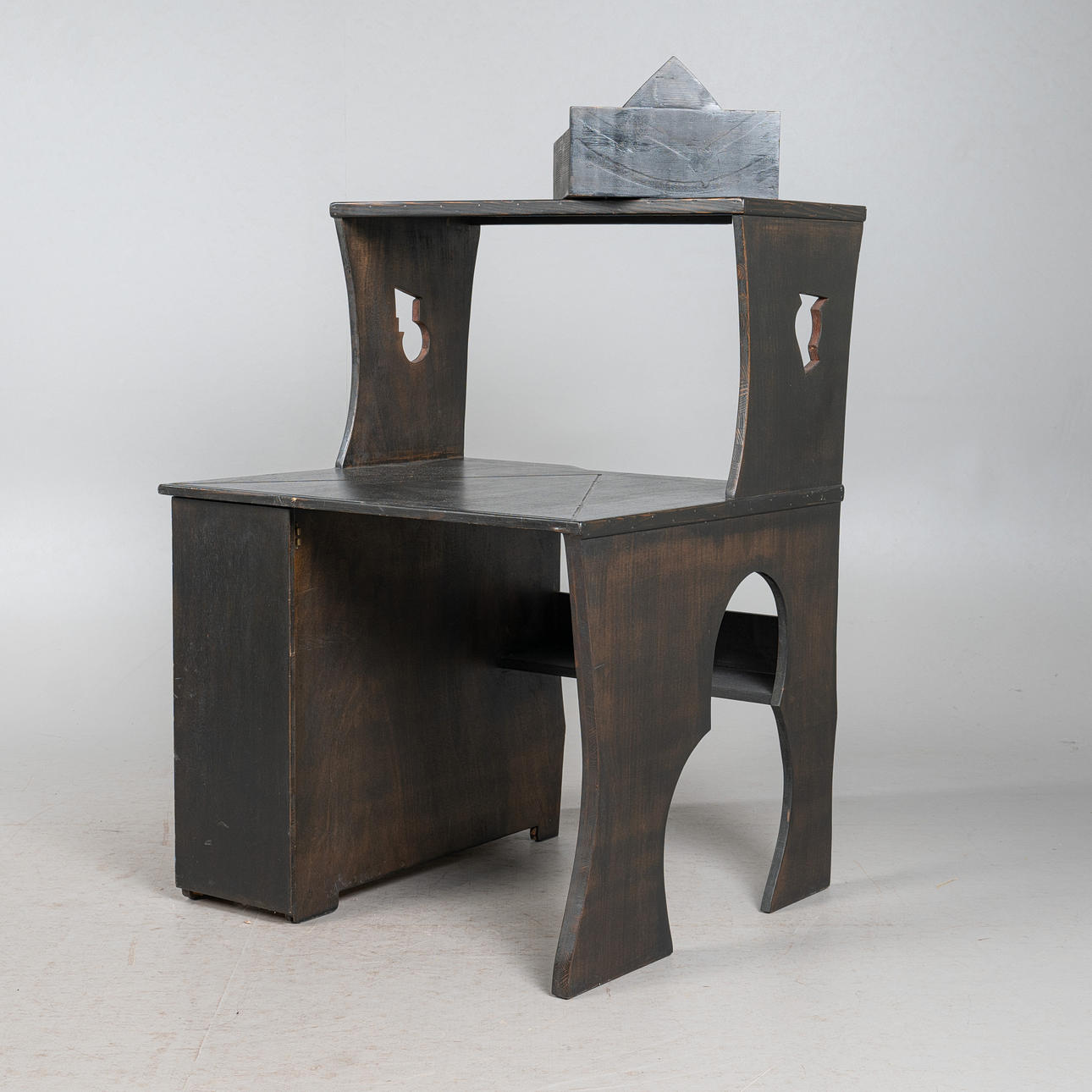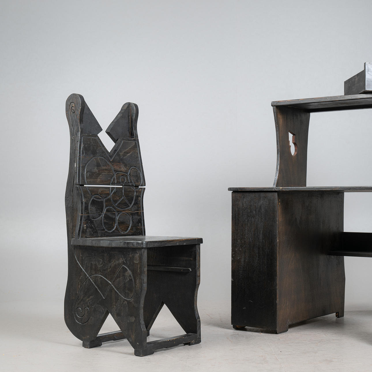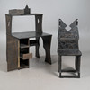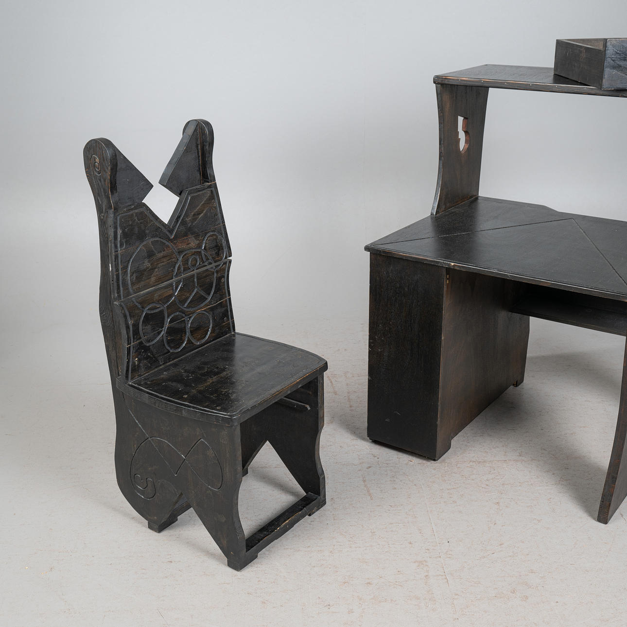 - einem passenden Schreibtischstuhl mit eingebauter Schublade unterhalb der Sitzfläche, Frontseite mit einem mittigen, überstehenden Dreieck versehen, beides aus schwarz lasiertem Eichenholz mit geometrischen Verzierungen, Schreibtisch linksseitig mit einem reckeckigen Emblem mit grünen Farbakzenten ausgestattet, Tisch: H.112cm, Schreibfläche H.71cm, B.85cm, T.40cm, Stuhl: H.115cm, Sitzhöhe: 48cm, B.48cm, T.50cm. (2).