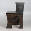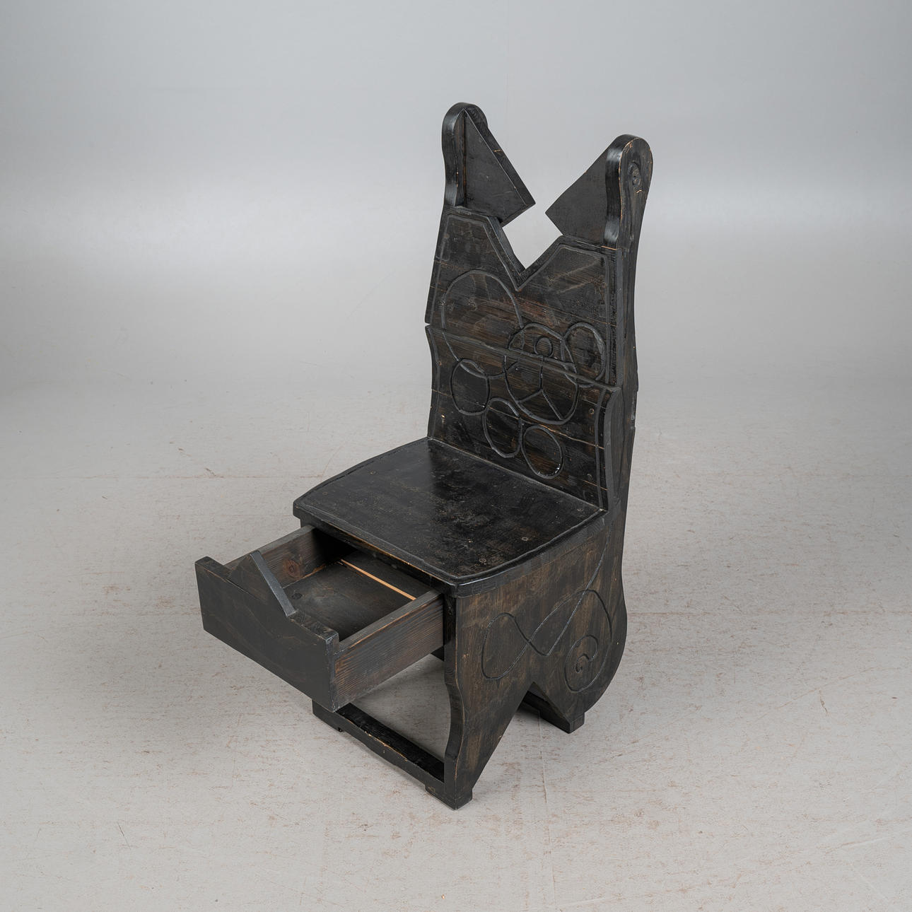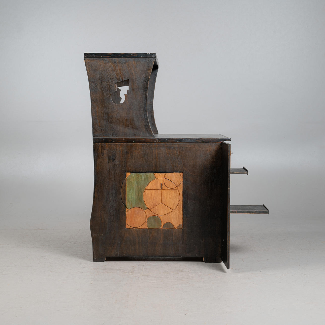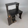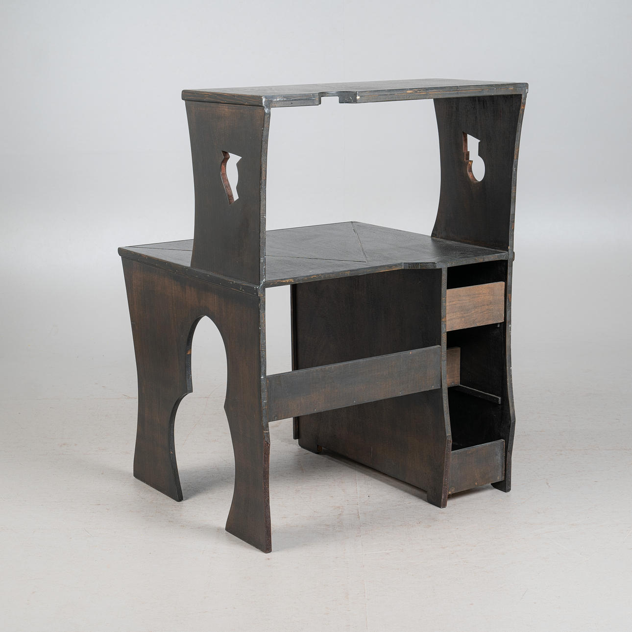 - einem passenden Schreibtischstuhl mit eingebauter Schublade unterhalb der Sitzfläche, Frontseite mit einem mittigen, überstehenden Dreieck versehen, beides aus schwarz lasiertem Eichenholz mit geometrischen Verzierungen, Schreibtisch linksseitig mit einem reckeckigen Emblem mit grünen Farbakzenten ausgestattet, Tisch: H.112cm, Schreibfläche H.71cm, B.85cm, T.40cm, Stuhl: H.115cm, Sitzhöhe: 48cm, B.48cm, T.50cm. (2).