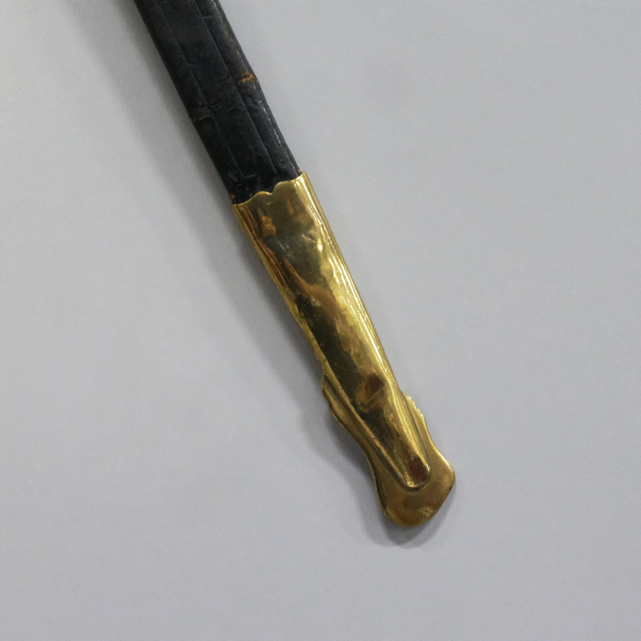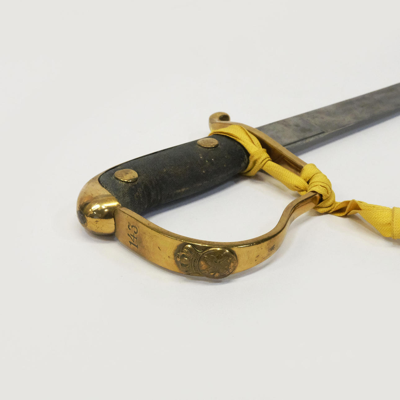 Die Klinge trägt den Stempel Import. Der Griff ist mit Malmö Polisd und 143 gekennzeichnet. Handschützer mit Polizeiwaffen. Im Lederetui mit Schließfunktion. Gelbes Portepe.