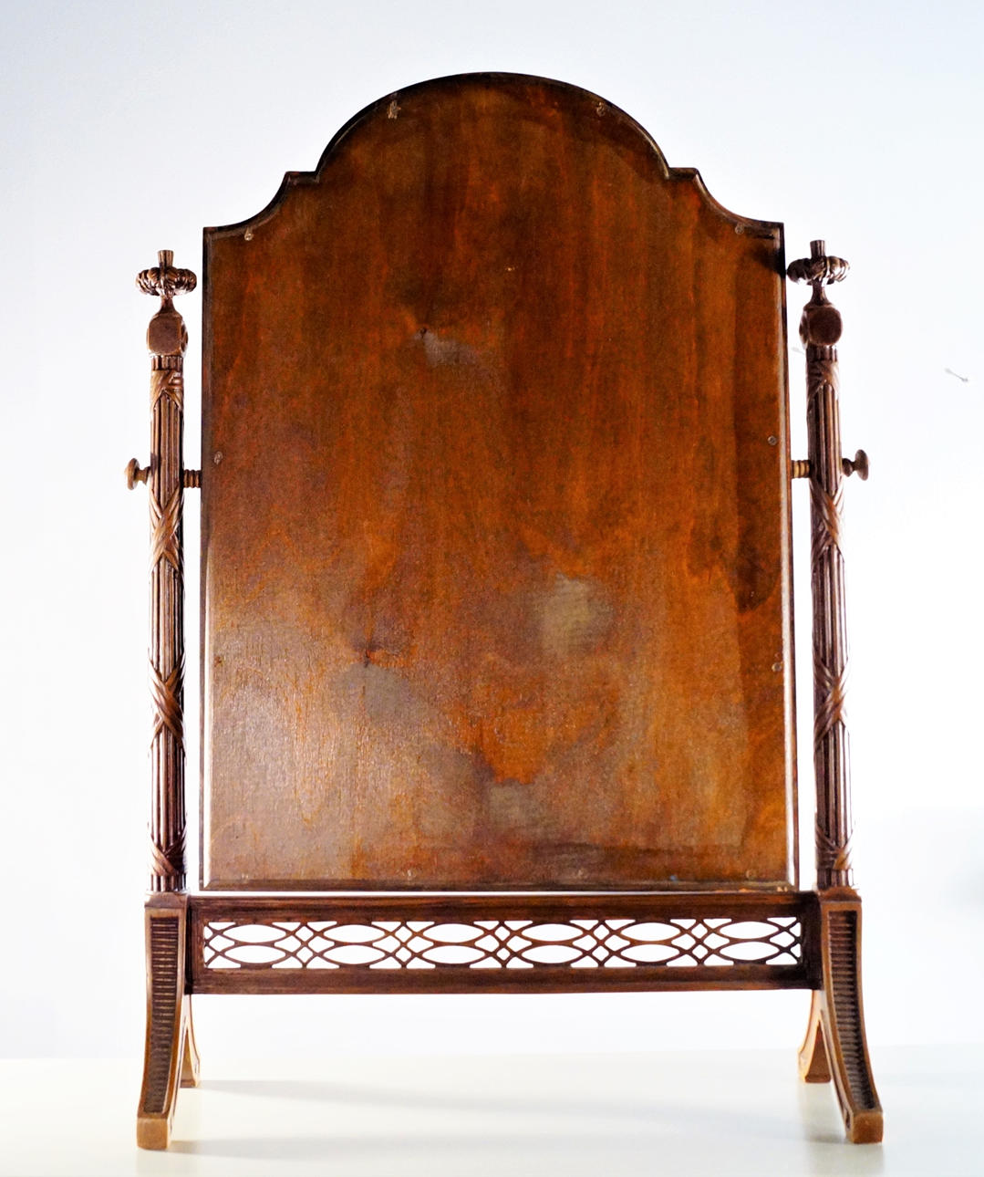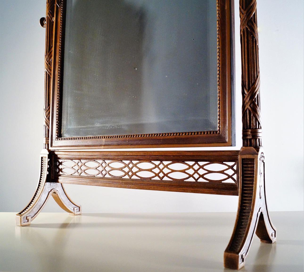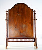 Im Rahmen neigbar. Spiegel mit facettiertem Glas. Gesamthöhe 74 cm, Breite 53 cm (mit Knöpfen), Tiefe der Beine 16,5 cm.