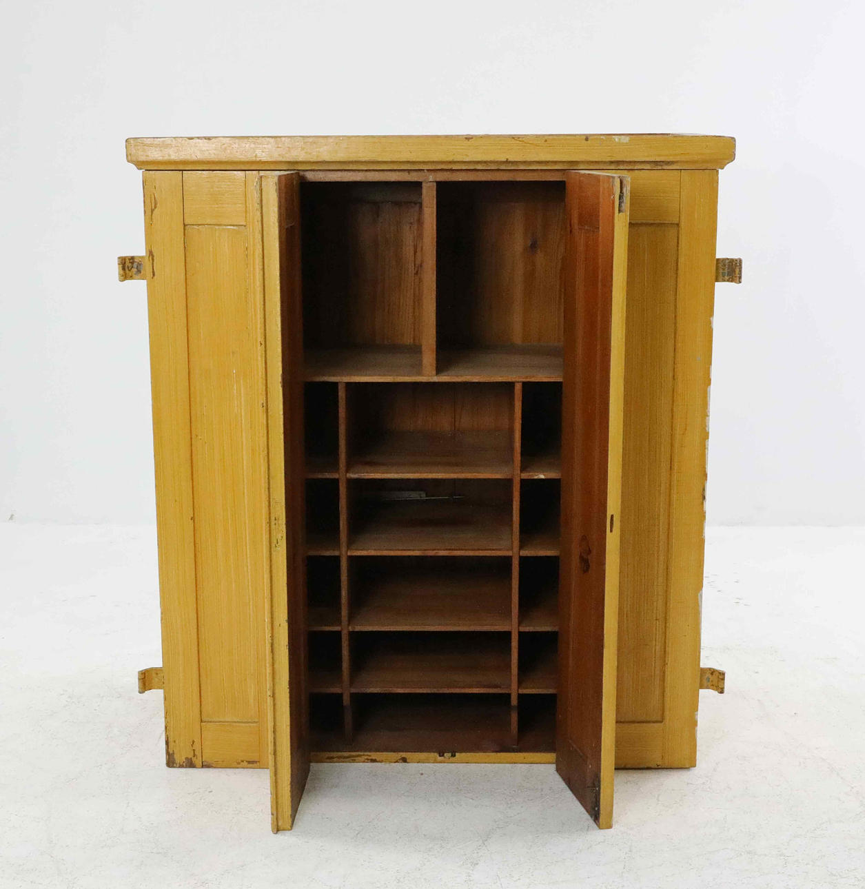 Briefkasten mit Fächern, 15 kleinere, 2 größere Fächer. Faltschranktüren mit Scharnieren. Bemalte gelbe Adermalerei.