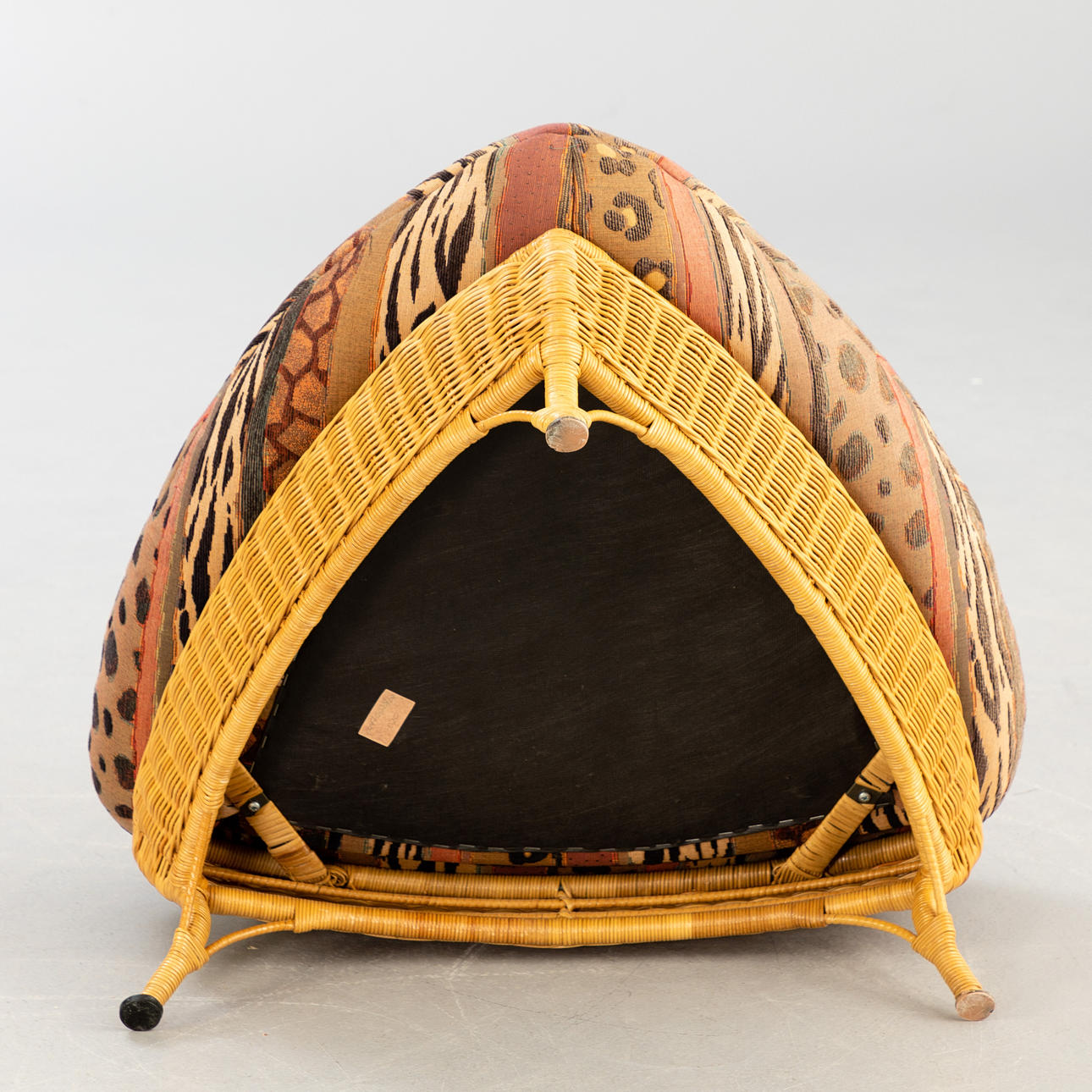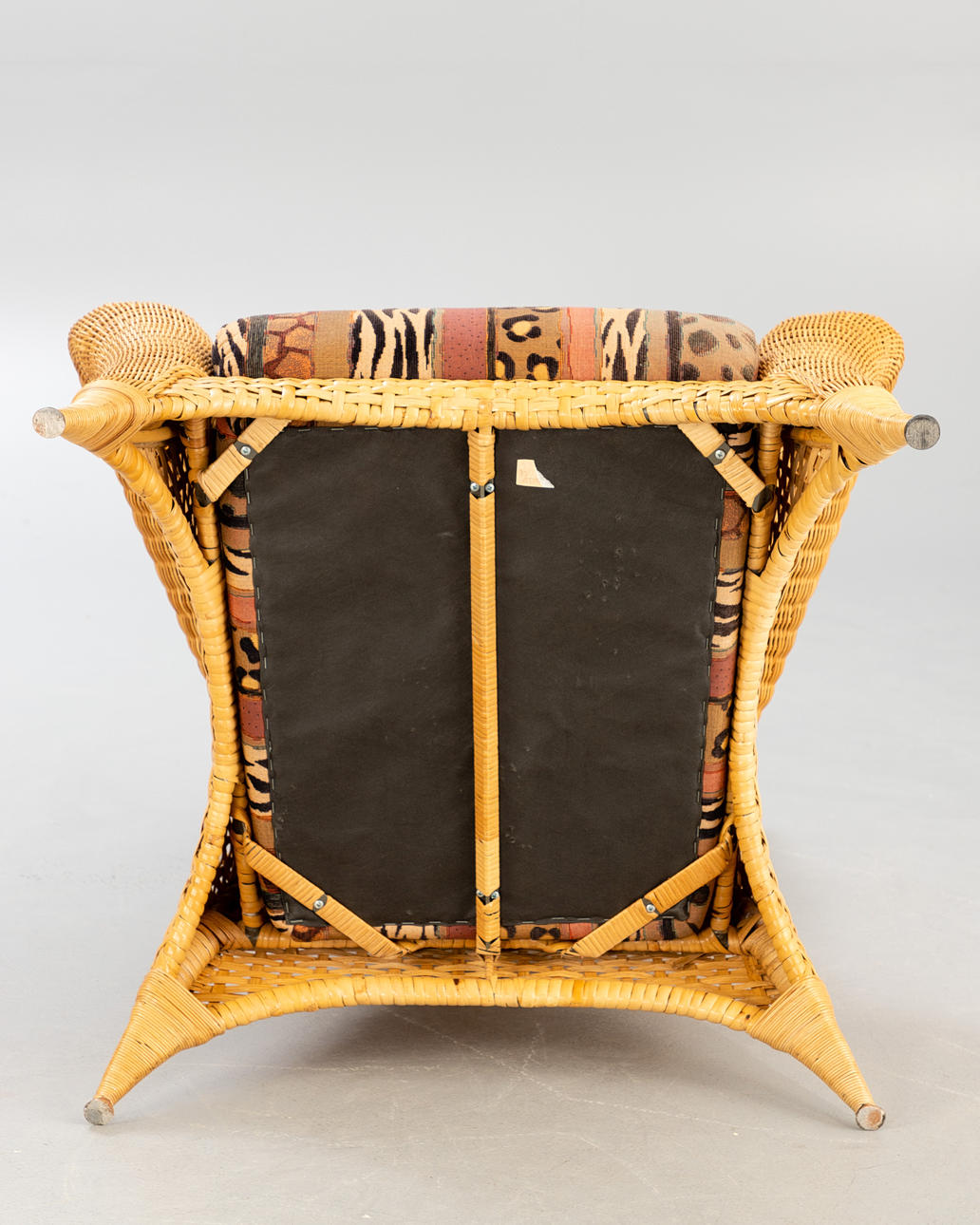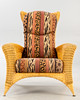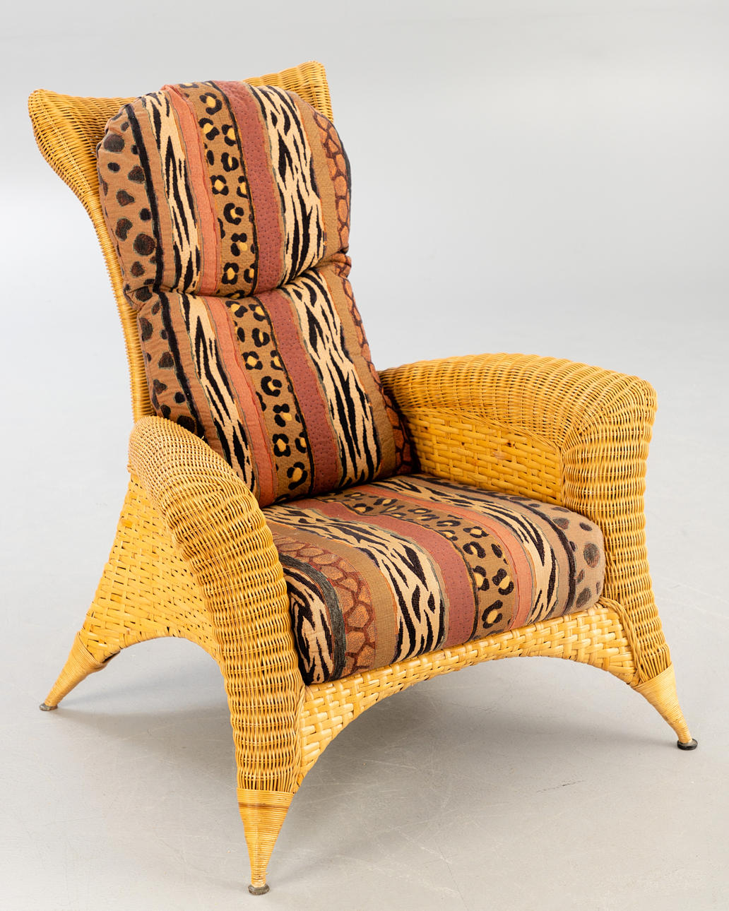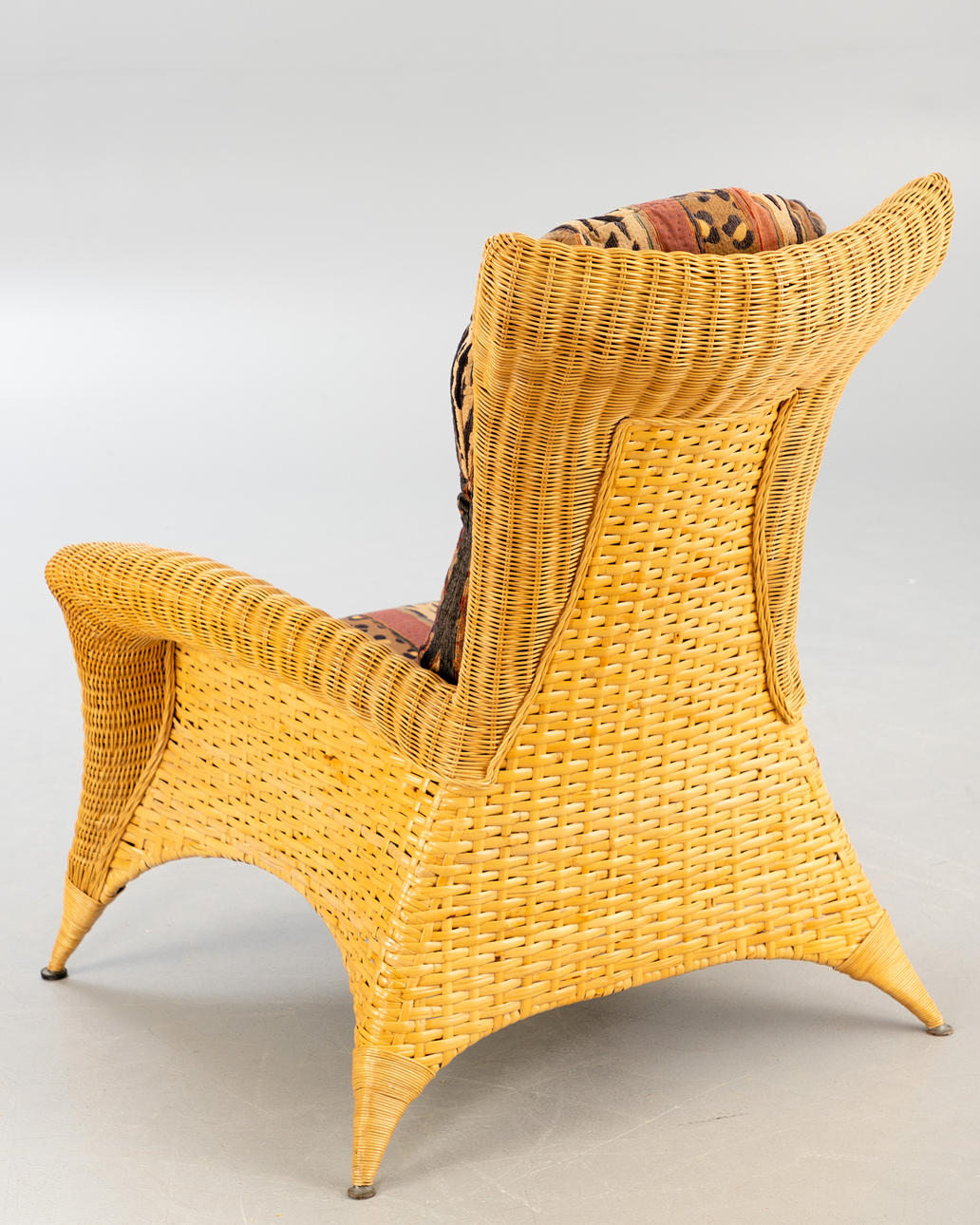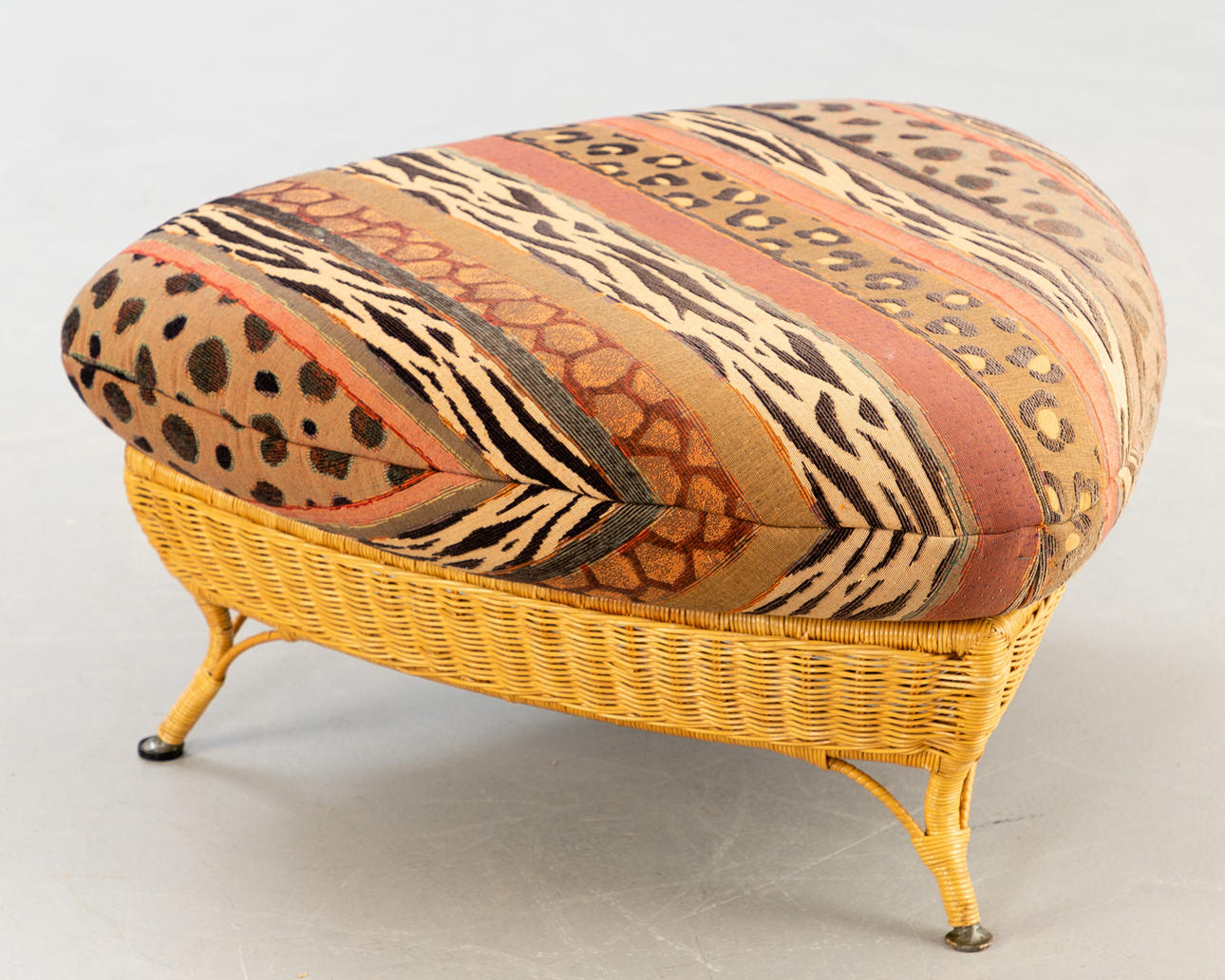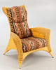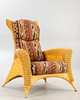 Rattan Korbsessel mit Hocker von Rolf Benz. Sessel und Hocker aus Rattan, aufgepolstert und mit gemustertem Stoff bezogen.